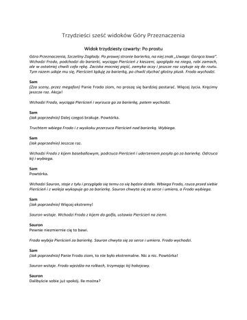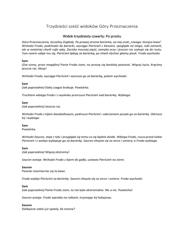 Trzydzieści sześć widoków Góry Przeznaczenia Widok trzydziesty czwarty: Po prostu Góra Przeznaczenia, Szczeliny Zagłady. Po prawej stronie barierka, na niej znak „Uwaga: Gorąca lawa”. Wchodzi Frodo, podchodzi do barierki, wyciąga Pierścień z kieszeni, spogląda na niego, robi zamach, ale w ostatniej chwili cofa rękę. Zaciska mocniej pięść, zamyka oczy i jeszcze raz szykuje się do rzutu. Tym razem udaje mu się, Pierścień ląduję za barierką, po chwili słychać głośny plusk. Frodo wychodzi. Sam (Zza sceny, przez megafon) Panie Frodo ziom, no proszę się bardziej postarać. Więcej życia. Kręcimy jeszcze raz. Akcja! Wchodzi Frodo, wyciąga Pierścień i wyrzuca go za barierkę, potem wychodzi. Sam (Jak poprzednio) Dalej czegoś brakuje. Powtórka. Truchtem wbiega Frodo i z wyskoku przerzuca Pierścień nad barierką. Wybiega. Sam (Jak poprzednio) Jeszcze raz. Wchodzi Frodo z kijem baseballowym, podrzuca Pierścień i uderzeniem posyła go za barierkę. Odrzuca kij i wybiega. Sam Powtórka. Wchodzi Sauron, staje z tyłu i przygląda się temu co się będzie działo. Wbiega Frodo, rzuca przed siebie Pierścień i z woleja wykopuje go za barierkę. Sauron chwyta się za serce i umiera, a Frodo wybiega. Sam (Jak poprzednio) Więcej ekstremy! Sauron wstaje. Wchodzi Frodo z kijem do golfa, ustawia Pierścień na ziemi. Sauron Pewnie niezmiernie cię to bawi. Frodo wybija Pierścień za barierkę. Sauron chwyta się za serce i umiera. Frodo wychodzi. Sam (Jak poprzednio) Panie Frodo ziom, to nie było ekstremalne. Nic a nic. Powtórka! Sauron wstaje. Frodo wjeżdża na rolkach, trzymając kij hokejowy. Sauron Dalibyście sobie już spokój. Ile można? Frodo rzuca Pierścień przed siebie, podjeżdża do niego i posyła go uderzeniem kija za barierkę. Sauron chwyta się za serce i umiera. Frodo wyjeżdża. Sam (Jak wcześniej) Lepiej, ale można ekstremalniej Powtórka. Sauron zrywa się, staje na potencjalnej drodze Froda i niecierpliwie czeka. Frodo (Zza sceny) Trzy! Siedem! Dziewięć! Jeden! Sauron Nie tym razem. Frodo wbiega w kasku futbolisty, szarżuje na Saurona i powala go uderzeniem z bara. Dobiega do barierki i przerzuca za nią Pierścień. Sauron chwyta się za serce i umiera. Frodo wychodzi. Sam (Jak poprzednio) A teraz spróbujemy... (ciszej, bez megafonu) Co mówisz? Nie mamy już Pierścieni Jedynych? (Przez megafon) Dobra, klawo było, ale koniec na dziś. Wracamy do Shire!