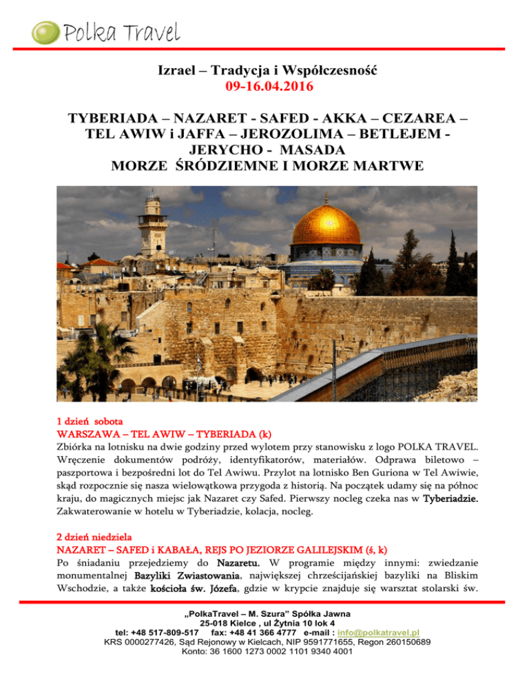 Izrael – Tradycja i Współczesność 09-16.04.2016 TYBERIADA – NAZARET - SAFED - AKKA – CEZAREA – TEL AWIW i JAFFA – JEROZOLIMA – BETLEJEM JERYCHO - MASADA MORZE ŚRÓDZIEMNE I MORZE MARTWE 1 dzień sobota WARSZAWA – TEL AWIW – TYBERIADA (k) Zbiórka na lotnisku na dwie godziny przed wylotem przy stanowisku z logo POLKA TRAVEL. Wręczenie dokumentów podróży, identyfikatorów, materiałów. Odprawa biletowo – paszportowa i bezpośredni lot do Tel Awiwu. Przylot na lotnisko Ben Guriona w Tel Awiwie, skąd rozpocznie się nasza wielowątkowa przygoda z historią. Na początek udamy się na północ kraju, do magicznych miejsc jak Nazaret czy Safed. Pierwszy nocleg czeka nas w Tyberiadzie. Zakwaterowanie w hotelu w Tyberiadzie, kolacja, nocleg. 2 dzień niedziela NAZARET – SAFED i KABAŁA, REJS PO JEZIORZE GALILEJSKIM (ś, k) Po śniadaniu przejedziemy do Nazaretu. W programie między innymi: zwiedzanie monumentalnej Bazyliki Zwiastowania, największej chrześcijańskiej bazyliki na Bliskim Wschodzie, a także kościoła św. Józefa, gdzie w krypcie znajduje się warsztat stolarski św. „PolkaTravel – M. Szura” Spółka Jawna 25-018 Kielce , ul Żytnia 10 lok 4 tel: +48 517-809-517 fax: +48 41 366 4777 e-mail : [email protected] KRS 0000277426, Sąd Rejonowy w Kielcach, NIP 9591771655, Regon 260150689 Konto: 36 1600 1273 0002 1101 9340 4001 Józefa. Następnie udamy się do Safed, miasta uznanego za centrum żydowskiego mistycyzmu, kabały. Jest to najwyżej położone miasto w kraju, z malowniczymi wąskimi uliczkami oplatającymi wzgórza, na którym jest posadowione. Pełno tu kramików i warsztatów rzemieślniczych oraz świetnych galerii sztuki. Z Safed udamy się na Górę Błogosławieństw, a następnie w rejs po jeziorze Galilejskim. Opcjonalnie będzie możliwość skosztowania słynnej „ryby Świętego Piotra”. Wieczorem powrót do hotelu w Tyberiadzie na kolację i nocleg. 3 dzień poniedziałek AKKA – CEZAREA, TEL AWIW i zabytkowa JAFFA (ś) Po śniadaniu udajemy się na południe kraju jadąc trasą prowadzącą wzdłuż wybrzeża Morza Śródziemnego. Zatrzymamy się na wysokości Akki, jednego z najstarszych na świecie miast portowych. Śliczna zabytkowa starówka jest pod patronatem UNESCO. Tutaj także jest unikalne sanktuarium bahaizmu, religii wyznawanej przez ok. 6 milionów ludzi na świecie, zabytkowe sanktuarium także zostało ujęte na liście religijnego dziedzictwa UNESCO. Zobaczymy m.in. Górne Ogrody. Następnie przejedziemy do Cezarei, miasta słynącego z pozostałości porzymskich, w tym amfiteatru a także akweduktu, hipodromu, forum romanum. Późnym popołudniem przejazd do Tel Awiwu. Krótkie zwiedzanie starej części „PolkaTravel – M. Szura” Spółka Jawna 25-018 Kielce , ul Żytnia 10 lok 4 tel: +48 517-809-517 fax: +48 41 366 4777 e-mail : [email protected] KRS 0000277426, Sąd Rejonowy w Kielcach, NIP 9591771655, Regon 260150689 Konto: 36 1600 1273 0002 1101 9340 4001 miasta, Jaffy. Przejście uliczkami, Ścieżką Horoskopu. Zakwaterowanie w hotelu w Tel Awiwie, nad Morzem Śródziemnym. Wieczorem możliwość zorganizowania kolacji z owocami morza w nadmorskiej restauracji (dopłata 25 USD/os) albo wyjście indywidualne. Pilot jest do dyspozycji grupy i zgodnie z życzeniem zorganizuje wieczór. 4 dzień środa MORZE SRÓDZIEMNE i JEROZOLIMA inaczej (ś, k) Po śniadaniu, do południa, czas wolny na spokojne delektowanie się morzem, spacery, ew. plażowanie, następnie przejedziemy do Jerozolimy, aby rozpocząć kilkudniowe zwiedzanie tego wyjątkowego miasta. Naszą wiedzę pogłębi wizyta w Muzeum Izraela gdzie znajduje się makieta Jerozolimy z czasów II Świątyni oraz Sanktuarium Księgi. Tutaj także przechowywane są słynne tajemnicze zwoje z Qumran, znalezione na pustyni judzkiej w 1948 roku. Następnie udamy się do centrum, gdzie między innymi będziemy mogli w niekonwencjonalny sposób zwiedzić miasto spacerując podziemnymi tunelami. 488 metrów ogromnych kamieni formuje pozostałości fundamentów Beit HaMikdasz, a przejście wyryte w skale wzdłuż nich wynosi 322 metry. Są to podziemne tunele - dzisiaj ponad nimi toczy się codzienne życie tętniącymi uliczkami, w domach dzielnicy muzułmańskiej i na straganach kolorowego rynku Starego Miasta. Do podziemi wejdziemy nieopodal Ściany Płaczu, zwanej także Murem Zachodnim, najważniejszego miejsca dla wszystkich Żydów. Są to pozostałości drugiej świątyni wybudowanej przez Heroda Wielkiego. Obszar pod Ścianą służy jako olbrzymia synagoga pod gołym niebem. W tle widać błękitno-złotą bryłę meczetu Al Aksa. Następnie przejazd na nocleg w Jerozolimie (łącznie 4 noclegi). Kolacja i nocleg. 5 dzień czwartek BETLEJEM I YAD VASHEM (ś, k) Po śniadaniu udamy się na zwiedzanie Betlejem. Zwiedzimy nastrojową Bazylikę Narodzenia Pańskiego wybudowaną ponad Grotą Narodzenia. Do Groty Narodzenia przylega Grota Żłóbka gdzie pasterze oddali hołd małemu Jezusowi. Do Bazyliki przylegają klasztory i kościoły ormiańskie, grecko prawosławne i katolickie, a wśród nich m.in. kościół św. Katarzyny. Zobaczymy także położoną nieopodal Grotę Mleczną. Specyficzne ukształtowanie terenu powoduje, że w masywie gór utworzyło się wiele jaskiń, w których wg przekazów mieszkali pasterze. Po południu udamy się do Yad Vashem, Muzeum Historii Holocaustu, niezwykłego pomnika, którym uczczono pamięć sześciu milionów zamordowanych Żydów. To słynne miejsce przyznające tytuły „Sprawiedliwych wśród Narodów Świata”. Wśród oznaczonych 20 tys. „Sprawiedliwych” jest aż około 6 tys. Polaków. Kolacja i nocleg w Jerozolimie. Wieczorem specjalnie dla Państwa wyjazd na spektakularne poznanie Jerozolimy Nocą. Pospacerujemy po zabytkowym centrum i zatrzymamy się w panoramicznych punktach miasta (m.in.: Kneset, Mea Sharim, Starówka, Złota Menora i Ściana Płaczu) „PolkaTravel – M. Szura”