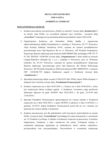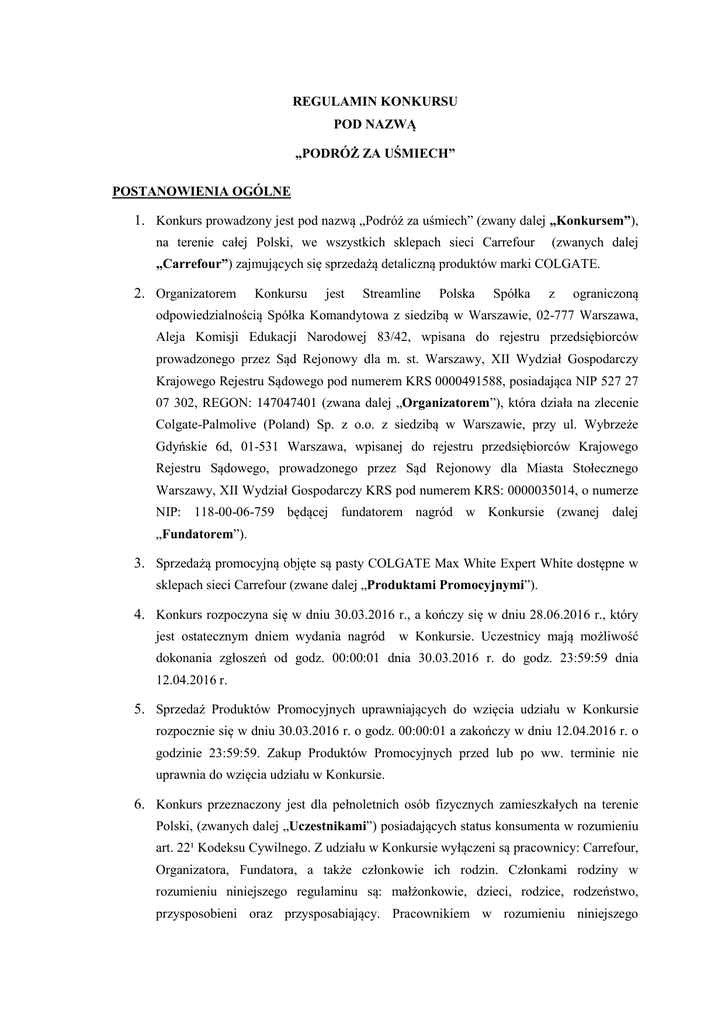 REGULAMIN KONKURSU POD NAZWĄ „PODRÓŻ ZA UŚMIECH” POSTANOWIENIA OGÓLNE 1. Konkurs prowadzony jest pod nazwą „Podróż za uśmiech” (zwany dalej „Konkursem”), na terenie całej Polski, we wszystkich sklepach sieci Carrefour (zwanych dalej „Carrefour”) zajmujących się sprzedażą detaliczną produktów marki COLGATE. 2. Organizatorem Konkursu jest Streamline Polska Spółka z ograniczoną odpowiedzialnością Spółka Komandytowa z siedzibą w Warszawie, 02-777 Warszawa, Aleja Komisji Edukacji Narodowej 83/42, wpisana do rejestru przedsiębiorców prowadzonego przez Sąd Rejonowy dla m. st. Warszawy, XII Wydział Gospodarczy Krajowego Rejestru Sądowego pod numerem KRS 0000491588, posiadająca NIP 527 27 07 302, REGON: 147047401 (zwana dalej „Organizatorem”), która działa na zlecenie Colgate-Palmolive (Poland) Sp. z o.o. z siedzibą w Warszawie, przy ul. Wybrzeże Gdyńskie 6d, 01-531 Warszawa, wpisanej do rejestru przedsiębiorców Krajowego Rejestru Sądowego, prowadzonego przez Sąd Rejonowy dla Miasta Stołecznego Warszawy, XII Wydział Gospodarczy KRS pod numerem KRS: 0000035014, o numerze NIP: 118-00-06-759 będącej fundatorem nagród w Konkursie (zwanej dalej „Fundatorem”). 3. Sprzedażą promocyjną objęte są pasty COLGATE Max White Expert White dostępne w sklepach sieci Carrefour (zwane dalej „Produktami Promocyjnymi”). 4. Konkurs rozpoczyna się w dniu 30.03.2016 r., a kończy się w dniu 28.06.2016 r., który jest ostatecznym dniem wydania nagród w Konkursie. Uczestnicy mają możliwość dokonania zgłoszeń od godz. 00:00:01 dnia 30.03.2016 r. do godz. 23:59:59 dnia 12.04.2016 r. 5. Sprzedaż Produktów Promocyjnych uprawniających do wzięcia udziału w Konkursie rozpocznie się w dniu 30.03.2016 r. o godz. 00:00:01 a zakończy w dniu 12.04.2016 r. o godzinie 23:59:59. Zakup Produktów Promocyjnych przed lub po ww. terminie nie uprawnia do wzięcia udziału w Konkursie. 6. Konkurs przeznaczony jest dla pełnoletnich osób fizycznych zamieszkałych na terenie Polski, (zwanych dalej „Uczestnikami”) posiadających status konsumenta w rozumieniu art. 22¹ Kodeksu Cywilnego. Z udziału w Konkursie wyłączeni są pracownicy: Carrefour, Organizatora, Fundatora, a także członkowie ich rodzin. Członkami rodziny w rozumieniu niniejszego regulaminu są: małżonkowie, dzieci, rodzice, rodzeństwo, przysposobieni oraz przysposabiający. Pracownikiem w rozumieniu niniejszego regulaminu jest zarówno osoba zatrudniona na podstawie umowy o pracę jak i osoba współpracująca na podstawie umowy cywilnoprawnej (w szczególności na podstawie umowy o dzieło, umowy zlecenia). Organizator zwolniony jest z pobierania oświadczeń w tym zakresie. ZASADY PROWADZENIA KONKURSU 7. W celu wzięcia udziału w Konkursie Uczestnik powinien w okresie od dnia 30.03.2016 r. do 12.04.2016 r. spełnić łącznie następujące warunki: a) dokonać zakupu przynajmniej jednego dowolnego Produktu Promocyjnego w Carrefour udokumentowanego na dowodzie zakupu (paragon fiskalny lub faktura VAT), b) wykonać zadanie konkursowe polegające na udzieleniu odpowiedzi na pytanie: „W podróży uśmiecham się, bo…?”, c) dokonać zgłoszenia swojego udziału w Konkursie (zwane dalej „Zgłoszeniem”), przesyłając wiadomość SMS na numer 4321 zawierającą w treści prefiks: „MAX”, numer dowodu zakupu oraz treść wykonanego zadania konkursowego (odpowiedzi) („MAX.numer dowodu zakupu.odpowiedź”). Poszczególne składowe SMS-a tj.: prefiks, numer dowodu zakupu oraz treść wykonanego zadania konkursowego muszą być oddzielone kropką. Treść SMS-a nie może zawierać polskich znaków: ą, ę, ć, ł, ń, ś, ó, ż, ź. Treść Zgłoszenia może być wpisana wielkimi lub małymi literami. Długość tekstu wiadomości SMS-a musi ograniczać się do 160 znaków (włącznie z prefiksem, numerem dowodu zakupu oraz ze spacjami oraz znakami interpunkcyjnymi). Naruszenie ograniczenia długości tekstu powoduje pominięcie części odpowiedzi, które zawiera dodatkowe znaki w dalszej procedurze Konkursu. Termin dokonywania Zgłoszeń mija w dniu 12.04.2016 r. O zachowaniu tego terminu decyduje chwila zarejestrowania SMS-a w systemie komputerowym Organizatora. 8. Uczestnik jest zobowiązany zachować dowód/dowody zakupu Produktów Promocyjnych w trakcie trwania Konkursu (paragon fiskalny lub faktura VAT) w celu potwierdzenia uprawnień do nagrody, z zastrzeżeniem, iż data na dowodzie zakupu nie może być późniejsza niż dzień dokonania Zgłoszenia. W przypadku, gdy dowód zakupu ma datę tożsamą z datą dokonania Zgłoszenia godzina zakupu nie może być późniejsza niż godzina dokonania Zgłoszenia. 9. Data dokonania Zgłoszenia zgodnie z pkt 7 c) regulaminu musi odpowiadać dacie dowodu (paragon fiskalny lub faktura VAT) zakupu Produktów Promocyjnych lub dacie dni następujących po dokonaniu zakupu, w terminie określonym w pkt 5 regulaminu. 10. W przypadku dokonania jednorazowego zakupu więcej niż jednego Produktu Promocyjnego udokumentowanego za pomocą jednego dowodu zakupu, Uczestnikowi przysługuje prawo do wysłania odpowiedniej liczby Zgłoszeń według zasady, że zakup jednego Produktu Promocyjnego uprawnia do wysłania jednego Zgłoszenia. Przykładowo: Uczestnik dokonał zakupu 4 Produktów Promocyjnych i zakup ten jest udokumentowany na jednym dowodzie zakupu – Uczestnik ma prawo dokonać 4 Zgłoszenia w Konkursie. 11. Uczestnik może dokonać dowolnej ilości Zgłoszeń w Konkursie. Aby przesłać kolejne Zgłoszenie należy spełnić wymagania, o których mowa w pkt 7 a) oraz b) regulaminu. 12. Organizator ma prawo żądać od Uczestnika (pod rygorem utraty prawa do nagrody) w terminie określonym w pkt 28 regulaminu przesłania oryginału dowodu/dowodów zakupu promocyjnego (paragon fiskalny lub faktura VAT) dokumentujących zakup takiej liczby produktów promocyjnych, która odpowiada liczbie dokonanych Zgłoszeń w Konkursie. P