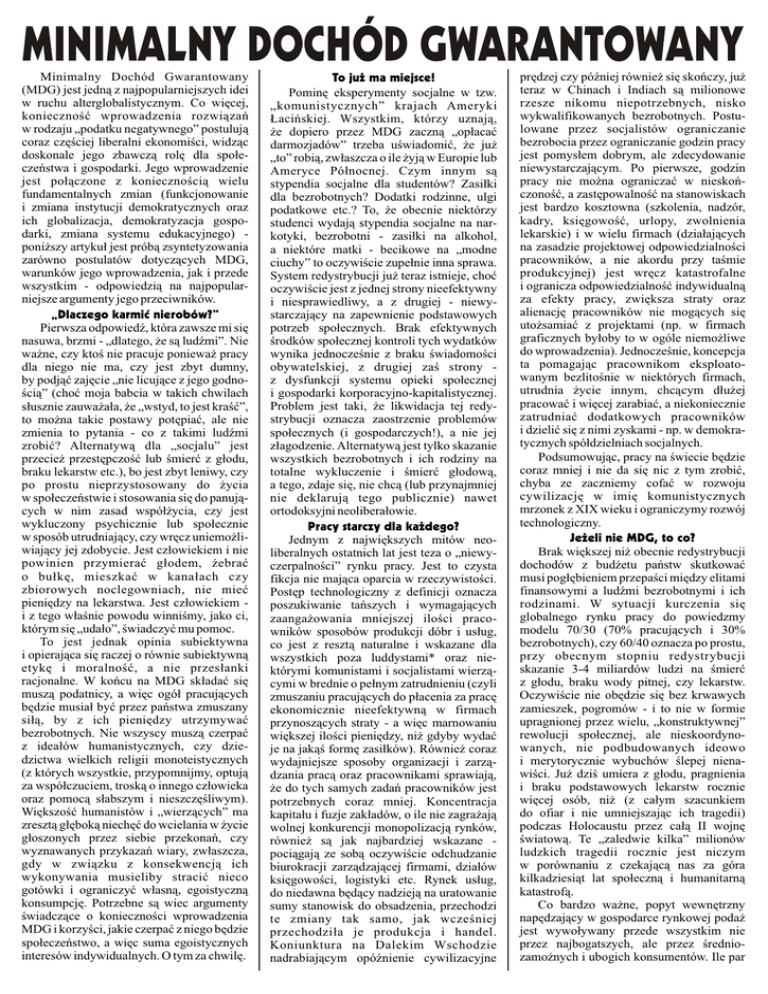 MINIMALNY DOCHÓD GWARANTOWANY Minimalny Dochód Gwarantowany (MDG) jest jedną z najpopularniejszych idei w ruchu alterglobalistycznym. Co więcej, konieczność wprowadzenia rozwiązań w rodzaju „podatku negatywnego” postulują coraz częściej liberalni ekonomiści, widząc doskonale jego zbawczą rolę dla społeczeństwa i gospodarki. Jego wprowadzenie jest połączone z koniecznością wielu fundamentalnych zmian (funkcjonowanie i zmiana instytucji demokratycznych oraz ich globalizacja, demokratyzacja gospodarki, zmiana systemu edukacyjnego) poniższy artykuł jest próbą zsyntetyzowania zarówno postulatów dotyczących MDG, warunków jego wprowadzenia, jak i przede wszystkim - odpowiedzią na najpopularniejsze argumenty jego przeciwników. „Dlaczego karmić nierobów?” Pierwsza odpowiedź, która zawsze mi się nasuwa, brzmi - „dlatego, że są ludźmi”. Nie ważne, czy ktoś nie pracuje ponieważ pracy dla niego nie ma, czy jest zbyt dumny, by podjąć zajęcie „nie licujące z jego godnością” (choć moja babcia w takich chwilach słusznie zauważała, że „wstyd, to jest kraść”, to można takie postawy potępiać, ale nie zmienia to pytania - co z takimi ludźmi zrobić? Alternatywą dla „socjalu” jest przecież przestępczość lub śmierć z głodu, braku lekarstw etc.), bo jest zbyt leniwy, czy po prostu nieprzystosowany do życia w społeczeństwie i stosowania się do panujących w nim zasad współżycia, czy jest wykluczony psychicznie lub społecznie w sposób utrudniający, czy wręcz uniemożliwiający jej zdobycie. Jest człowiekiem i nie powinien przymierać głodem, żebrać o bułkę, mieszkać w kanałach czy zbiorowych noclegowniach, nie mieć pieniędzy na lekarstwa. Jest człowiekiem i z tego właśnie powodu winniśmy, jako ci, którym się „udało”, świadczyć mu pomoc. To jest jednak opinia subiektywna i opierająca się raczej o równie subiektywną etykę i moralność, a nie przesłanki racjonalne. W końcu na MDG składać się muszą podatnicy, a więc ogół pracujących będzie musiał być przez państwa zmuszany siłą, by z ich pieniędzy utrzymywać bezrobotnych. Nie wszyscy muszą czerpać z ideałów humanistycznych, czy dziedzictwa wielkich religii monoteistycznych (z których wszystkie, przypomnijmy, optują za współczuciem, troską o innego człowieka oraz pomocą słabszym i nieszczęśliwym). Większość humanistów i „wierzących” ma zresztą głęboką niechęć do wcielania w życie głoszonych przez siebie przekonań, czy wyznawanych przykazań wiary, zwłaszcza, gdy w związku z konsekwencją ich wykonywania musieliby stracić nieco gotówki i ograniczyć własną, egoistyczną konsumpcję. Potrzebne są wiec argumenty świadczące o konieczności wprowadzenia MDG i korzyści, jakie czerpać z niego będzie społeczeństwo, a więc suma egoistycznych interesów indywidualnych. O tym za chwilę. Pracy starczy dla każdego? prędzej czy później również się skończy, już teraz w Chinach i Indiach są milionowe rzesze nikomu niepotrzebnych, nisko wykwalifikowanych bezrobotnych. Postulowane przez socjalistów ograniczanie bezrobocia przez ograniczanie godzin pracy jest pomysłem dobrym, ale zdecydowanie niewystarczającym. Po pierwsze, godzin pracy nie można ograniczać w nieskończoność, a zastępowalność na stanowiskach jest bardzo kosztowna (szkolenia, nadzór, kadry, księgowość, urlopy, zwolnienia lekarskie) i w wielu firmach (działających na zasadzie projektowej odpowiedzialności pracowników, a nie akordu przy taśmie produkcyjnej) jest wręcz katastrofalne i ogranicza odpowiedzialność indywidualną za efekty pracy, zwiększa straty oraz alienację pracowników nie mogących się utożsamiać z projektami (np. w firmach graficznych byłoby to w ogóle niemożliwe do wprowadzenia). Jednocześnie, koncepcja ta pomagając pracownikom eksploatowanym bezlitośnie w niektórych firmach, utrudnia życie innym, chcącym dłużej pracować i więcej zarabiać, a niekoniecznie zatrudniać dodatkowych pracowników i dzielić się z nimi zyskami - np. w demokratycznych spółdzielniach socjalnych. Podsumowując, pracy na świecie będzie coraz mniej i nie da się nic z tym zrobić, chyba ze zaczniemy cofać w rozwoju cywilizację w imię komunistycznych mrzonek z XIX wieku i ograniczymy rozwój technologiczny. Jednym z największych mitów neoliberalnych ostatnich lat jest teza o „niewyczerpalności” rynku pracy. Jest to czysta fikcja nie mająca oparcia w rzeczywistości. Postęp technologiczny z definicji oznacza poszukiwanie tańszych i wymagających zaangażowania mniejszej ilości pracowników sposobów produkcji dóbr i usług, co jest z resztą naturalne i wskazane dla wszystkich poza luddystami* oraz niektórymi komunistami i socjalistami wierzącymi w brednie o pełnym zatrudnieniu (czyli zmuszaniu pracujących do płacenia za pracę ekonomicznie nieefektywną w firmach przynoszących straty - a więc marnowaniu większej ilości pieniędzy, niż gdyby wydać je na jakąś formę zasiłków). Również coraz wydajniejsze sposoby organizacji i zarządzania pracą oraz pracownikami sprawiają, że do tych samych zadań pracowników jest potrzebnych coraz mniej. Koncentracja kapitału i fuzje zakładów, o ile nie zagrażają wolnej konkurencji monopolizacją rynków, również są jak najbardziej wskazane pociągają ze sobą oczywiście odchudzanie biurokracji zarządzającej firmami, działów księgowości, logistyki etc. Rynek usług, do niedawna będący nadzieją na uratowanie sumy stanowisk do obsadzenia, przechodzi te zmiany tak samo, jak wcześniej przechodziła je produkcja i handel. Koniunktura na Dalekim Wschodzie nadrabiającym opóźnienie cywilizacyjne Brak większej niż obecnie redystrybucji dochodów z budżetu państw skutkować musi pogłębieniem przepaści między elitami finansowymi a ludźmi bezrobotnymi i ich rodzinami. W sytuacji kurczenia się glob