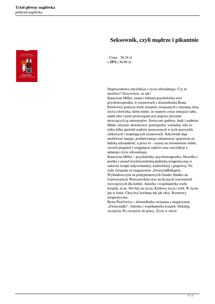 Tytuł główny nagłówka podtytuł nagłówka Seksownik, czyli mądrze i pikantnie Cena: 26.24 zł (-29%) 36.90 zł Stuprocentowa satysfakcja z życia seksualnego. Czy to możliwe? Oczywiście, że tak! Katarzyna Miller, znana i lubiana psycholożka oraz psychoterapeutka, w rozmowach z dziennikarką Beatą Pawłowicz porusza wiele tematów związanych z intymną sferą życia człowieka, która mimo, że stanowi coraz mniejsze tabu, nadal zbyt często postrzegana jest poprzez pryzmat niszczących ją stereotypów. Erotyczne gadżety, brak i nadmiar libido, intymne słownictwo, pornografia, wirtualny seks to tylko kilka spośród wątków poruszonych w tych niezwykle ciekawych i inspirujących rozmowach. Seksownik daje możliwość innego, pozbawionego zahamować spojrzenia na ludzką seksualność, a przez to - szansę na zrozumienie siebie, swoich pragnień i osiągnięcie radości oraz satysfakcji z udanego życia seksualnego. Katarzyna Miller – psycholożka, psychoterapeutka, filozofka i poetka z ponad trzydziestoletnią praktyką terapeutyczną w zakresie terapii indywidualnej, małżeńskiej i grupowej. Na stałe związana ze magazynem „Zwierciadło". Wykładowczyni na podyplomowych Gender Studies na Uniwersytecie Warszawskim oraz na licznych warsztatach rozwojowych dla kobiet. Autorka i współautorka wielu książek, m.in. Nie bój się życia, Królowe życia i król, W życiu jak w kinie, Chcę być kochana tak jak chcę. Rozmowy terapeutyczne. Beata Pawłowicz – dziennikarka związana z magazynem „Zwierciadło”. Autorka i współautorka książek: Dekalog szczęścia, Po szczęście do pracy, Życie w micie. 1/1 Powered by TCPDF (www.tcpdf.org)