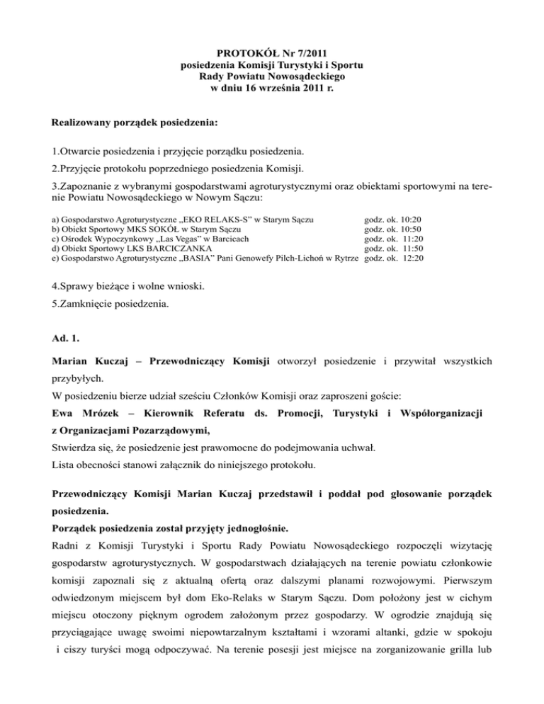 PROTOKÓŁ Nr 7/2011 posiedzenia Komisji Turystyki i Sportu Rady Powiatu Nowosądeckiego w dniu 16 września 2011 r. Realizowany porządek posiedzenia: 1.Otwarcie posiedzenia i przyjęcie porządku posiedzenia. 2.Przyjęcie protokołu poprzedniego posiedzenia Komisji. 3.Zapoznanie z wybranymi gospodarstwami agroturystycznymi oraz obiektami sportowymi na terenie Powiatu Nowosądeckiego w Nowym Sączu: a) Gospodarstwo Agroturystyczne „EKO RELAKS-S” w Starym Sączu b) Obiekt Sportowy MKS SOKÓŁ w Starym Sączu c) Ośrodek Wypoczynkowy „Las Vegas” w Barcicach d) Obiekt Sportowy LKS BARCICZANKA e) Gospodarstwo Agroturystyczne „BASIA” Pani Genowefy Pilch-Lichoń w Rytrze godz. ok. 10:20 godz. ok. 10:50 godz. ok. 11:20 godz. ok. 11:50 godz. ok. 12:20 4.Sprawy bieżące i wolne wnioski. 5.Zamknięcie posiedzenia. Ad. 1. Marian Kuczaj – Przewodniczący Komisji otworzył posiedzenie i przywitał wszystkich przybyłych. W posiedzeniu bierze udział sześciu Członków Komisji oraz zaproszeni goście: Ewa Mrózek – Kierownik Referatu ds. Promocji, Turystyki i Współorganizacji z Organizacjami Pozarządowymi, Stwierdza się, że posiedzenie jest prawomocne do podejmowania uchwał. Lista obecności stanowi załącznik do niniejszego protokołu. Przewodniczący Komisji Marian Kuczaj przedstawił i poddał pod głosowanie porządek posiedzenia. Porządek posiedzenia został przyjęty jednogłośnie. Radni z Komisji Turystyki i Sportu Rady Powiatu Nowosądeckiego rozpoczęli wizytację gospodarstw agroturystycznych. W gospodarstwach działających na terenie powiatu członkowie komisji zapoznali się z aktualną ofertą oraz dalszymi planami rozwojowymi. Pierwszym odwiedzonym miejscem był dom Eko-Relaks w Starym Sączu. Dom położony jest w cichym miejscu otoczony pięknym ogrodem założonym przez gospodarzy. W ogrodzie znajdują się przyciągające uwagę swoimi niepowtarzalnym kształtami i wzorami altanki, gdzie w spokoju i ciszy turyści mogą odpoczywać. Na terenie posesji jest miejsce na zorganizowanie grilla lub tradycyjnego ogniska. W sezonie letnim goście mogą konsumować owoce z przydomowego sadu prosto z drzew i krzewów. Na miejscu można nabyć drzewka i krzewy ozdobne oraz bonsai. Dla miłośników wędkarstwa istnieje możliwość wędkowania na pobliskich stawach rybnych. Na turystów czekają piękne, przestronne, doskonale wyposażone pokoje i miła domowa atmosfera. Drugim wizytowanym obiektem był Ośrodek Wypoczynkowy „Las Vegas” w Barcicach Rezydencja „Las Vegas” to bezpieczna ogrodzona posiadłość o powierzchni 2 ha. Ośrodek usytuowany jest w malowniczym parku sosnowym nad brzegiem rzeki Poprad. Wokół rozciaga się przepiękny widok na góry Popradzkiego Parku Narodowego. W komleksie znajduje się klimatyzowana sala bankietowa na 200 miejsc z zapleczem gastronomicznym, baza noclegowa na 90 miejsc w pokojach 2,3,4 osobowych oraz duży parking. Gospodarze zapewniają profesjonalną obsługę, wspaniałą kuchnię, wykwintne dania serwowane przez miłą obsługę w eleganckich wnętrzach stylowego dworu oraz niepowtarzalną atmosferę. „Rezydencja Las Vegas” to doskonałe miejsce treningu dla sportowców. Otaczające Barcice Góry Beskidu Sądeckiego z licznymi szlakami turystycznymi to wymarzony teren dla treningu kondycyjnego. Kolejne gospodarstwo jakie odwiedziła Komisja było Gospodarstwo Agroturystyczne pani Genowefy Pilch-Lichoń w Rytrze proponujące całoroczną ofertę wypoczynku dla indywidualnego turysty, a także dla całych rodzin. Do dyspozycji gości są pokoje o wysokim standardzie. Latem organizowane są wędrówki i wycieczki krajoznawcze, zwiedzanie najbliższej okolicy i atrakcji turystycznych. Zimą kuligi oraz możliwość jazdy na nartach na pobliskich trasach narciarskich. Można również skosztować regionalnych przysmaków przygotowanych przez właścicielkę gospodarstwa. Kolejnym miejscem, które komisja wizytowała był dom Państwa Jadwigi i Mirosława Długoszów w Łomnicy-Zdroju. W pięknie zagospodarowanym ogrodzie Pan Mirosław ma swój własny „Inwałd”. Ogród usytuowany na zboczu zdobią własnoręcznie wykonane dzieła z drewna i rzeźby. Można tam zobaczyć Wieżę Eiffla, gród słowiański, średniowieczną galerię i Titanica. Komisja odwiedziła również obiekty sportowe tj. obiekt Sportowy MKS SOKÓŁ w Starym Sączu oraz LKS BARCICZANKA. Podczas wizyty Członek Komisji Agata Król-Mirek zapytała o plany wyjazdu na najbliższe targi turystyczne. Ewa Mrózek – Kierownik Referatu ds. Promocji, Turystyki i Współorganizacji z Organizacjami Pozarządowymi poinformowała, że Zarząd Powiatu Nowosądeckiego nie podjął ostatecznej decyzji o wyjeździe na targi turystyczne do Kielc w dnia od 4-5 listopada br. Członkowie Komisji wyrazili chęć uczestnictwa w targach jeżeli Zarząd pozytywnie rozpatrzy udział Powiatu Nowosądeckiego w targach. Ad. 2. Przewodniczący Komisji Marian Kuczaj podziękował wszystkim przybyłym za udział i zamknął posiedzenie. Przewodniczący Komisji Turystyki i Sportu RPN Marian KUCZAJ Protokół sporządziła: Anna Hardy-Repetowska