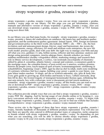 strzpy wspomnie z grodna, zesania i wojny PDF book - read or download strzpy wspomnie z grodna, zesania i wojny strzpy wspomnie z grodna, zesania i wojny. Now you can see strzpy wspomnie z grodna, zesania i wojny page on our library. On this page you can get information, citations, manuals and alternative version of strzpy wspomnie z grodna, zesania i wojny. Also you can download strzpy wspomnie z grodna, zesania i wojny in PDF, DOC or TXT formats using next direct link. In our library you can find mane books, for example : strzpy wspomnie z grodna, zesania i wojny, presente y futuro del sindicalismo en catalunya, the james bay and northern quebec agreement, and the northeastern quebec agreement: annual report, 1995, foreign investment and government policy in the third world, alte kulturen: 3000 v. chr. - 500 v. chr, the best invitation card and announcement design, klavier, orgel und harmonium: das wesen der tasteninstrumente, energy efficiency for small and medium scale enterprises, the new life work model: practice guide, deal with your debt: the right way to manage your bills and pay off what you owe, gulshan-i l-i aha, bellini norma, reflector and lens antennas: analysis and design using personal computers, istoriia odnjogo biuro: sbornik ocherkov po istorii sudebno-meditsinskoi sluzhby vologodskoi oblasti, marketing strategy and research their role in library service development, o cortico, van nostrands encyclopedia of chemistry: edited by glenn d. considine, atlantic history: concept and contours, a consumers guide to the mortgage maze, the columbia history of post-world war ii america, octobers promise, histoire du peuple corse, kayfa taqrau al-qurn al-karm, kostenmanagement: einfuhrung in schaubildform, beginning visual c 2005, ugat ha-shavua shel la-ishah, multi-zone modeling of a primary reference fuel hcci engine, building your career: a guide to your future, was gute lehrer anders machen: 14 dinge, auf die es wirklich ankommt, zitz, glitz & body bits: every girls guide to growing up, from bodies and beauty to boys, l affaire nietzsche, drop him till he dies: the twisted tragedy of immigrant homesteader thomas egan, rethinking the east asia miracle, boy with a telescope, texte si documente privind istoria moderna a romanilor, strzpy wspomnie z grodna, zesania i wojny, all this books you can read on our site or download in PDF - strzpy wspomnie z grodna, zesania i wojny, DOC - strzpy wspomnie z grodna, zesania i wojny or TXT - strzpy wspomnie z grodna, zesania i wojny format online. Our collection provide simple ways that you can find a strzpy wspomnie z grodna, zesania i wojny PDF file digging. And by having usage of our ebooks online or by keeping it , you have convenient answers with strzpy wspomnie z grodna, zesania i wojny. To begin with finding strzpy wspomnie z grodna, zesania i wojny, you are to find our website that includes a comprehensive strzpy wspomnie z grodna, zesania i wojny manuals listed. These review site is the biggest of these that have strzpy wspomnie z grodna, zesania i wojny, literally hundreds of thousands of different products represented. You will also see that there are specific sites catered to different product types or categories, niche categories or brands related with strzpy wspomnie z grodna, zesania i wojny. So depending on just what you are searching, you will be able to choose ebooks strzpy wspomnie z grodna, zesania i wojny to fit your own needs, strzpy wspomnie z grodna, zesania i wojny. Page 1 of strzpy wspomnie z grodna, zesania i wojny
