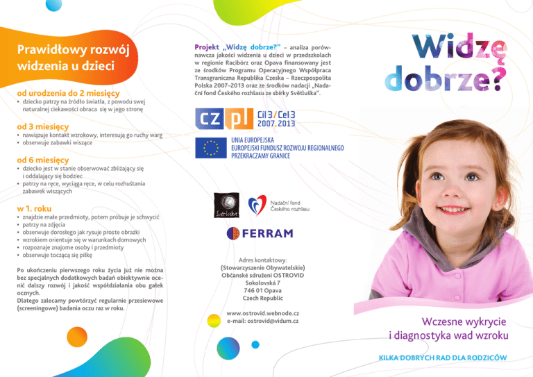 Prawidłowy rozwój widzenia u dzieci od urodzenia do 2 mie esiięccy Proje ekt „Widzę dobrz rze e?” – analiza porównawcza jakości widzenia u dzieci w przedszkolach w regionie Racibórz oraz Opava finansowany jest ze środków Programu Operacyjnego Współpraca Transgraniczna Republika Czeska – Rzeczpospolita Polska 2007–2013 oraz ze środków nadacji „Nadační fond Českého rozhlasu ze sbírky Světluška“. • dziecko patrzy na źródło światła, z powodu swej naturalnej ciekawości obraca się w jego stronę od 3 miesięcy • nawiązuje kontakt wzrokowy, interesują go ruchy warg • obserwuje zabawki wiszące od 6 miesięcy • dziecko jest w stanie obserwować zbliżający się i oddalający się bodziec • patrzy na ręce, wyciąga ręce, w celu rozhuśtania zabawek wiszących w 1. roku • • • • • • znajdzie małe przedmioty, potem próbuje je schwycić patrzy na zdjęcia obserwuje dorosłego jak rysuje proste obrazki wzrokiem orientuje się w warunkach domowych rozpoznaje znajome osoby i przedmioty obserwuje toczącą się piłkę Po ukończeniu pierwszego roku życia już nie można bez specjalnych dodatkowych badań obiektywnie ocenić dalszy rozwój i jakość współdziałania obu gałek ocznych. Dlatego zalecamy powtórzyć regularnie przesiewowe (screeningowe) badania oczu raz w roku. Adres kontaktowy: (Stowarzyszenie Obywatelskie) Občanské sdružení OSTROVID Sokolovská 7 746 01 Opava Czech Republic www.ostrovid.webnode.cz e-mail: [email protected] Czy moje dziecko ma wadę wzroku? Samo dziecko nie potrafi powiedzieć, że nie widzi dobrze, może dostrzegać otaczający nas świat niedokładnie i nieprawidłowo. Wada wzroku może się rozwijać długo bez objawów. Zapobiegawcze badanie oczu służy do wczesnego wykrycia wady wzroku. Jeżeli wada wzroku nie zostanie wcześnie wykryta i leczona, może spowodować trwałe uszkodzenia wzroku. Alarmujące jest, że w Republice Czeskiej niemal każde 12 dziecko ma niewykrytą wadę wzroku! Możżem my sa ami wykry yć wad dę wzrrok ku? Możliwe objawy dotyczące zachowania dziecka, które mogą wskazywać na wadę wzroku: • częste potykanie się oraz wpadanie na meble • niechęć do rysowania i czytania • słaba zdolność motoryczna i koordynacja ruchów (niezdarne chodzenie po nierównym terenie, niedokładne rzucanie i łapanie piłki) • pochylanie głowy • wykonywanie grimasu twarzy • mrużanie i tarcie oczu • częstsze upadki Kiedy należy wykonać zapobiegawcze badanie e oczu? Pierwsze badanie powinno być przeprowadzone jak najszybciej, najlepiej w pierwszym roku dziecka. Do 6-lat dziecka zalecamy powtórzyć prewencyjne badanie co najmniej raz w roku, ponieważ podczas rozwoju dziecka oczy zmieniają się i wada oczu może nadal się rozwijać. Jaka a jess t prroccedurra ba adań ń? Ważną częścią zapobiegawczego badania oczu jest pomiar (wykrycie) dioptrii. Najlepiej sposobem jest badanie za pomocy urządzenia Plusoptix, które oszczędza czas i prowadzi się bezkontaktowo, z odległości jednego metra. Dziecko jest badane formą zabawy bez stosowania kropli do oczu. Patrzy na świecącego pajacyka, który również odtwarza dźwięki, by przyciągnąć uwagę dziecka. Koniecznným komponentem badania są testy dodatkowe , które mogą pomóc wykryć niedowidzenie lub zez ukryty. Częścią badań są testy na rozpoznanie kolorów oraz wrażliwości na kontrast. Ważne jest ocenienie współdziałania obu gałek ocznych w procesie widzenia za pomocą testu stereopsji. Poza wykryciem dioptrii za pomocą aparatu można wykryć zez lub zaćmę. W przypadku wykrycia nieprawidłowości w rozwoju wzroku zaleca się u dziecka przeprowadzenie kompleksowego badania przez okuliste, który przepisze właściwe okulary korekcyjne lub odpowiednie leczenie wady wzroku. Z kim m należy się ę skontaktować? Zwróć się do swojego pediatry, który zaleci kolejne procedury lub najbliższą profesjonalną placówke wykonywającą zapobiegawcze przesiewowe (screeningowe) badania oczu. To może być gabinet okulistyczny, zajęcia terapeuta wzroku lub placówka ortoptyczna. Kolejną możliwością mogą być badania oczu przez takich specjalistów bezpośrednio w waszym przedszkolu.