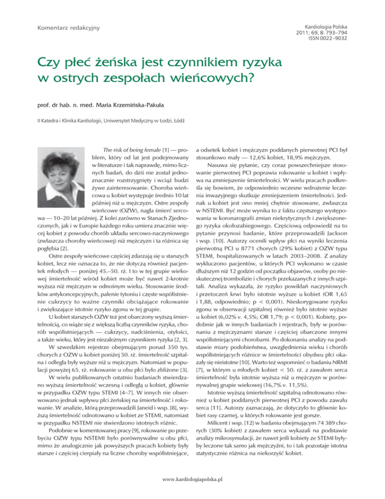 Kardiologia Polska 2011; 69, 8: 793–794 ISSN 0022–9032 Komentarz redakcyjny Czy płeć żeńska jest czynnikiem ryzyka w ostrych zespołach wieńcowych? prof. dr hab. n. med. Maria Krzemińska−Pakuła II Katedra i Klinika Kardiologii, Uniwersytet Medyczny w Łodzi, Łódź The risk of being female [1] — problem, który od lat jest podejmowany w literaturze i tak naprawdę, mimo licznych badań, do dziś nie został jednoznacznie rozstrzygnięty i wciąż budzi żywe zainteresowanie. Choroba wieńcowa u kobiet występuje średnio 10 lat później niż u mężczyzn. Ostre zespoły wieńcowe (OZW), nagła śmierć sercowa — 10–20 lat później. Z kolei zarówno w Stanach Zjednoczonych, jak i w Europie każdego roku umiera znacznie więcej kobiet z powodu chorób układu sercowo-naczyniowego (zwłaszcza choroby wieńcowej) niż mężczyzn i ta różnica się pogłębia [2]. Ostre zespoły wieńcowe częściej zdarzają się u starszych kobiet, lecz nie oznacza to, że nie dotyczą również pacjentek młodych — poniżej 45.–50. rż. I to w tej grupie wiekowej śmiertelność wśród kobiet może być nawet 2-krotnie wyższa niż mężczyzn w odnośnym wieku. Stosowanie środków antykoncepcyjnych, palenie tytoniu i częste współistnienie cukrzycy to ważne czynniki obciążające rokowanie i zwiększające istotnie ryzyko zgonu w tej grupie. U kobiet starszych OZW też jest obarczony wyższą śmiertelnością, co wiąże się z większą liczbą czynników ryzyka, chorób współistniejących — cukrzycy, nadciśnienia, otyłości, a także wieku, który jest niezależnym czynnikiem ryzyka [2, 3]. W szwedzkim rejestrze obejmującym ponad 350 tys. chorych z OZW u kobiet poniżej 50. rż. śmiertelność szpitalna i odległa były wyższe niż u mężczyzn. Natomiast w populacji powyżej 65. rż. rokowanie u obu płci było zbliżone [3]. W wielu publikowanych ostatnio badaniach stwierdzano wyższą śmiertelność wczesną i odległą u kobiet, głównie w przypadku OZW typu STEMI [4–7]. W innych nie obserwowano jednak wpływu płci żeńskiej na śmiertelność i rokowanie. W analizie, którą przeprowadzili Janeid i wsp. [8], wyższą śmiertelność odnotowano u kobiet ze STEMI, natomiast w przypadku NSTEMI nie stwierdzono istotnych różnic. Podobnie w komentowanej pracy [9], rokowanie po przebyciu OZW typu NSTEMI było porównywalne u obu płci, mimo że analogicznie jak powyższych pracach kobiety były starsze i częściej cierpiały na liczne choroby współistniejące, a odsetek kobiet i mężczyzn poddanych pierwotnej PCI był stosunkowo mały — 12,6% kobiet, 18,9% mężczyzn. Nasuwa się pytanie, czy coraz powszechniejsze stosowanie pierwotnej PCI poprawia rokowanie u kobiet i wpływa na zmniejszenie śmiertelności. W wielu pracach podkreśla się bowiem, że odpowiednio wczesne wdrożenie leczenia inwazyjnego skutkuje zmniejszeniem śmiertelności. Jednak u kobiet jest ono mniej chętnie stosowane, zwłaszcza w NSTEMI. Być może wynika to z faktu częstszego występowania w koronarografii zmian niekrytycznych i zwiększonego ryzyka okołozabiegowego. Częściową odpowiedź na to pytanie przynosi badanie, które przeprowadzili Jackson i wsp. [10]. Autorzy ocenili wpływ płci na wyniki leczenia pierwotną PCI u 8771 chorych (29% kobiet) z OZW typu STEMI, hospitalizowanych w latach 2003–2008. Z analizy wykluczono pacjentów, u których PCI wykonano w czasie dłuższym niż 12 godzin od początku objawów, osoby po nieskutecznej trombolizie i chorych przekazanych z innych szpitali. Analiza wykazała, że ryzyko powikłań naczyniowych i przetoczeń krwi było istotnie wyższe u kobiet (OR 1,65 i 1,88, odpowiednio; p < 0,001). Nieskorygowane ryzyko zgonu w obserwacji szpitalnej również było istotnie wyższe u kobiet (6,02% v. 4,5%; OR 1,79; p < 0,001). Kobiety, podobnie jak w innych badaniach i rejestrach, były w porównaniu z mężczyznami starsze i częściej obarczone innymi współistniejącymi chorobami. Po dokonaniu analizy na podstawie miary podobieństwa, uwzględnienia wieku i chorób współistniejących różnice w śmiertelności obydwu płci okazały się nieistotne [10]. Warto też wspomnieć o badaniu NRMI [7], w którym u młodych kobiet < 50. rż. z zawałem serca śmiertelność była istotnie wyższa niż u mężczyzn w porównywalnej grupie wiekowej (16,7% v. 11,5%). Istotnie wyższą śmiertelność szpitalną odnotowano również u kobiet poddanych pierwotnej PCI z powodu zawału serca [11]. Autorzy zaznaczają, że dotyczyło to głównie kobiet rasy czarnej, u których rokowanie jest gorsze. Milicent i wsp. [12] w badaniu obejmującym 74 389 chorych (30% kobiet) z zawałem serca wykazali na podstawie analizy mikrosymulacji, że nawet jeśli kobiety ze STEMI byłyby leczone tak samo jak mężczyźni, to i tak pozostaje istotna statystycznie różnica na niekorzyść kobiet. www.kardiologiapolska.pl 794 Maria Krzemińska-Pakuła Autorzy uważają, że płeć żeńska wiąże się z wyższą śmiertelnością w zawale serca, a także wyniki PCI są gorsze u kobiet (mniejsza skuteczność, więcej powikłań). Wewnątrznaczyniowe dysekcje i perforacje naczynia są następstwem m.in. trudności dopasowania cewników i stentów do naczyń wieńcowych kobiet, co zależy m.in. od mniejszej średnicy tętnic, ich większej krętości, częstszej dysfunkcji śródbłonka i mięśni gładkich, a to przejawia się m.in. częstszym występowaniem kurczu naczyń i choroby Raynaud u kobiet. Ważną rolę odgrywają biologiczne czynniki hormonalne, a także różnice zależne od płci [13]. Wiele zjawisk związanych z płcią i jej wpływem na rokowanie i śmiertelność w OZW wymaga przeprowadzenia dalszych pogłębionych badań uwzględniających niejednorodność populacji (zwłaszcza w NSTEMI), co w dużej mierze przekłada się na zróżnicowane wyniki. 5. 6. 7. 8. 9. 10. Konflikt interesów: nie zgłoszono Piśmiennictwo 1. 2. 3. 4. Elsae