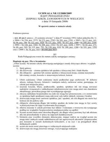 UCHWAŁA NR 12/2008/2009 RADY PEDAGOGICZNEJ ZESPOŁU SZKÓŁ ZAWODOWYCH W WIELICZCE z dnia 19 listopada 2008r W sprawie zmian w statucie szkoły Podstawa prawna: - Art. 42 ust.1 ustawy „ O systemie oświaty” z dnia 07 września 1991r (tekst jednolity:Dz. U. z 2004 r. Nr 256, poz. 2572, Nr 273, poz. 2703 i Nr 281, poz. 2781, z 2005 r. Nr 17, poz. 141, Nr 94, poz. 788, Nr 122, poz. 1020, Nr 131, poz. 1091, Nr 167, poz. 1400 i Nr 249, poz. 2104, z 2006 r. Nr 144, poz. 1043, Nr 208, poz. 1532 i Nr 227, poz. 1658, z 2007 r. Nr 42, poz. 273, Nr 80, poz. 542, Nr 115, poz. 791, Nr 120, poz. 818, Nr 180, poz. 1280 i Nr 181, poz. 1292 oraz z 2008 r. Nr 70, poz. 416 i Nr 145, poz. 917) §1 Rada Pedagogiczna wnosi do statutu szkoły następujące zmiany: Dopisuje się par. 35a w brzmieniu: „Ubiór ucznia. Na terenie szkoły obowiązują następujące zasady dotyczące ubioru i wyglądu ucznia: 1. Strój galowy 1) dla dziewcząt – ciemna spódnica lub spodnie o klasycznej linii i biała bluzka 2) dla chłopców – garnitur lub ciemne spodnie o klasycznym kroju, ciemna marynarka lub ciemny sweter, koszula w stonowanym kolorze, krawat 2. Ubiór codzienny. Ubiór codzienny moŜe podkreślać jego osobowość. W doborze ubioru, rodzaju fryzury, biŜuterii i makijaŜu naleŜy zachować umiar, pamiętając, Ŝe szkoła jest miejscem pracy. 1) noszone koszule, bluzy, podkoszulki, spodnie, spódnice itd. nie mogą zawierać nadruków związanych z subkulturami młodzieŜowymi (nie mogą mieć one charakteru obraźliwego, prowokacyjnego lub wywołującego agresję) 2) okrycia zakładane bezpośrednio na ciało nie mogą być przezroczyste, a w zestawieniu ze spódnicą bądź spodniami mają zakrywać cały tułów (dekolt, ramiona i biodra) 3) dziewczęta mogą nosić zarówno spódnice, jak i spodnie, ale ich długość nie moŜe być krótsza niŜ do połowy uda 4) chłopców obowiązują długie lub krótkie spodnie do kolan (nie mogą to być szorty wykorzystywane do zajęć wychowania fizycznego) 5) obuwie noszone w szkole powinno być lekkie i wykonane z tworzywa nie rysującego podłóg (ze względów bezpieczeństwa niedopuszczalne są szpilki) 6) fryzura ucznia moŜe mieć dowolną długość, ale długie włosy powinny być tak ułoŜone aby nie przeszkadzały w pracy na zajęciach dydaktycznych 7) biŜuteria oraz wszelkie elementy dekoracyjne, mające wpływ na wygląd ucznia nie mogą mieć Ŝadnych oznak subkulturowych ani agresywnych akcentów (dopuszczalne jest noszenie w uszach dyskretnych kolczyków, a na szyi i na przegubach dłoni delikatnych ozdób) 8) uczeń nie moŜe nosić piercingu w widocznych miejscach ciała 9) dziewczęta nie mogą stosować ostrego, wyzywającego makijaŜu 3. Wygląd zewnętrzny ucznia nie moŜe mieć wpływu na oceny z Ŝadnego przedmiotu. 4. JeŜeli strój lub wygląd ucznia odbiega od obowiązujących w statucie zasad, wychowawca, nauczyciel i dyrektor mają prawo zwrócić uwagę, a uczeń ma obowiązek zastosować się do zaleceń.” §2 Dyrektor szkoły przygotuje jednolity tekst statutu szkoły. §3 Uchwała wchodzi w Ŝycie z dniem 01 stycznia 2009r. ---------------------------------------Podpis przewodniczącego Rady