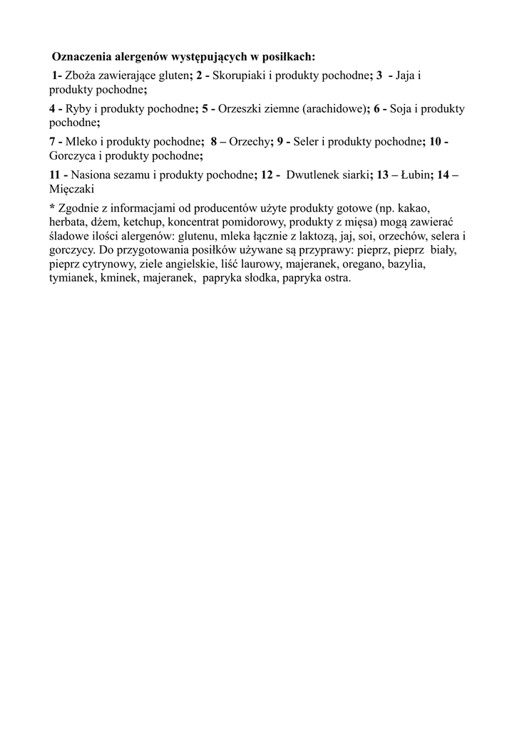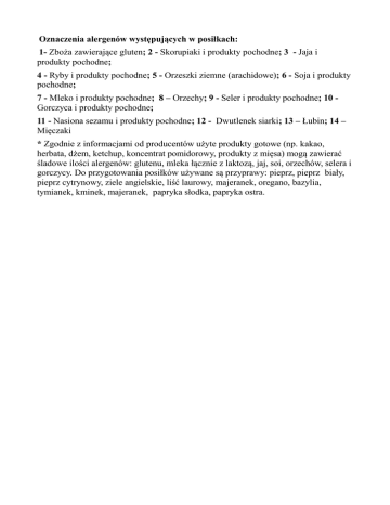 Oznaczenia alergenów występujących w posiłkach: 1- Zboża zawierające gluten; 2 - Skorupiaki i produkty pochodne; 3 - Jaja i produkty pochodne; 4 - Ryby i produkty pochodne; 5 - Orzeszki ziemne (arachidowe); 6 - Soja i produkty pochodne; 7 - Mleko i produkty pochodne; 8 – Orzechy; 9 - Seler i produkty pochodne; 10 Gorczyca i produkty pochodne; 11 - Nasiona sezamu i produkty pochodne; 12 - Dwutlenek siarki; 13 – Łubin; 14 – Mięczaki * Zgodnie z informacjami od producentów użyte produkty gotowe (np. kakao, herbata, dżem, ketchup, koncentrat pomidorowy, produkty z mięsa) mogą zawierać śladowe ilości alergenów: glutenu, mleka łącznie z laktozą, jaj, soi, orzechów, selera i gorczycy. Do przygotowania posiłków używane są przyprawy: pieprz, pieprz biały, pieprz cytrynowy, ziele angielskie, liść laurowy, majeranek, oregano, bazylia, tymianek, kminek, majeranek, papryka słodka, papryka ostra.