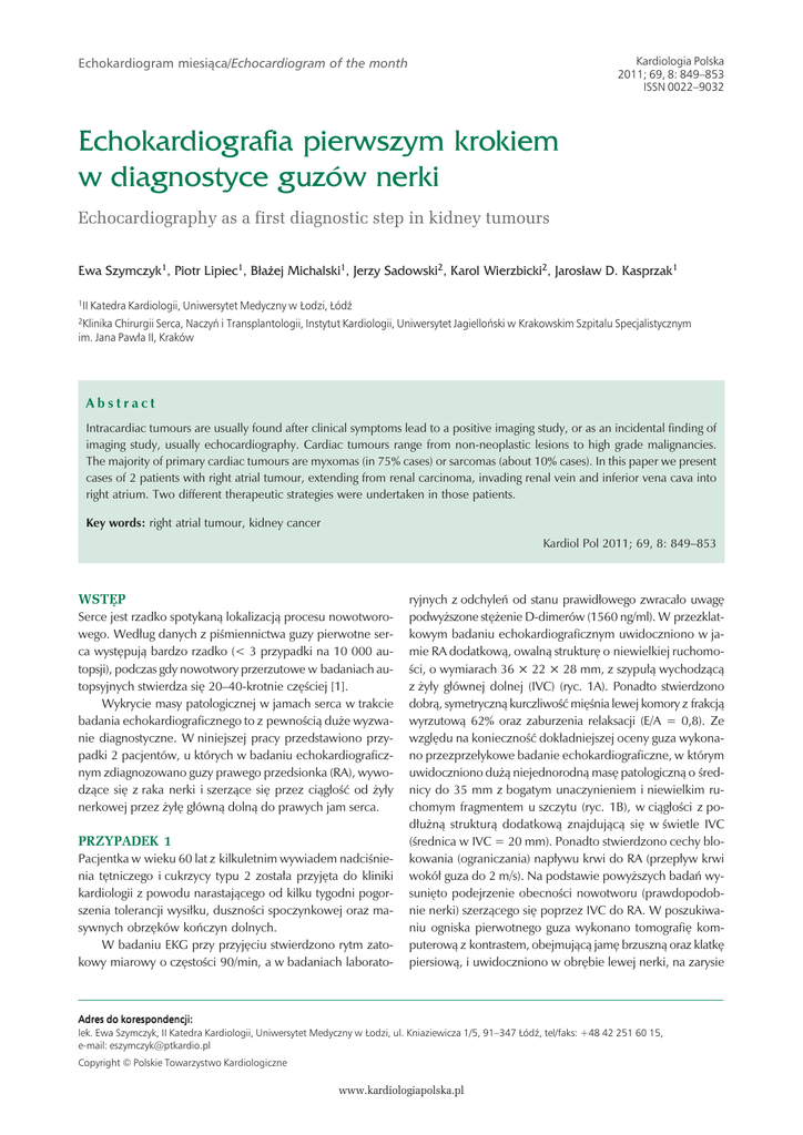 Kardiologia Polska 2011; 69, 8: 849–853 ISSN 0022–9032 Echokardiogram miesiąca/Echocardiogram of the month Echokardiografia pierwszym krokiem w diagnostyce guzów nerki Echocardiography as a first diagnostic step in kidney tumours Ewa Szymczyk1, Piotr Lipiec1, Błażej Michalski1, Jerzy Sadowski2, Karol Wierzbicki2, Jarosław D. Kasprzak1 1II Katedra Kardiologii, Uniwersytet Medyczny w Łodzi, Łódź 2Klinika Chirurgii Serca, Naczyń i Transplantologii, Instytut Kardiologii, Uniwersytet Jagielloński w Krakowskim Szpitalu Specjalistycznym im. Jana Pawła II, Kraków Abstract Intracardiac tumours are usually found after clinical symptoms lead to a positive imaging study, or as an incidental finding of imaging study, usually echocardiography. Cardiac tumours range from non-neoplastic lesions to high grade malignancies. The majority of primary cardiac tumours are myxomas (in 75% cases) or sarcomas (about 10% cases). In this paper we present cases of 2 patients with right atrial tumour, extending from renal carcinoma, invading renal vein and inferior vena cava into right atrium. Two different therapeutic strategies were undertaken in those patients. Key words: right atrial tumour, kidney cancer Kardiol Pol 2011; 69, 8: 849–853 WSTĘP Serce jest rzadko spotykaną lokalizacją procesu nowotworowego. Według danych z piśmiennictwa guzy pierwotne serca występują bardzo rzadko (< 3 przypadki na 10 000 autopsji), podczas gdy nowotwory przerzutowe w badaniach autopsyjnych stwierdza się 20–40-krotnie częściej [1]. Wykrycie masy patologicznej w jamach serca w trakcie badania echokardiograficznego to z pewnością duże wyzwanie diagnostyczne. W niniejszej pracy przedstawiono przypadki 2 pacjentów, u których w badaniu echokardiograficznym zdiagnozowano guzy prawego przedsionka (RA), wywodzące się z raka nerki i szerzące się przez ciągłość od żyły nerkowej przez żyłę główną dolną do prawych jam serca. PRZYPADEK 1 Pacjentka w wieku 60 lat z kilkuletnim wywiadem nadciśnienia tętniczego i cukrzycy typu 2 została przyjęta do kliniki kardiologii z powodu narastającego od kilku tygodni pogorszenia tolerancji wysiłku, duszności spoczynkowej oraz masywnych obrzęków kończyn dolnych. W badaniu EKG przy przyjęciu stwierdzono rytm zatokowy miarowy o częstości 90/min, a w badaniach laborato- ryjnych z odchyleń od stanu prawidłowego zwracało uwagę podwyższone stężenie D-dimerów (1560 ng/ml). W przezklatkowym badaniu echokardiograficznym uwidoczniono w jamie RA dodatkową, owalną strukturę o niewielkiej ruchomości, o wymiarach 36 ¥ 22 ¥ 28 mm, z szypułą wychodzącą z żyły głównej dolnej (IVC) (ryc. 1A). Ponadto stwierdzono dobrą, symetryczną kurczliwość mięśnia lewej komory z frakcją wyrzutową 62% oraz zaburzenia relaksacji (E/A = 0,8). Ze względu na konieczność dokładniejszej oceny guza wykonano przezprzełykowe badanie echokardiograficzne, w którym uwidoczniono dużą niejednorodną masę patologiczną o średnicy do 35 mm z bogatym unaczynieniem i niewielkim ruchomym fragmentem u szczytu (ryc. 1B), w ciągłości z podłużną strukturą dodatkową znajdującą się w świetle IVC (średnica w IVC = 20 mm). Ponadto stwierdzono cechy blokowania (ograniczania) napływu krwi do RA (przepływ krwi wokół guza do 2 m/s). Na podstawie powyższych badań wysunięto podejrzenie obecności nowotworu (prawdopodobnie nerki) szerzącego się poprzez IVC do RA. W poszukiwaniu ogniska pierwotnego guza wykonano tomografię komputerową z kontrastem, obejmującą jamę brzuszną oraz klatkę piersiową, i uwidoczniono w obrębie lewej nerki, na zarysie Adres do korespondencji: lek. Ewa Szymczyk, II Katedra Kardiologii, Uniwersytet Medyczny w Łodzi, ul. Kniaziewicza 1/5, 91–347 Łódź, tel/faks: +48 42 251 60 15, e-mail: [email protected] Copyright © Polskie Towarzystwo Kardiologiczne www.kardiologiapolska.pl 850 A Ewa Szymczyk et al. B Rycina 1. A. Przezklatkowe badanie echokardiograficzne w zmodyfikowanej projekcji koniuszkowej 4-jamowej — w prawym przedsionku (RA) widoczna dodatkowa, owalna struktura (strzałka); B. Przezprzełykowe badanie echokardiograficzne — w RA widoczna niejednorodna masa patologiczna (strzałka); LA — lewy przedsionek; LV — lewa komora; RV — prawa komora A B Rycina 2. A. Badanie metodą tomografii komputerowej jamy brzusznej — w obrębie lewej nerki, na zarysie zewnętrznym dolnego bieguna widoczna masa patologiczna (strzałka); B. Badanie metodą tomografii komputerowej klatki piersiowej — w płucach widoczne różnej wielkości zmiany guzkowe mogące odpowiadać przerzutom (strzałki) zewnętrznym dolnego bieguna, miękkotkankową masę patologiczną o wymiarach 56 ¥ 60 ¥ 140 mm, naciekającą naczynia nerkowe (ryc. 2A). Ponadto uwidoczniono patologiczną masę o niejednorodnej densyjności znajdującą się w świetle RA, poszerzonej IVC, lewej żyły nerkowej, lewej żyły biodrowej wspólnej i biodrowej wewnętrznej. Dodatkowo w obrę- bie płuc stwierdzono liczne, zróżnicowanej wielkości zmiany guzkowe mogące odpowiadać przerzutom (ryc. 2B). Ze względu na obraz zaawansowanej choroby nowotworowej wywodzącej się najprawdopodobniej z lewej nerki (rak jasnokomórkowy) z przerzutami do obu płuc i materiałem metastatycznym w układzie żylnym (od żył biodrowych aż do www.kardiologiapolska.pl 851 Echokardiografia pierwszym krokiem w diagnostyce guzów nerki A B Rycina 3. Przezklatkowe badanie echokardiograficzne — zmodyfikowana projekcja koniuszkowa 4-jamowa (A A ) i projekcja podB ) — w prawym przedsionku (RA) widoczny owalny guz pozostający w łączności z masą wypełniającą końcowy odcinek mostkowa (B żyły głównej dolnej (IVC) (strzałka); LA — lewy przedsionek; LV — lewa komora; RV — prawa komora RA) chorą poddano konsultacji onkologicznej i kardiochirurgicznej. Pacjentka została zdyskwalifikowana z przyczynowego leczenia guza nerki oraz paliatywnego zabiegu odbarcz
