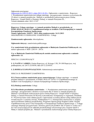 Ogłoszenie powiązane: Ogłoszenie nr 228319-2013 z dnia 2013-10-30 r. Ogłoszenie o zamówieniu - Ropczyce 1. Przedmiotem zamówienia jest usługa cateringu - przygotowanie i dostawa wyżywienia dla 25 dzieci w ramach projektu pn.: Maluch w przedszkolu realizowanym przez Gminę Ropczyce / Zespół Szkół w Gnojnicy Dolnej, w ramach Priorytetu IX... Termin składania ofert: 2013-11-07 Ropczyce: Usługa cateringu - w ramach projektu Maluch w przedszkolu, nr POKL.09.01.01-18-011/13 współfinansowanego ze środków Unii Europejskiej w ramach Europejskiego Funduszu Społecznego. Numer ogłoszenia: 241073 - 2013; data zamieszczenia: 14.11.2013 OGŁOSZENIE O UDZIELENIU ZAMÓWIENIA - Usługi Zamieszczanie ogłoszenia: obowiązkowe. Ogłoszenie dotyczy: zamówienia publicznego. Czy zamówienie było przedmiotem ogłoszenia w Biuletynie Zamówień Publicznych: tak, numer ogłoszenia w BZP: 228319 - 2013r. Czy w Biuletynie Zamówień Publicznych zostało zamieszczone ogłoszenie o zmianie ogłoszenia: tak. SEKCJA I: ZAMAWIAJĄCY I. 1) NAZWA I ADRES: Gmina Ropczyce, ul. Krisego 1/30, 39-100 Ropczyce, woj. podkarpackie, tel. (017) 2210550, faks (017) 2210555. I. 2) RODZAJ ZAMAWIAJĄCEGO: Administracja samorządowa. SEKCJA II: PRZEDMIOT ZAMÓWIENIA II.1) Nazwa nadana zamówieniu przez zamawiającego: Usługa cateringu - w ramach projektu Maluch w przedszkolu, nr POKL.09.01.01-18-011/13 współfinansowanego ze środków Unii Europejskiej w ramach Europejskiego Funduszu Społecznego.. II.2) Rodzaj zamówienia: Usługi. II.3) Określenie przedmiotu zamówienia: : 1. Przedmiotem zamówienia jest usługa cateringu - przygotowanie i dostawa wyżywienia dla 25 dzieci w ramach projektu pn.: Maluch w przedszkolu realizowanym przez Gminę Ropczyce / Zespół Szkół w Gnojnicy Dolnej, w ramach Priorytetu IX Rozwój wykształcenia i kompetencji w regionach, Działanie 9.1 Wyrównywanie szans edukacyjnych i zapewnienie wysokiej jakości usług edukacyjnych świadczonych w systemie oświaty, Poddziałanie 9.1.1 Zmniejszanie nierówności w stopniu upowszechniania edukacji przedszkolnej, Programu Operacyjnego Kapitał Ludzki. Projekt współfinansowany przez Unię Europejską w Europejskiego Funduszu Społecznego. 2. Usługa cateringu obejmuje przygotowanie i dostawę gotowych posiłków dla 25 dzieci w wieku od 3 do 4 lat uczęszczających do oddziału przedszkolnego utworzonego przy Zespole Szkół w Małej w ramach projektu pn.: Maluch w przedszkolu realizowanego przez Gminę Ropczyce / Zespół Szkół w Gnojnicy Dolnej. 3. Miejsce realizacji usługi: siedziba oddziału przedszkolnego - Zespół Szkół w Małej, 39-107 Niedźwiada, Mała 35 4. Zamówienie obejmuje przygotowanie oraz dostarczenie obiadu składającego się z 2 dań oraz podwieczorku do siedziby oddziału przedszkolnego - codziennie od poniedziałku do piątku w godzinach: a) obiad - godz. 11:45, b) podwieczorek - godz. 13:45. Posiłki będą dostarczane codziennie od poniedziałku do piątku, z wyjątkiem dni ustawowo wolnych od pracy, dni wolnych od zajęć edukacyjnych w przedszkolu z wyłączeniem miesiąca sierpnia. 5. Zamawiający określa szacunkową wielkość przedmiotu zamówienia w okresie trwania umowy tj. od dnia podpisania umowy do dnia 30.06.2015 r.,tj. maksymalnie: a) obiad (w zestawie: zupa, drugie danie, kompot) - 9 900 posiłków, (9 900 osobodni wyżywienia dla dzieci) b) podwieczorek - 9 900 posiłków (9 900 osobodni wyżywienia dla dzieci) Zakres dostawy posiłków ma charakter szacunkowy. Zamawiający zastrzega możliwość zmniejszenia liczby zamawianych posiłków w trakcie trwania umowy z powodu absencji dzieci lub rezygnacji z uczęszczania do oddziału przedszkolnego. Wykonawca nie może mieć w stosunku do Zamawiającego żadnych roszczeń z powodu realizacji umowy w mniejszym zakresie. 6. Dzienny jadłospis powinien obejmować: 1) obiad - obejmujący: zupę (przygotowaną na bazie wywaru warzywno-mięsnego z wkładką mięsną) drugie danie (zawierające sztukę mięsa, udziec kurczaka, kotlet schabowy, stek z piersi z kurczaka, bitki wołowe, gulasz itp.: oraz ziemniaki (lub zamiennie ryż, kasza, kopytka, makaron itp.) lub ryba, pierogi, naleśniki, knedle itp. + kompot. 2) Podwieczorek - składający się np. z kanapki z pastą jajeczną, serową lub pasztetem, galaretki, budyniu, ciasta, owoce, warzywa, bułka słodka, soki owocowe i warzywne, woda mineralna itp. Obiad i podwieczorek muszą spełniać następujące warunki ilościowe: a) zupa: gramatura nie mniej niż 250 ml i kaloryczność nie mniej niż 200 kcal b) drugie danie: gramatura nie mniej niż 500 gram i kaloryczność nie mniej niż 700 kcal napój: gramatura nie mniej niż 200 ml (zamawiający przez napój rozumie np. kompot, sok owocowy) c) podwieczorek: o kaloryczności nie mniej niż 170-240 kcal. 7. Zamawiający zastrzega, że posiłki muszą spełniać następujące warunki jakościowe: 1) potrawy powinny być lekkostrawne, przygotowywane z surowców najwyższej jakości, świeżych, naturalnych, mało przetworzonych, z ograniczoną ilością substancji dodatkowych, konserwujących, zagęszczających, barwiących lub sztucznie aromatyzowanych 2) w jadłospisie powinny przeważać potrawy gotowane, pieczone i duszone, okazjonalnie smażone 3) do przygotowania posiłku zalecane jest: stosowanie tłuszczów roślinnych (ograniczone stosowanie tłuszczów zwierzęcych), stosowanie dużej ilości rodzaju warzyw i owoców, w tym także nasion strączkowych, różnego rodzaju kasz, umiarkowane stosowanie jaj, cukru i soli. 8. Wykonawca będzie przygotowywał i dostarczał posiłki zachowując wymogi sanitarno - epidemiologiczne. 9. Wykonawca będzie dostarczał w pierwszy dzień tygodnia, dekadowy jadłospis z podaniem składników wagowych (gramatury) i kaloryczności potraw. Wykonawca zobowiązany jest do zachowania jakości obiadów zgodnie z przedstawionym jadłospisem. Wszelkie zmiany w jadłospisie sugerowane przez Zamawiającego będą w