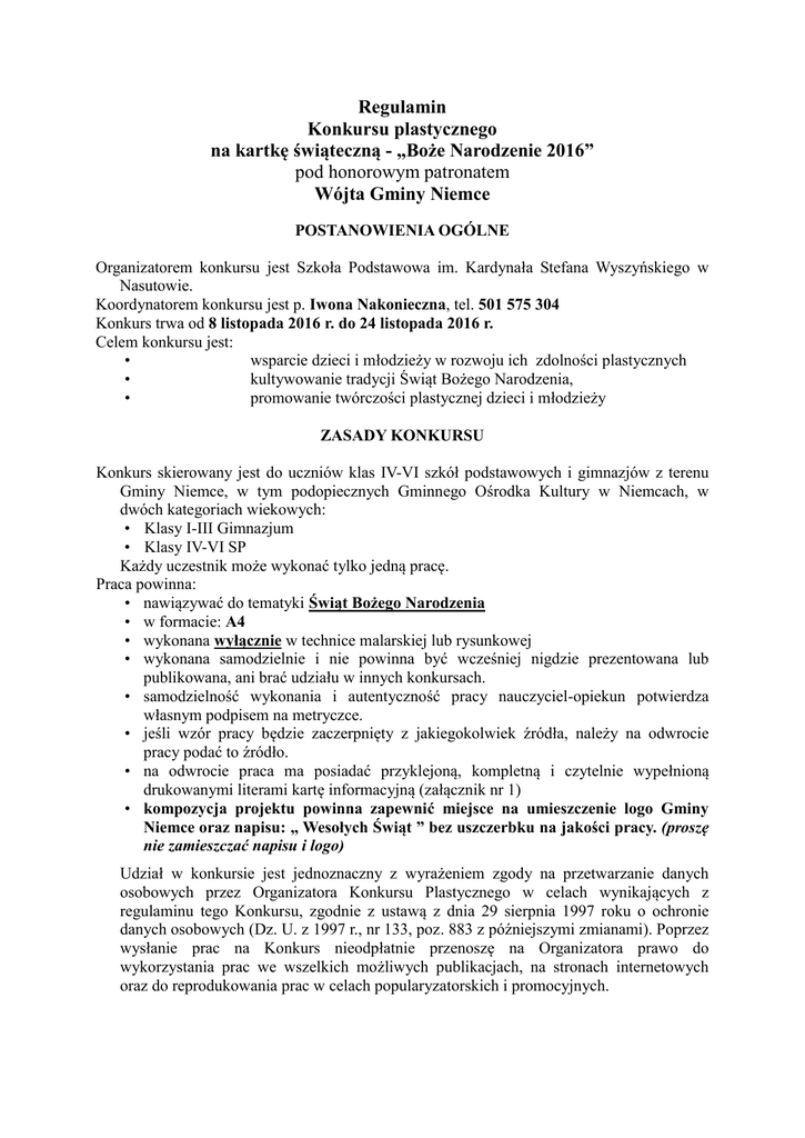 Regulamin Konkursu plastycznego na kartkę świąteczną - „Boże Narodzenie 2016” pod honorowym patronatem Wójta Gminy Niemce POSTANOWIENIA OGÓLNE Organizatorem konkursu jest Szkoła Podstawowa im. Kardynała Stefana Wyszyńskiego w Nasutowie. Koordynatorem konkursu jest p. Iwona Nakonieczna, tel. 501 575 304 Konkurs trwa od 8 listopada 2016 r. do 24 listopada 2016 r. Celem konkursu jest: • wsparcie dzieci i młodzieży w rozwoju ich zdolności plastycznych • kultywowanie tradycji Świąt Bożego Narodzenia, • promowanie twórczości plastycznej dzieci i młodzieży ZASADY KONKURSU Konkurs skierowany jest do uczniów klas IV-VI szkół podstawowych i gimnazjów z terenu Gminy Niemce, w tym podopiecznych Gminnego Ośrodka Kultury w Niemcach, w dwóch kategoriach wiekowych: • Klasy I-III Gimnazjum • Klasy IV-VI SP Każdy uczestnik może wykonać tylko jedną pracę. Praca powinna: • nawiązywać do tematyki Świąt Bożego Narodzenia • w formacie: A4 • wykonana wyłącznie w technice malarskiej lub rysunkowej • wykonana samodzielnie i nie powinna być wcześniej nigdzie prezentowana lub publikowana, ani brać udziału w innych konkursach. • samodzielność wykonania i autentyczność pracy nauczyciel-opiekun potwierdza własnym podpisem na metryczce. • jeśli wzór pracy będzie zaczerpnięty z jakiegokolwiek źródła, należy na odwrocie pracy podać to źródło. • na odwrocie praca ma posiadać przyklejoną, kompletną i czytelnie wypełnioną drukowanymi literami kartę informacyjną (załącznik nr 1) • kompozycja projektu powinna zapewnić miejsce na umieszczenie logo Gminy Niemce oraz napisu: „ Wesołych Świąt ” bez uszczerbku na jakości pracy. (proszę nie zamieszczać napisu i logo) Udział w konkursie jest jednoznaczny z wyrażeniem zgody na przetwarzanie danych osobowych przez Organizatora Konkursu Plastycznego w celach wynikających z regulaminu tego Konkursu, zgodnie z ustawą z dnia 29 sierpnia 1997 roku o ochronie danych osobowych (Dz. U. z 1997 r., nr 133, poz. 883 z późniejszymi zmianami). Poprzez wysłanie prac na Konkurs nieodpłatnie przenoszę na Organizatora prawo do wykorzystania prac we wszelkich możliwych publikacjach, na stronach internetowych oraz do reprodukowania prac w celach popularyzatorskich i promocyjnych. Organizator oświadcza, że dane osobowe uczestnika będą przetwarzane przez Organizatora w celu realizacji i promocji niniejszego Konkursu. Prace nie spełniające warunków określonych w regulaminie - (pkt. 3 Zasady Regulaminu) - nie będą oceniane w konkursie. Wszystkie prace dostarczone na konkurs przechodzą na własność Organizatora Konkursu i nie podlegają zwrotowi. SPOSÓB WYŁONIENIA ZWYCIĘSKIEJ PRACY ORAZ FORMY NAGRODY 1. Wykonane przez uczniów prace zostaną poddane ocenie w dwóch etapach: 1.a. Pierwszy etap eliminacji: Spośród wykonanych prac na terenie danej placówki należy wybrać max. 3 projekty w danej kategorii wiekowej (w szkołach, gdzie jest kilka klas równoległych max.5 projektów) i dostarczyć je do Szkoły Podstawowej im. Kardynała Stefana Wyszyńskiego w Nasutowie (sekretariat szkolny) w nieprzekraczalnym terminie do 24 listopada 2016 r. (czwartek) do godz. 13.30 2. 3. 4. 5. 6. 7. 8. 1.b. Drugi etap eliminacji: Komisja Konkursowa powołana przez Organizatora konkursu oceni nadesłane prace, przyznając: • nagrodę specjalną • miejsca 1-3 • wyróżnienia Przy ocenie prac Komisja będzie brała pod uwagę takie elementy jak: • walory artystyczne, • zachowanie tradycyjnych motywów i kolorystyki, • inwencja twórcza • estetyka pracy Wszyscy uczestnicy biorący udział w II etapie zostaną nagrodzeni pamiątkowymi dyplomami, a laureaci i autorzy wyróżnionych prac otrzymają nagrody rzeczowe. Nagrodzone prace w II etapie konkursu zostaną zamieszczone w formie kartki elektronicznej na stronie internetowej Gminy Niemce (www.niemce.pl), skąd każdy będzie mógł je pobrać i wysłać e-mailem do rodziny i przyjaciół. Nagrodą specjalną w konkursie jest upowszechnienie wygranego projektu w formie druku kartki świątecznej z logo Gminy Niemce, która zostanie rozesłana z życzeniami świątecznymi do mieszkańców gminy. Ewentualne formy nagradzania uczestników i laureatów I etapu (szkolnego) leżą w gestii danej placówki. Wyniki konkursu zostaną ogłoszone na stronie internetowej organizatora www.nasutowszkola.edupage.org w terminie do 30 listopada 2016 r. Uroczystość wręczenia nagród odbędzie się w okresie przedświątecznym po uprzednim zawiadomieniu zainteresowanych osób. Załącznik nr 1 do Regulaminu Konkursu plastycznego na kartkę świąteczną - „Boże Narodzenie 2016” Wójta Gminy Niemce pod honorowym patronatem Karta informacyjna dołączona do pracy UWAGA (Tabelkę należy wypełnić DRUKOWANYMI LITERAMI, wyciąć i przykleić na odwrocie pracy rubryki A-C wypełnia nauczyciel/opiekun) Konkurs plastyczny kartkę świąteczną - „Boże Narodzenie 2016” honorowym patronatem Gminy Niemce na pod Wójta A. DANE AUTORA PRACY Imię Nazwisko 1 Klasa* 2 3 4 5 6 (właściwe zakreślić kołem „O”) B. DANE SZKOŁY/PLACÓWKI OŚWIATOWEJ/GOK Pieczęć placówki C. DANE NAUCZYCIELA/OPIEKUNA/INSTRUKTORA Imię i Nazwisko tel. kontaktowy D. OŚWIADCZENIE RODZICA/ PRAWNEGO OPIEKUNA Imię i nazwisko Rodzica/Opiekuna Oświadczam, że praca jest wynikiem oryginalnej twórczości mojej córki/ mojego syna i nie narusza praw osób trzecich. Zapoznałem się z treścią regulaminu i wyrażam zgodę na udział mojej córki/ mojego syna w/w konkursie , a tym samym wyrażam zgodę na przetwarzanie danych osobowych przez Organizatora Konkursu Plastycznego w celach wynikających z regulaminu tego Konkursu, zgodnie z ustawą z dnia 29 sierpnia 1997 roku o ochronie danych osobowych (Dz. U. z 1997 r., nr 133, poz 883 z późniejszymi zmianami). Poprzez wysłanie pracy na Konkurs nieodpłatnie przenoszę na Organizatora prawo do wykorzystania prac we ws