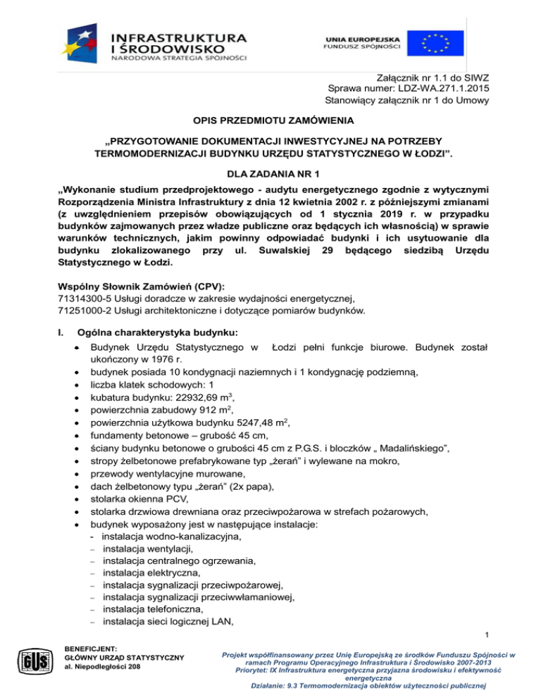 Załącznik nr 1.1 do SIWZ Sprawa numer: LDZ-WA.271.1.2015 Stanowiący załącznik nr 1 do Umowy OPIS PRZEDMIOTU ZAMÓWIENIA „PRZYGOTOWANIE DOKUMENTACJI INWESTYCYJNEJ NA POTRZEBY TERMOMODERNIZACJI BUDYNKU URZĘDU STATYSTYCZNEGO W ŁODZI”. DLA ZADANIA NR 1 „Wykonanie studium przedprojektowego - audytu energetycznego zgodnie z wytycznymi Rozporządzenia Ministra Infrastruktury z dnia 12 kwietnia 2002 r. z późniejszymi zmianami (z uwzględnieniem przepisów obowiązujących od 1 stycznia 2019 r. w przypadku budynków zajmowanych przez władze publiczne oraz będących ich własnością) w sprawie warunków technicznych, jakim powinny odpowiadać budynki i ich usytuowanie dla budynku zlokalizowanego przy ul. Suwalskiej 29 będącego siedzibą Urzędu Statystycznego w Łodzi. Wspólny Słownik Zamówień (CPV): 71314300-5 Usługi doradcze w zakresie wydajności energetycznej, 71251000-2 Usługi architektoniczne i dotyczące pomiarów budynków. I. Ogólna charakterystyka budynku: Budynek Urzędu Statystycznego w Łodzi pełni funkcje biurowe. Budynek został ukończony w 1976 r. budynek posiada 10 kondygnacji naziemnych i 1 kondygnację podziemną, liczba klatek schodowych: 1 kubatura budynku: 22932,69 m3, powierzchnia zabudowy 912 m2, powierzchnia użytkowa budynku 5247,48 m2, fundamenty betonowe – grubość 45 cm, ściany budynku betonowe o grubości 45 cm z P.G.S. i bloczków „ Madalińskiego”, stropy żelbetonowe prefabrykowane typ „żerań” i wylewane na mokro, przewody wentylacyjne murowane, dach żelbetonowy typu „żerań” (2x papa), stolarka okienna PCV, stolarka drzwiowa drewniana oraz przeciwpożarowa w strefach pożarowych, budynek wyposażony jest w następujące instalacje: - instalacja wodno-kanalizacyjna, instalacja wentylacji, instalacja centralnego ogrzewania, instalacja elektryczna, instalacja sygnalizacji przeciwpożarowej, instalacja sygnalizacji przeciwwłamaniowej, instalacja telefoniczna, instalacja sieci logicznej LAN, 1 BENEFICJENT: GŁÓWNY URZĄD STATYSTYCZNY al. Niepodległości 208 00-925 Warszawa Projekt współfinansowany przez Unię Europejską ze środków Funduszu Spójności w ramach Programu Operacyjnego Infrastruktura i Środowisko 2007-2013 Priorytet: IX Infrastruktura energetyczna przyjazna środowisku i efektywność energetyczna Działanie: 9.3 Termomodernizacja obiektów użyteczności publicznej instalacja oświetlenia awaryjnego, instalacja zasilania komputerów, instalacja chłodzenia – pojedyncze pomieszczenia, instalacja odgromowa. Zamawiający umożliwi przeprowadzenie wizji lokalnej w budynku Urzędu Statystycznego w Łodzi mieszczącego się przy ul. Suwalskiej 29 w Łodzi w terminie wskazanym w Specyfikacji Istotnych Warunków Zamówienia. II. 1. 1) Audyt energetyczny Szczegółowy zakres czynności i opracowań niezbędnych do wykonania i odbioru przedmiotu zamówienia obejmuje opracowanie następujących dokumentów: Audyt energetyczny obiektu powinien być wykonany zgodnie z: A. Rozporządzeniem Ministra Infrastruktury z dnia 17 marca 2009 r. w sprawie szczegółowego zakresu i form audytu energetycznego oraz części audytu remontowego, wzorów kart audytów, a także algorytmu oceny opłacalności przedsięwzięcia termomodernizacyjnego (Dz. U. 2009 nr 43 poz. 346). B. Rozporządzeniem Ministra Infrastruktury i Rozwoju z dnia 27 lutego 2015 r. w sprawie metodologii wyznaczania charakterystyki energetycznej budynku lub części budynku oraz świadectw charakterystyki energetycznej (Dz. U. 2015 nr 0 poz. 376). C. Rozporządzeniem Ministra Gospodarki z dnia 10 sierpnia 2012 r. w sprawie szczegółowego zakresu i sposobu sporządzania audytu efektywności energetycznej, wzoru karty audytu efektywności energetycznej oraz metod obliczania oszczędności energii (Dz. U.2012 poz. 962) - w przypadku optymalizacji przedsięwzięć nieprzewidzianych w rozporządzeniach zapisanych w pkt 1 i 2. D. Rozporządzenie Ministra Infrastruktury z dnia 12 kwietnia 2002r z późniejszymi zmianami (z uwzględnieniem przepisów obowiązujących od 1 stycznia 2019 r. w przypadku budynków zajmowanych przez władze publiczne oraz będących ich własnością) w sprawie warunków technicznych, jakim powinny odpowiadać budynki i ich usytuowanie. E. Normami branżowymi i najlepszą wiedzą techniczną - w przypadku optymalizacji przedsięwzięć nieprzewidzianych w rozporządzeniach zapisanych w pkt A, B, C i D. 2) Audyt energetyczny obiektu powinien zawierać: A. stronę tytułową, B. kartę audytu energetycznego budynku, C. wykaz dokumentów i danych źródłowych, z których korzystał audytor oraz wyszczególnienie wytycznych i uwag Zamawiającego, D. część opisową zawierającą: a. ogólne dane techniczne, w tym opis konstrukcji i technologii, niezbędne wskaźniki powierzchniowe i kubaturowe, średnią wysokość kondygnacji, współczynnik kształtu, 2 BENEFICJENT: GŁÓWNY URZĄD STATYSTYCZNY al. Niepodległości 208 00-925 Warszawa Projekt współfinansowany przez Unię Europejską ze środków Funduszu Spójności w ramach Programu Operacyjnego Infrastruktura i Środowisko 2007-2013 Priorytet: IX Infrastruktura energetyczna przyjazna środowisku i efektywność energetyczna Działanie: 9.3 Termomodernizacja obiektów użyteczności publicznej b. c. d. e. f. g. h. i. j. opis wykorzystania obiektu dla charakterystycznych pomieszczeń oraz całego obiektu, ilość osób wykorzystujących obiekt, sytuację z zaznaczonymi stronami świata, opis techniczny podstawowych elementów budynku, w tym w szczególności: ścian zewnętrznych, stropów, stropów nad ostatnią kondygnacją, ścian piwnic, podłóg na gruncie, okien oraz przegród szklanych i przezroczystych, drzwi, dane dotyczące taryf i opłat dla wszystkich nośników energii wykorzystywanych w budynku, charakterystykę systemu grzewczego, w tym w szczególności rodzaj instalacji, izolacja pionów, parametry pracy, rodzaje przewodów, grzejników, zaworów regulacyjnych i