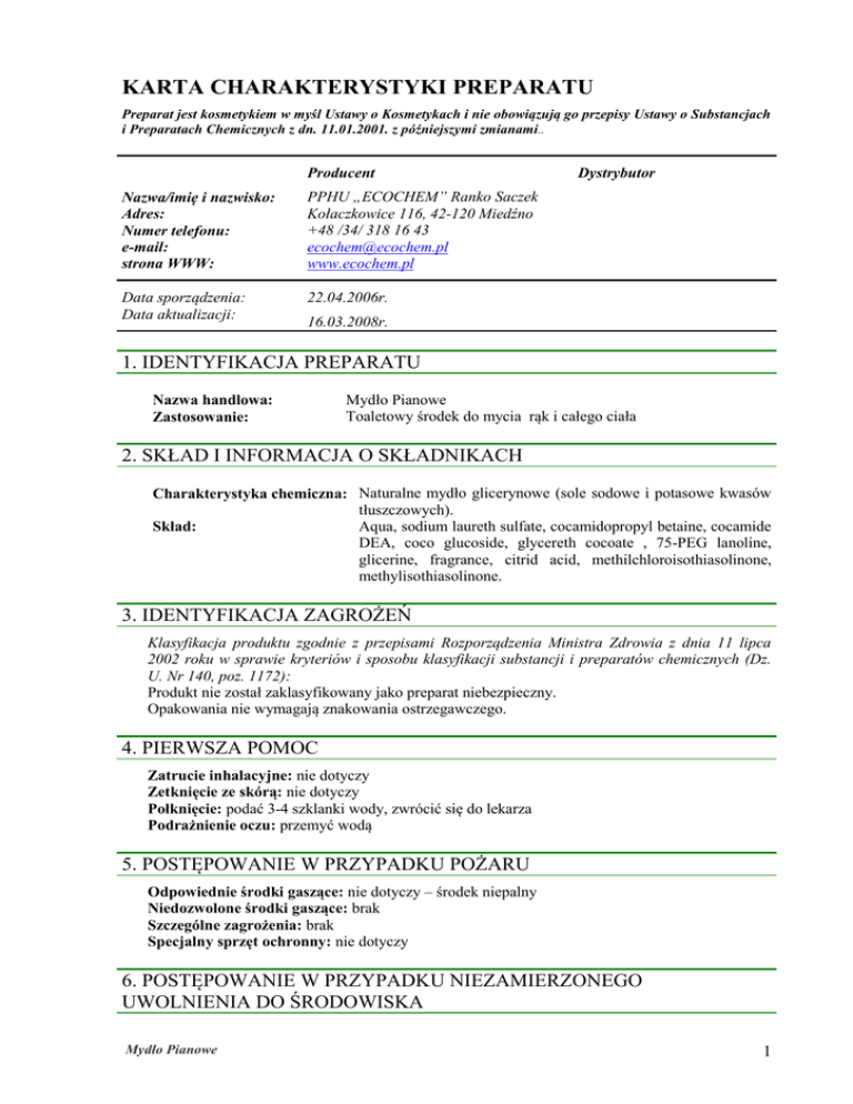 KARTA CHARAKTERYSTYKI PREPARATU Preparat jest kosmetykiem w myśl Ustawy o Kosmetykach i nie obowiązują go przepisy Ustawy o Substancjach i Preparatach Chemicznych z dn. 11.01.2001. z późniejszymi zmianami .. Producent Nazwa/imię i nazwisko: Adres: Numer telefonu: e-mail: strona WWW: PPHU „ECOCHEM” Ranko Saczek Kołaczkowice 116, 42-120 Miedźno +48 /34/ 318 16 43 [email protected] www.ecochem.pl Data sporządzenia: Data aktualizacji: 22.04.2006r. Dystrybutor 16.03.2008r. 1. IDENTYFIKACJA PREPARATU Nazwa handlowa: Zastosowanie: Mydło Pianowe Toaletowy środek do mycia rąk i całego ciała 2. SKŁAD I INFORMACJA O SKŁADNIKACH Charakterystyka chemiczna: Naturalne mydło glicerynowe (sole sodowe i potasowe kwasów tłuszczowych). Aqua, sodium laureth sulfate, cocamidopropyl betaine, cocamide Skład: DEA, coco glucoside, glycereth cocoate , 75-PEG lanoline, glicerine, fragrance, citrid acid, methilchloroisothiasolinone, methylisothiasolinone. 3. IDENTYFIKACJA ZAGROŻEŃ Klasyfikacja produktu zgodnie z przepisami Rozporządzenia Ministra Zdrowia z dnia 11 lipca 2002 roku w sprawie kryteriów i sposobu klasyfikacji substancji i preparatów chemicznych (Dz. U. Nr 140, poz. 1172): Produkt nie został zaklasyfikowany jako preparat niebezpieczny. Opakowania nie wymagają znakowania ostrzegawczego. 4. PIERWSZA POMOC Zatrucie inhalacyjne: nie dotyczy Zetknięcie ze skórą: nie dotyczy Połknięcie: podać 3-4 szklanki wody, zwrócić się do lekarza Podrażnienie oczu: przemyć wodą 5. POSTĘPOWANIE W PRZYPADKU POŻARU Odpowiednie środki gaszące: nie dotyczy – środek niepalny Niedozwolone środki gaszące: brak Szczególne zagrożenia: brak Specjalny sprzęt ochronny: nie dotyczy 6. POSTĘPOWANIE W PRZYPADKU NIEZAMIERZONEGO UWOLNIENIA DO ŚRODOWISKA Mydło Pianowe 1 Indywidualne środki ostrożności: nie dotyczy. Środki ostrożności w zakresie ochrony środowiska: Powstrzymać wyciek. Nie dopuszczać do przedostawania się produktu do kanalizacji, wód powierzchniowych i wód gruntowych. W przypadku uwolnienia dużych ilości produktu lub skażenia środowiska powiadomić odpowiednie władze i służby ratownictwa chemicznego. Metody oczyszczania/usuwania: Wycieki preparatu przysypać materiałem pochłaniającym (piasek, ziemia okrzemkowa, uniwersalne środki wiążące, trociny) i zebrać do oznakowanego, szczelnie zamykanego pojemnika na odpady. 7. POSTĘPOWANIE Z PREPARATEM I JEGO MAGAZYNOWANIE Postępowanie z preparatem: Przestrzegać zasad i przepisów BHP. Przechowywać w oryginalnych, szczelnie zamkniętych pojemnikach. Zapewnić odpowiednią wentylację pomieszczeń roboczych. Magazynowanie: Przechowywać w oryginalnych pojemnikach w chłodnym i suchym pomieszczeniu. Chronić przed zamarzaniem. Nie przechowywać razem z żywnością, paszą i napojami. 8. KONTROLA NARAŻENIA I ŚRODKI OCHRONY INDYWIDUALNEJ Najwyższe dopuszczalne stężenie w środowisku pracy: nie dotyczy Ochrona układu oddechowego: nie dotyczy Ochrona skóry: nie dotyczy Ochrona oczu: nie dotyczy 9. WŁAŚCIWOŚCI FIZYKOCHEMICZNE Postać: płyn Kolor: lekko różowy Zapach: charakterystyczny do użytej kompozycji zapachowej Temperatura krzepienia: -4C Temperatura zapłonu: środek niepalny Gęstość: przy 20C – 0,05 +/- 0,002g/cm3 Rozpuszczalność w wodzie: całkowita Wartość pH: przy 20C roztwór 1% pH 5.5 – 6.0 10. STABILNOŚĆ I REAKTYWNOŚĆ Okres gwarancji: 24 miesiące Niebezpieczne reakcje: brak Niebezpieczne produkty rozpadu: brak 11. INFORMACJE TOKSYKOLOGICZNE Na skórze: nie powoduje podrażnień Oczy: w razie podrażnień przemyć wodą Uczulenia: nie ma danych o działaniu uczulającym 12. INFORMACJE EKOLOGICZNE Preparat nie jest szkodliwy dla środowiska. Składniki zawarte w produkcie łatwo ulegają biodegradacji. 13. POSTĘPOWANIE Z ODPADAMI Produkt: typowy środek do mycia Mydło Pianowe 2 Opakowanie: po dokładnym wypłukaniu wodą może być użyte ponownie w systemie recyklingu 14. INFORMACJE O TRANSPORCIE Transport drogowy i kolejowy ADR/RID: Preparat nie jest materiałem niebezpiecznym w świetle stosowanych przepisów. Transport wodami śródlądowymi ADN/ADNR: Preparat nie jest materiałem niebezpiecznym w świetle stosowanych przepisów. Transport morski IMO/IMDG: Preparat nie jest materiałem niebezpiecznym w świetle stosowanych przepisów. Transport powietrzny ICAO/IATA: Preparat nie jest materiałem niebezpiecznym w świetle stosowanych przepisów. 15. INFORMACJE DOTYCZĄCE PRZEPISÓW PRAWNYCH Wszelkie prace z tym produktem należy wykonywać zgodnie z przepisami działu IV rozdziału 6 lit. D rozporządzenia Ministra pracy i Polityki Socjalnej z dnia 26 września 1997 roku w sprawie ogólnych przepisów bezpieczeństwa i higieny pracy (Dz. U. Nr 129 poz. 844). Przy stosowaniu i magazynowaniu tego produktu należy przestrzegać przepisów rozporządzenia Ministra Spraw Wewnętrznych z dnia 3 listopada 1992 roku w sprawie ochrony przeciwpożarowej budynków, innych obiektów budowlanych i terenów (Dz. U. Nr 92 poz. 460 ze zm. w Dz. U. Z 1995 roku Nr 102 poz. 507). Znakowanie opakowań jednostkowych zgodnie z przepisami Rozporządzenia Ministra Zdrowia z dnia 11 lipca 2002 roku w sprawie oznakowania opakowań substancji niebezpiecznych i preparatów niebezpiecznych (Dz. U. Nr 140 poz. 1173): Nie jest wymagane, ponieważ produkt nie został zakwalifikowany jako preparat niebezpieczny. 16. INNE INFORMACJE Powyższe informacje są opracowane w oparciu o bieżący stan wiedzy i dotyczą produktu w postaci w jakiej jest stosowany. Dane dotyczące tego produktu przedstawiono w celu uwzględnienia wymogów bezpieczeństwa, a nie zagwarantowania jago szczególnych właściwości. W przypadku, gdy warunki stosowania produktu nie znajdują się pod kontrolą producenta, odpowiedzialność za bezpieczne stosowanie produktu spada na użytkownika. Niniejsza karta charakterystyki preparatu opracowana została na podstawie obowiązujących w Polsce przepisów dotyczących substa