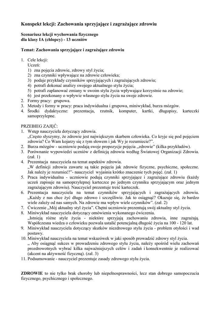 Konspekt lekcji: Zachowania sprzyjające i zagra ające zdrowiu