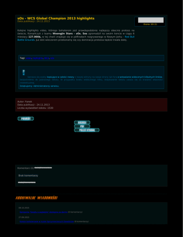 sOs - WCS Global Champion 2013 highlights Data publikacji : 24.11.2013 Ocena: 5/5 (1) Kolejne highlights video, którego bohaterem jest prawdopodobnie najlepszy obecnie protoss na świecie, Koreańczyk z teamu Woongjin Stars - sOs. Sos zgromadził na swoim koncie w ciągu 6 miesięcy 127.000$, w tej chwili znajduje się w półfinałach rozgrywanego w Nowym Jorku - Red Bull Battle Grounds. Już dziś wieczorem przekonamy się czy dominacja protossa będzie trwała dalej. Tagi: video, highlights, WCS, sOs Uprasza się osoby kopiujące w całości newsy z naszej witryny na swoje strony lub fora o wstawianie widocznych klikalnych linków, bezpośrednio do pobranego tekstu. W przypadku braku widocznego linku, skopiowanie tekstu uważa się za kradzież własności intelektualnej. Dziękujemy: Administratorzy serwisu. Autor: Fanek Data publikacji : 24.11.2013 Liczba wyświetleń tekstu: 1530 Komentarz (0) dodaj komentarz Brak komentarzy dodaj komentarz 08.10.2015 Kampania "Szepty o zagładzie" dostępna za darmo (0 komentarzy) 27.09.2015 Kolejni bohaterowie w trybie Sprzymierzonych Dowódców (0 komentarzy) 22.09.2015 Cyfrowe gadżety za udział w BlizzCon 2015 (0 komentarzy) 15.07.2015 Legacy of the Void dostępne w przedsprzedaży! (0 komentarzy) 17.06.2015 Informacje z E3 - prolog kampanii Legacy of the Void (0 komentarzy) 30.05.2015 WCS Europe - sobota (30 maja) 18.00 grupa G - MaNa! (0 komentarzy) 07.05.2015 DreamHack Open France 2015 - już 8 maja - MaNa! (0 komentarzy) 03.05.2015 Na wesoło: postacie E-sportu 50 (0 komentarzy) 03.05.2015 IEM Katowice 2015 - jeszcze raz! (0 komentarzy) 03.05.2015 KeSPA Cup 2015 Season 1 - live! (0 komentarzy) 26.04.2015 Proleague - Top5 gier miesiąca (0 komentarzy) 26.04.2015 CJ Entus wygrywa 2 runde Proleague! (0 komentarzy) 18.04.2015 Wersja beta Legacy of the Void – aktualizacja 2.5.1 (0 komentarzy) 18.04.2015 WCS finals 2015 - galeria (0 komentarzy) 18.04.2015 Omówienie zmian w balansie Legacy of the Void (0 komentarzy) 11.04.2015 WCS Europe kwalifikacje z Polakami - dziś (sobota) 18.00 (0 komentarzy) 11.04.2015 Aktualizacja balansu Heart of the Swarm – 9 kwietnia (0 komentarzy) 11.04.2015 GSL Season1 2015 - galeria (0 komentarzy) 11.04.2015 Zbanowane konta w StarCraft II (0 komentarzy) 04.04.2015 Red Bull Battle Grounds powraca jesienią 2015 (0 komentarzy) (zobacz wszystkie)