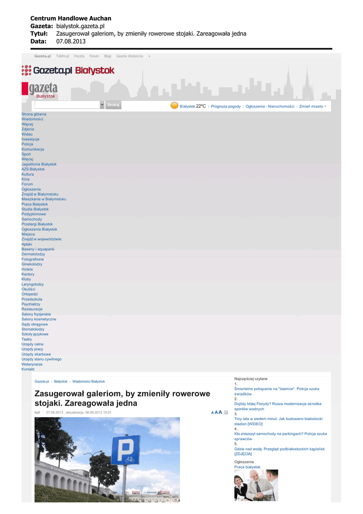 Centrum Handlowe Auchan Gazeta: bialystok.gazeta.pl Tytu³: Zasugerowa³ galeriom, by zmieni³y rowerowe stojaki. Zareagowa³a jedna Data: 07.08.2013 Gazeta.pl Tokfm.pl Poczta Forum Blogi Gazeta Wyborcza Szukaj Białystok 22ºC Prognoza pogody Ogłoszenia - Nieruchomości Zmień miasto Strona główna Wiadomości Więcej Zdjecia Wideo Inwestycje Policja Komunikacja Sport Więcej Jagiellonia Białystok AZS Białystok Kultura Kina Forum Ogłoszenia Znajdź w Białymstoku Mieszkania w Białymstoku Praca Białystok Studia Białystok Podyplomowe Samochody Przetargi Białystok Ogłoszenia Białystok Miejsca Znajdź w województwie: Apteki Baseny i aquaparki Dermatolodzy Fotografowie Ginekolodzy Hotele Kantory Kluby Laryngolodzy Okuliści Ortopedzi Przedszkola Psychiatrzy Restauracje Salony fryzjerskie Salony kosmetyczne Sądy okręgowe Stomatolodzy Szkoły językowe Teatry Urzędy celne Urzędy pracy Urzędy skarbowe Urzędy stanu cywilnego Weterynarze Kontakt Gazeta.pl Białystok Wiadomości Białystok Zasugerował galeriom, by zmieniły rowerowe stojaki. Zareagowała jedna tuli 07.08.2013 , aktualizacja: 06.08.2013 19:31 A AA Najczę ściej czytane 1. Śmiertelne potrącenie na "ósemce". Policja szuka świadków 2. Dojlidy bliżej Florydy? Rusza modernizacja ośrodka sportów wodnych 3. Trzy lata w siedem minut. Jak budowano białostocki stadion [WIDEO] 4. Kto zniszczył samochody na parkingach? Policja szuka sprawców 5. Gdzie nad wodę. Przegląd podbiałostockich kąpielisk [ZDJĘCIA] Ogłoszenia Praca białystok Centrum Handlowe Auchan Gazeta: bialystok.gazeta.pl Tytu³: Zasugerowa³ galeriom, by zmieni³y rowerowe stojaki. Zareagowa³a jedna Data: 07.08.2013 Sprzedaż: sprawdź oferty Logistyka i transport Praca w finansach STUDIA I SZKOLENIA Świetna praca po... Najbardziej oblegany Interesujące szkolenia Nieruchomości Stojaki na rowery w kształcie litery "U" (Fot. antonina) Czytelnik "Gazety", miłośnik dwóch kółek, zwrócił się z prośbą do białostockich galerii handlowych, by wymieniły obecne stojaki - tzw. "wyrwikółka" - na wygodniejsze. Odpowiedziała tylko jedna Piaski Towarowa, 40 m2 Antoniuk, 55 m2 Dziesięciny, 60 m2 Motoryzacja Nasz czytelnik (imię i nazwisko - do wiadomości redakcji) jeszcze zimą napisał maile do czterech białostockich galerii handlowych. - W imieniu wszystkich klientów-rowerzystów zwróciłem się do zarządów galerii z prośbą o wymianę stojących przy budynkach niewygodnych i niebezpiecznych stojaków rowerowych [tzw. wyrwikółek red.] na znacznie lepsze - w kształcie odwróconej litery "U". Lub dostawienie takich do już istniejących. Odpowiedź pozytywną dostałem jedynie od galerii Auchan Hetmańska - informuje Czytelnik w mailu do "Gazety". I jak dodaje - wiosną faktycznie stanęły tam cztery dodatkowe, wygodne stojaki. - Pozostałe galerie jednak nie odpowiedziały mi wcale - pisze Czytelnik. Kiedy teraz przypominamy o jego prośbie galeriom, te dwie największe odpowiadają że: albo już dostawiły nowe stojaki (nie precyzując jaki model), albo pomyślą o tym przy okazji przeprowadzanych modernizacji. - Stojaki rowerowe znajdujące się przy Alfa Centrum wykonane są według obowiązującego od dnia otwarcia wzoru. Wychodząc naprzeciw oczekiwaniom klientów poruszających się rowerami, wiosną tego roku dostawiliśmy kolejnych pięć. W sumie na terenie naszego centrum znajduje się w chwili obecnej 9 stojaków rowerowych oraz dodatkowo 5 stojaków rowerowych dla naszych pracowników podaje Jolanta Karna, dyrektor Alfa Centrum Od Galerii Atrium Biała dostajemy zapewnienie, że: - Z uwagą przyjmujemy wszelkie sugestie dotyczące funkcjonowania centrum, zwłaszcza ze strony naszych klientów. Dlatego przy planowaniu modernizacji infrastruktury rowerowej wokół centrum uwzględnimy również zaproponowane rozwiązania w kontekście stojaków - informuje Katarzyna Mituła z biura prasowego Atrium Biała. ZOBACZ TAKŻE Białystok na BiKeRy. Białostockie Rowery Miejskie Szpilki na rowerze. Eskapada się wystroiła [ZDJĘCIA] Rowerzyści na ścieżce grzęźli w piachu. Czyścioch zapłaci karę Zobacz więcej na temat: interwencje Gazety galeria handlowa Białystok Kolej zwalcza cyklistów. Poseł na rowerze chce walczyć z koleją Piękny Nissan 350 Z Auto lidera Feel Auta do 10 tysięcy Centrum Handlowe Auchan Gazeta: bialystok.gazeta.pl Tytu³: Zasugerowa³ galeriom, by zmieni³y rowerowe stojaki. Zareagowa³a jedna Data: 07.08.2013 Zasugerował galeriom, by zmieniły rowerowe stojaki. Zareagowała jedna Szabas, wehikuł czasu, historia ukryta w przedmiotach. Zapisz się na warsztaty Obława Augustowska. Rosja nie pomoże. Rodziny walczą dalej Wielka Orkiestra Świątecznej Pomocy grała dla seniorów. Sprzęt już jest Na co wydać środki z UE w ciągu najbliższych 6 lat? Konsultacje społeczne Uczymy się haftować na warsztatach w skansenie. Zapisy trwają Śmiertelne potrącenie na "ósemce". Policja szuka świadków 0 Podziel się Dodaj komentarz Na skróty: Gazeta.pl Wiadomości Sport.pl Biznes Gazeta Wyborcza Praca Program TV Polecamy: Miasta Wpadki Policja Program TV Pogoda Tematy Wideo Wyniki Lotto Newsletter Facebook RSS Poczta Copyright (c) Agora SA O nas Staże u nas Reklama Prywatność Wszystkie artykuły Licencje Poleć stronę Zgłoś błąd Wyślij e-mailem Kup licencję