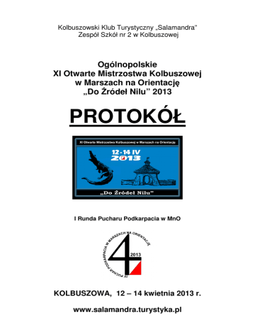 Kolbuszowski Klub Turystyczny „Salamandra” Zespół Szkół nr 2 w Kolbuszowej Ogólnopolskie XI Otwarte Mistrzostwa Kolbuszowej w Marszach na Orientację „Do Źródeł Nilu” 2013 PROTOKÓŁ I Runda Pucharu Podkarpacia w MnO KOLBUSZOWA, 12 – 14 kwietnia 2013 r. www.salamandra.turystyka.pl 1. INSTYTUCJE WSPIERAJĄCE: - Urząd Miejski w Kolbuszowej Nadleśnictwo Kolbuszowa, 2. ORGANIZATOR: - Kolbuszowski Klub Turystyczny „SALAMANDRA” Zespół Szkół nr 2 w Kolbuszowej, 3. CELE MARSZY: - popularyzacja turystycznych imprez na orientację jako doskonalej formy wypoczynku, wymiana doświadczeń przez sympatyków imprez na orientację praktyczne potwierdzenie własnych umiejętności w posługiwaniu się mapą i kompasem rozegranie I rundy Pucharu Podkarpacia w Marszach na Orientację odkrywanie walorów krajoznawczych okolic Kolbuszowej przyznanie punktów do klasyfikacji Pucharu Podkarpacia we wszystkich kategoriach 4. TERMIN, MIEJSCE I BAZA Marsze odbyły się w dniach 12 – 14 kwietnia 2013 r. w okolicach Kolbuszowej (Kopcie, Poręby Dymarskie). Bazą Marszy był budynek Zespołu Szkół nr 2 w Kolbuszowej. 5. ZESPÓŁ ORGANIZACYJNY: Kierownik imprezy: Paweł Michno PInO 654 Sędzia Główny: Mirosław Marek PInO 646 Sekretariat i obliczenia: Dorota Haptaś PInO 670 Sekretariat, obsługa startu/mety: Katarzyna Maziarz, Marcin Maziarz, Karol Kabała, Maciej Kutyła, Jadwiga Czachor, Barbara Batory Budowa tras: - Mirosław Marek PInO 646 - Mateusz Styga PInO 677 - Rafał Rzeszutek MPInO 689 - Jakub Zieliński MPInO 690 - Katarzyna Maliborska MPInO 672 - Jakub Trętowicz - Rafał Mierzejewski - Kamil Ryło - Patrycja Łyżeń - Katarzyna Bajor 6. POGODA: Noc: Temperatura ok. 6-10 stopni Celsjusza, pochmurno, przelotne opady. Dzień: Wszystkie etapy rozegrano przy sprzyjających warunkach atmosferycznych, temperatura optymalna ok. 14-18 st. Celsjusza, początkowo pogodnie, później wzrost zachmurzenia aż do wystąpienia przelotnych opadów deszczu. 7. MAPY I TEREN: Mapy kolorowe, różnorako przekształcane, skala różna, częściowo aktualizowane ze wspólnymi elementami graficznymi. 8. PUNKTY DO KSIĄŻECZEK OInO: Kat. TS, TJ, TM,: 4 x 3 pkt. do Odznaki Imprez na Orientację, kat. TD: 2 x 3 pkt. do OInO. Konkurencje towarzyszące: MiniInO: 2 x 1 pkt +: MiniInO dla TD: 2 x 1 pkt. do OInO. 9. ETAPY: Etap Nazwa TD1 "FaraInO" TD2 "PiraInO" TM1 "Piramidka" TM2 "Oscylopiramidino" TM3 "Znajdź różnicę" "Mapa z kwadratami" TM4 TJ1 "Andy 1:35" TJ2 "Krokodyl" TJ3 "Cheops" TJ4 "High or Low" TS1 "Andy 1:35" TS2 "Krokodyl" TS3 TS4 "Prawie jak Wielkanoc" "Hej-hops" MiniInO 1 dla TD "Szkołowani" MiniInO 2 dla TD "SzkoInO" MiniInO 3 "Egipski labirynt" MiniInO 4 "InO w Ogródku" IInOPuzzle Budowniczy Rafał Mierzejewski, Kamil Ryło Jakub Zieliński, Rafał Rzeszutek Jakub Zieliński, Rafał Rzeszutek Rafał Mierzejewski, Kamil Ryło Mateusz Styga Katarzyna Maliborska, Jakub Trętowicz Rafał Mierzejewski, Kamil Ryło Jakub Zieliński, Rafał Rzeszutek Mirosław Marek Długość Czas PK OInO 2800m 80+30 10PK 3 3500m 110+30 15 PK 3 3500m 115+35 3400m 120+30 4100m 105+30 16 PK 3 3300m 100+35 16 PK 3 3800m 130+35 10 PK + 3LOP 3 3500m 125+35 18 PK 3 2500m 90+25 18 PK 3 Mateusz Styga Rafał Mierzejewski, Kamil Ryło Jakub Zieliński, Rafał Rzeszutek Katarzyna Maliborska, Jakub Trętowicz Mirosław Marek Patrycja Łyżeń, Katarzyna Bajor, Rafał Rzeszutek Patrycja Łyżeń, Katarzyna Bajor, Jakub Zieliński Mirosław Marek, Rafał Rzeszutek Rafał Rzeszutek Patrycja Łyżeń, Katarzyna Bajor 3900m 85+25 13 PK 3 3800m 120+30 10 PK + 3LOP 3 3500m 115+30 18 PK 3 3300m 85+25 16 PK 3 2500m 80+20 18 PK 3 ? ? 16 PK 1 ? 60+15 24 PK 1 ? ? ? ? 19 PK 1 ? 5 25cz 1 13 PK + 3LOP 8 PK + 5LOP 15 PK 3 3 1 10. ILOŚĆ UCZESTNIKÓW: Kategoria TS: 11 zespołów – 17 osób Kategoria TJ: 11 zespołów – 22 osób Kategoria TM: 13 zespołów – 24 osoby Kategoria TD: 17 zespołów – 35 osób RAZEM: 52 zespołów – 98 osób ORGANIZATORÓW: 18 osób Opiekunowie: 2 osoby RAZEM: 118 osób 11. ŚWIADCZENIA: Podczas imprezy uczestnicy mieli zapewnione: dwa noclegi w warunkach turystycznych, dostęp do pryszniców, gorący posiłek między etapami nocnymi w piątek 12 kwietnia, obiad w sobotę 13 kwietnia, drożdżówka i gorąca herbata między etapami dziennymi, komplet map dla każdego uczestnika, puchary za pierwsze miejsce oraz medale za miejsca 2-3 w kat. TS, TJ, TM, nagrody rzeczowe i dyplomy za miejsca 1-5, odcisk okolicznościowej pieczęci, potwierdzenie punktów do Odznaki InO (maksymalnie 15 pkt = 4 x 3 pkt + 1 pkt za InOPuzzle + 2 x 1 pkt za MiniInO). 12. PUNKTACJA, SĘDZIOWANIE, PROTESTY: Punktacja prowadzona była wg zasad Punktacji i Współzawodnictwa w Turystycznych Imprezach na Orientację KInO ZG PTTK. Na imprezie nie wybrano wśród uczestników członków komisji odwoławczej. Na ręce Sędziego Głównego nie wpłynął żaden protest. 13. IMPREZY TOWARZYSZĄCE Dzieciom w trakcie etapów nocnych zapewniono dwa etapy MiniIno po obiekcie szkolnym i wokół niego. Czas po etapach dziennych wypełniły: 2 etapy MiniInO po odnowionym Rynku oraz Ogródku Jordanowskim oraz gra „InO Puzzle”. W grze tej zawodnik miał za zadanie ułożyć z rozsypanych elementów mapę o wymiarach 5x5 kwadratów w czasie do 5 minut. Po upływie limitu czasu liczono ilość ułożonych elementów. Tradycyjnie, w czasie imprezy można było podjąć skrzynkę geokeszową „KKT Salamandra” (patrz: www.opencaching.pl) 14.WYNIKI: Patrz załącznik 15 .MAPY: Patrz załączniki