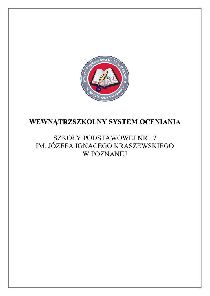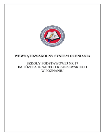 WEWNĄTRZSZKOLNY SYSTEM OCENIANIA SZKOŁY PODSTAWOWEJ NR 17 IM. JÓZEFA IGNACEGO KRASZEWSKIEGO W POZNANIU Podstawa prawna Rozporządzenie MEN z dnia 30 kwietnia 2007 wraz z późniejszymi zmianami w sprawie warunków i sposobów oceniania, klasyfikowania i promowania uczniów i słuchaczy oraz przeprowadzania sprawdzianów i egzaminów w szkołach publicznych. 1. Ocenianiu podlegają: a) osiągnięcia edukacyjne ucznia, b) zachowanie ucznia. 2. Ocenianie osiągnięć edukacyjnych ucznia polega na rozpoznawaniu przez nauczycieli poziomu i postępów w opanowaniu przez ucznia wiadomości i umiejętności w stosunku do wymagań edukacyjnych wynikających z podstawy programowej i realizowanych w szkole programów nauczania uwzględniających tę podstawę. 3. Ocenianie zachowania ucznia polega na rozpoznawaniu przez wychowawcę klasy, nauczycieli oraz uczniów danej klasy stopnia respektowania przez ucznia zasad współżycia społecznego i norm etycznych oraz obowiązków ucznia określonych w Statucie Szkoły Podstawowej Nr 17 w Poznaniu. 4. Ocenianie osiągnięć edukacyjnych i zachowania ucznia odbywa się w ramach oceniania wewnątrzszkolnego. Ma ono na celu: a) informowanie ucznia o poziomie jego osiągnięć edukacyjnych i jego zachowaniu oraz o postępach w tym zakresie, b) udzielanie pomocy uczniowi w samodzielnym planowaniu swojego rozwoju, c) motywowanie ucznia do dalszych postępów w nauce i zachowaniu, d) dostarczenie rodzicom (opiekunom prawnym) i nauczycielom informacji o postępach, trudnościach w nauce, zachowaniu oraz o specjalnych uzdolnieniach ucznia, e) umożliwienie nauczycielom doskonalenia organizacji i metod pracy dydaktyczno – wychowawczej. 5. Ocenianie wewnątrzszkolne obejmuje: a) formułowanie przez nauczycieli wymagań edukacyjnych niezbędnych do uzyskania śródrocznych i rocznych ocen klasyfikacyjnych z obowiązkowych i dodatkowych zajęć edukacyjnych, b) ustalanie kryteriów oceniania zachowania, c) ocenianie bieżące i ustalanie śródrocznych ocen klasyfikacyjnych z obowiązkowych i dodatkowych zajęć edukacyjnych oraz śródrocznej oceny klasyfikacyjnej zachowania, d) przeprowadzanie egzaminów klasyfikacyjnych, poprawkowych, e) ustalanie rocznych ocen klasyfikacyjnych z obowiązkowych i dodatkowych zajęć edukacyjnych oraz rocznej oceny klasyfikacyjnej zachowania, f) ustalenie warunków i trybu uzyskania wyższych niż proponowane rocznych (śródrocznych) ocen klasyfikacyjnych z obowiązkowych i dodatkowych zajęć edukacyjnych oraz rocznej oceny klasyfikacyjnej z zachowania, g) ustalenie warunków i sposobu przekazywania rodzicom (opiekunom prawnym) informacji o postępach i trudnościach ucznia w nauce. Wewnątrzszkolny System oceniania Strona 1 Jawność ocen 6. Nauczyciele na początku każdego roku szkolnego informują uczniów oraz rodziców (opiekunów prawnych) o: a) wymaganiach edukacyjnych niezbędnych do uzyskania poszczególnych śródrocznych i rocznych ocen klasyfikacyjnych z obowiązkowych i dodatkowych zadań edukacyjnych, wynikających z realizowanego przez siebie programu nauczania, b) sposobach sprawdzania osiągnięć edukacyjnych uczniów, c) warunkach i trybie uzyskania wyższej niż przewidywana rocznej (śródrocznej) oceny klasyfikacyjnej z obowiązkowych i dodatkowych zajęć edukacyjnych, 7. Wychowawca klasy na początku każdego roku szkolnego informuje uczniów oraz ich rodziców (prawnych opiekunów) o: a) kryteriach i sposobie oceniania zachowania, b) o skutkach ustalenia uczniowi nagannej rocznej oceny klasyfikacyjnej z zachowania. 8. Oceny są jawne zarówno dla ucznia, jak i jego rodziców (prawnych opiekunów). 9. Sprawdzone i ocenione prace kontrolne uczeń i jego rodzice (prawni opiekunowie) otrzymują do wglądu na zasadach określonych przez poszczególnych nauczycieli. 10. Na wniosek ucznia i jego rodziców (prawnych opiekunów) nauczyciel uzasadnia ustaloną ocenę. Dostosowania 11. Nauczyciel jest zobowiązany, na podstawie opinii publicznej poradni psychologiczno – pedagogicznej, w tym publicznej poradni specjalistycznej, dostosować wymagania edukacyjne do indywidualnych potrzeb psychofizycznych i edukacyjnych ucznia, u którego stwierdzono zaburzenia i odchylenia rozwojowe lub specyficzne trudności w uczeniu się, uniemożliwiające sprostanie tym wymaganiom. 12. W przypadku ucznia posiadającego orzeczenie o potrzebie kształcenia specjalnego albo indywidualnego nauczania dostosowanie wymagań edukacyjnych do indywidualnych potrzeb psychofizycznych i edukacyjnych ucznia może nastąpić na podstawie tego orzeczenia. 13. Przy ustalaniu oceny z wychowania fizycznego, techniki, plastyki i muzyki należy w szczególności brać pod uwagę wysiłek wkładany przez ucznia w wywiązywanie się z obowiązków wynikających ze specyfiki tych zajęć. 14. Dyrektor szkoły zwalnia ucznia z zajęć wychowania fizycznego i informatyki na podstawie opinii o ograniczonych możliwościach uczestniczenia ucznia w tych zajęciach, wydanej przez lekarza oraz na czas określony w tej opinii. 15. W przypadku zwolnienia ucznia z zajęć wychowania fizycznego i informatyki w dokumentacji przebiegu nauczania zamiast oceny klasyfikacyjnej wpisuje się „zwolniony”. Ocenianie 16. Osiągnięcia uczniów są badane za pomocą: a) testów, b) sprawdzianów i prac klasowych, Wewnątrzszkolny System oceniania Strona 2 c) zadań domowych, d) kartkówek, e) prac dodatkowych wykraczających poza program nauczania, f) wypowiedzi ustnych, g) aktywności w czasie lekcji, h) inwencji twórczej, i) osiągnięć w konkursach szkolnych i pozaszkolnych. 17. Godzinne prace kontrolne (testy, sprawdziany i prace klasowe) muszą: a) być zapowiedziane i zapisane w dzienniku lekcyjnym z tygodniowym wyprzedzeniem, b) poprzedzone lekcją powtórzeniową, c) ocenione i omówione w terminie do dwóch tygodni po napisaniu. 18. W ciągu tygodnia mogą być przeprowadzone najwyżej trzy godzinne prace kontrolne (w ciągu dnia może się odbyć tyl