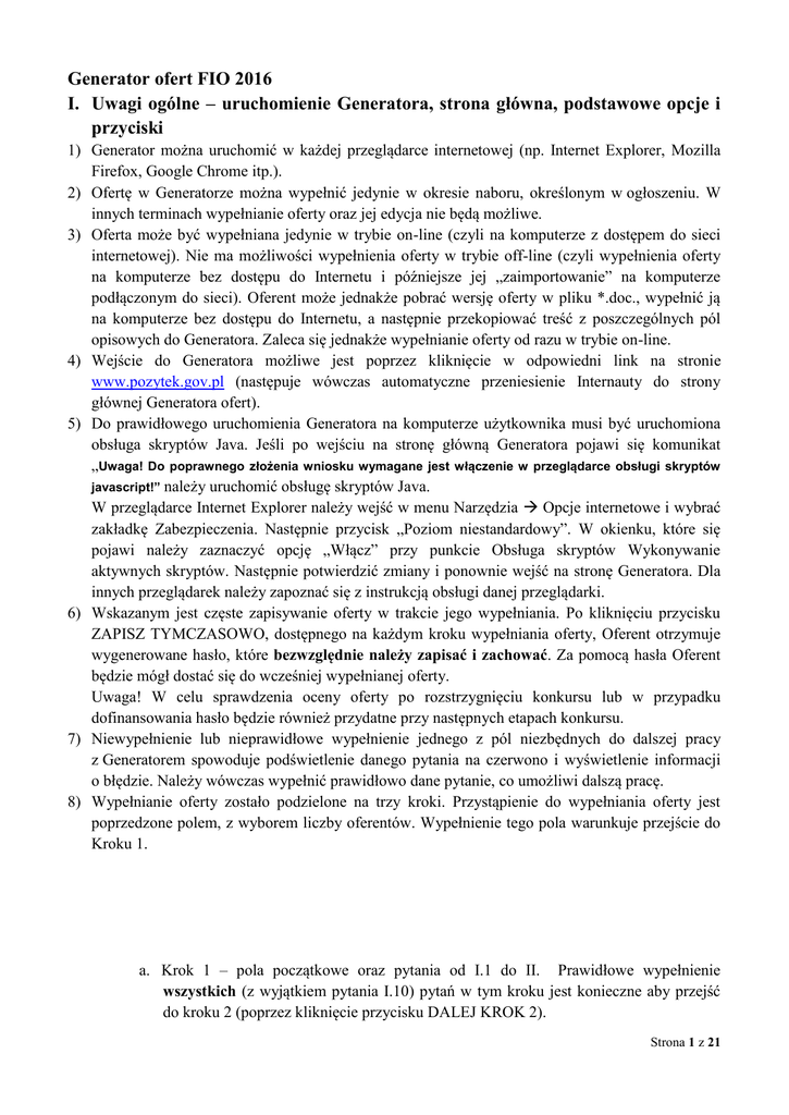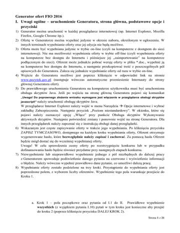 Generator ofert FIO 2016 I. Uwagi ogólne – uruchomienie Generatora, strona główna, podstawowe opcje i przyciski 1) Generator można uruchomić w każdej przeglądarce internetowej (np. Internet Explorer, Mozilla Firefox, Google Chrome itp.). 2) Ofertę w Generatorze można wypełnić jedynie w okresie naboru, określonym w ogłoszeniu. W innych terminach wypełnianie oferty oraz jej edycja nie będą możliwe. 3) Oferta może być wypełniana jedynie w trybie on-line (czyli na komputerze z dostępem do sieci internetowej). Nie ma możliwości wypełnienia oferty w trybie off-line (czyli wypełnienia oferty na komputerze bez dostępu do Internetu i późniejsze jej „zaimportowanie” na komputerze podłączonym do sieci). Oferent może jednakże pobrać wersję oferty w pliku *.doc., wypełnić ją na komputerze bez dostępu do Internetu, a następnie przekopiować treść z poszczególnych pól opisowych do Generatora. Zaleca się jednakże wypełnianie oferty od razu w trybie on-line. 4) Wejście do Generatora możliwe jest poprzez kliknięcie w odpowiedni link na stronie www.pozytek.gov.pl (następuje wówczas automatyczne przeniesienie Internauty do strony głównej Generatora ofert). 5) Do prawidłowego uruchomienia Generatora na komputerze użytkownika musi być uruchomiona obsługa skryptów Java. Jeśli po wejściu na stronę główną Generatora pojawi się komunikat „Uwaga! Do poprawnego złożenia wniosku wymagane jest włączenie w przeglądarce obsługi skryptów javascript!” należy uruchomić obsługę skryptów Java. W przeglądarce Internet Explorer należy wejść w menu Narzędzia Opcje internetowe i wybrać zakładkę Zabezpieczenia. Następnie przycisk „Poziom niestandardowy”. W okienku, które się pojawi należy zaznaczyć opcję „Włącz” przy punkcie Obsługa skryptów Wykonywanie aktywnych skryptów. Następnie potwierdzić zmiany i ponownie wejść na stronę Generatora. Dla innych przeglądarek należy zapoznać się z instrukcją obsługi danej przeglądarki. 6) Wskazanym jest częste zapisywanie oferty w trakcie jego wypełniania. Po kliknięciu przycisku ZAPISZ TYMCZASOWO, dostępnego na każdym kroku wypełniania oferty, Oferent otrzymuje wygenerowane hasło, które bezwzględnie należy zapisać i zachować. Za pomocą hasła Oferent będzie mógł dostać się do wcześniej wypełnianej oferty. Uwaga! W celu sprawdzenia oceny oferty po rozstrzygnięciu konkursu lub w przypadku dofinansowania hasło będzie również przydatne przy następnych etapach konkursu. 7) Niewypełnienie lub nieprawidłowe wypełnienie jednego z pól niezbędnych do dalszej pracy z Generatorem spowoduje podświetlenie danego pytania na czerwono i wyświetlenie informacji o błędzie. Należy wówczas wypełnić prawidłowo dane pytanie, co umożliwi dalszą pracę. 8) Wypełnianie oferty zostało podzielone na trzy kroki. Przystąpienie do wypełniania oferty jest poprzedzone polem, z wyborem liczby oferentów. Wypełnienie tego pola warunkuje przejście do Kroku 1. a. Krok 1 – pola początkowe oraz pytania od I.1 do II. Prawidłowe wypełnienie wszystkich (z wyjątkiem pytania I.10) pytań w tym kroku jest konieczne aby przejść do kroku 2 (poprzez kliknięcie przycisku DALEJ KROK 2). Strona 1 z 21 b. Krok 2 – pytania od III.1 do III.10. Wypełnienie wszystkich pytań w tym kroku jest konieczne aby przejść do kroku 3 (poprzez kliknięcie przycisku DALEJ KROK 3). c. Krok 3 – pytania od IV do pól końcowych. W kroku 3 możliwe jest zweryfikowanie prawidłowości jego wypełnienia (poprzez kliknięcie przycisku SPRAWDŹ POPRAWNOŚĆ DANYCH) oraz złożenia oferty, poprzez kliknięcie przycisku ZŁÓŻ OFERTĘ. 9) Na stronie głównej dostępne są następujące opcje: Złóż ofertę – kliknięcie umożliwia przejście do podstrony na której można wypełnić ofertę on-line. Kontynuacja składania oferty – kliknięcie umożliwia powrót do wypełnianej wcześniej oferty, gdy z jakiegoś powodu Oferent przerwał wcześniej jej wypełnianie – Oferent zostanie poproszony o podanie hasła. Opcja ta działa jedynie, gdy Oferent zapisał wcześniej ofertę. 10) W każdej chwili Oferent ma możliwość wydrukowania wypełnianej oferty. W takim przypadku należy tymczasowo ją zapisać, a następnie kliknąć przycisk WYDRUK ROBOCZY – pojawi się kolejne okno umożliwiające wydrukowanie oferty (bądź zapisanie jej w formacie tekstowym). 11) W kroku 2 istnieje możliwość powrotu do kroku 1. W tym celu należy kliknąć przycisk POWRÓT DO KROKU 1. 12) W kroku 3 istnieje możliwość powrotu do kroku 1 lub powrotu do kroku 2. W tym celu należy kliknąć przycisk POWRÓT DO KROKU 1 lub przycisk POWRÓT DO KROKU 2. UWAGA! Przechodzenie pomiędzy poszczególnymi krokami jest możliwe jedynie poprzez przyciski DALEJ KROK… lub POWRÓT DO KROKU… Dotychczas wpisane dane zostają wówczas zapamiętane. Użycie innych sposobów do powrotu na poprzednią stronę lub przejścia na stronę następną (np. poprzez użycie przycisku „Wstecz” lub „Dalej” w przeglądarce internetowej) spowoduje utratę wpisanych danych!!! Strona 2 z 21 II. Przed przystąpieniem do kroku 1 należy wskazać, ilu oferentów zostało przewidzianych do realizacji projektu. Zadeklarowana liczba oferentów nie podlega zmianie na późniejszym etapie wypełniania oferty. Po wskazaniu liczby oferentów należy użyć przycisku Dalej. III. Wypełnienie danych w kroku 1. Poniżej przedstawiono sposób wypełnienia danych w kroku 1. Strona 3 z 21 1) Pole Tytuł zadania publicznego W tym polu Oferent wpisuje tytuł zadania rozumiany jako tytuł projektu, ustalony, czyli nadany przez Oferenta (nie należy wpisywać nazw priorytetów i kierunków działania wymienionych w rozdziale V dokumentu Programu Fundusz Inicjatyw Obywatelskich na lata 2014-2020, a jedynie właściwy tylko temu projektowi tytuł). 2) Pole Priorytet W polu Priorytet należy wybrać z rozwijanej listy nazwę jedne