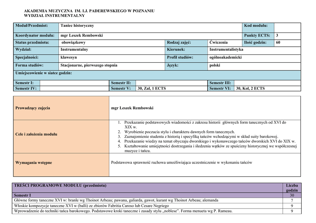 AKADEMIA MUZYCZNA IM. I.J. PADEREWSKIEGO W POZNANIU WYDZIAŁ INSTRUMENTALNY Moduł/Przedmiot: Taniec historyczny Kod modułu: Koordynator modułu: mgr Leszek Rembowski Punkty ECTS: 3 Status przedmiotu: obowiązkowy Rodzaj zajęć: Ćwiczenia Ilość godzin: 60 Wydział: Instrumentalny Kierunek: Instrumentalistyka Specjalności: klawesyn Profil studiów: ogólnoakademicki Forma studiów: Stacjonarne, pierwszego stopnia Język: polski Umiejscowienie w siatce godzin: Semestr I: Semestr IV: Semestr II: Semestr V: Prowadzący zajęcia mgr Leszek Rembowski Cele i założenia modułu Wymagania wstępne 30, Zal, 1 ECTS Semestr III: Semestr VI: 30, Kol, 2 ECTS 1. Przekazanie podstawowych wiadomości z zakresu historii głównych form tanecznych od XVI do XIX w. 2. Wyrobienie poczucia stylu i charakteru dawnych form tanecznych. 3. Zaznajomienie studenta z historią i specyfiką tańców wchodzącymi w skład suity barokowej. 4. Przekazanie wiedzy na temat obyczaju dworskiego i wykonawczego tańców dworskich XVI do XIX w. 5. Kształtowanie umiejętności dostrzegania i śledzenia wątków ze spuścizny historycznej we współczesnej muzyce i tańcu. Podstawowa sprawność ruchowa umożliwiająca uczestniczenie w wykonaniu tańców TREŚCI PROGRAMOWE MODUŁU (przedmiotu) Semestr I Główne formy taneczne XVI w: branle wg Thoinot Arbeau; pawana, galiarda, gawot, kurant wg Thoinot Arbeau; alemanda Włoskie kompozycje taneczne XVI w (balli) ze zbiorów Fabritia Caroso lub Cesare Negriego Wprowadzenie do techniki tańca barokowego. Podstawowe kroki taneczne i zasady stylu „noblese”. Forma menueta wg P. Rameau. Liczba godzin 30 7 9 9 Wykład nt. „Taniec dworski i teatralny XVI do XVIII w - zagadnienia podstawowe” Zasady zapisu tańca XVII i XVIII w wg Raula Augera Feuilleta. Semestr II Poznanie fragmentów kompozycji: kuranta, sarabandy, bourree, gawota, w oparciu o oryginalne choreografie XVII i XVIII w. Wprowadzenie do techniki tanecznej XIXw. Zasady obyczaju tanecznego XIX w Podstawowe figury kontredansa. Polka mazurka wg K. Mastenhausera Wykład nt. „Omówienie podstawowych dworskich i salonowych form tanecznych XVI - XIX w” 2 3 30 18 3 8 1 Kod efektu Wiedza (W) Umiejętności (U) Kompetencje społeczne (K) EFEKTY KSZTAŁCENIA MODUŁU (przedmiotu) W01 Posiada podstawową wiedzę na temat europejskiego repertuaru tańców dworskich i salonowych XVI-XIX w: W02 Posiada elementarną wiedzę na temat różnic w technice ruchu i obyczaju tanecznego XVI-XIX w W03 Zapoznał się z głównymi traktatami tanecznymi ich formą i sposobami zapisu tańca. U01 Potrafi wykonać podstawowe kroki taneczne i łatwe tańce z repertuaru europejskiego XVI-XIX w U02 Rozumie podstawowe różnice stylistyczne między tańcami różnych epok. U03 Korzysta z wiedzy na temat wykonawstwa tanecznego we własnej pracy nad wykonaniem utworów instrumentalnych. K01 Posługuje się podstawową fachową terminologią taneczną XVI-XIXw. K02 Na podstawie własnej wiedzy potrafi odnaleźć różnice stylistyczne między epokami Efekt kształcenia w obszarze kształcenia K_W01 K_W08 K_W14 K_U01 K_U05 K_U03 K_K13 K_K01 Metody kształcenia Metody weryfikacji efektów kształcenia Forma i warunki zaliczenia przedmiotu ćwiczenia praktyczne wykład z prezentacją multimedialną wybranych zagadnień prezentacja nagrań CD i DVD praca w grupach analiza (stadium) przypadków Wymagania końcowe – zaliczenie roku, forma oceny przesłuchanie (wykonawstwo) realizacja zleconych zadań obserwacja pracy na zajęciach Nr efektu W01 K01 U01 W02 K02 U02 W03 U01 U03 U01 U02 K01 U02 W02 K02 U03 W03 Warunki zaliczenia: Zaliczenie przedmiotu uwarunkowane jest uczęszczaniem na zajęcia (kontrola obecności) oraz osiągnięciem wszystkich założonych efektów kształcenia (w minimalnym akceptowalnym stopniu – w wysokości powyżej 50%). Pokaz podstawowych form tańca historycznego; Znajomość podstawowych kroków i tańców XVI-XIX w Warunki egzaminu: Warunkiem przystąpienia do egzaminu lub kolokwium jest uzyskanie zaliczenia z przedmiotu. Warunkiem zdania egzaminu lub kolokwium jest uzyskanie więcej niż 50% przewidzianych punktów. Ocena wyrażana jest w skali od 1 do 25 pkt. obowiązującej w AM w Poznaniu. Inne: Semestr I: Zaliczenie Semestr II: Kolokwium Semestr III: Semestr IV: Semestr V: NAKŁAD PRACY STUDENTA – ILOŚĆ PUNKTÓW ECTS Godziny realizowane przy bezpośrednim udziale nauczyciela Ilość godzin: 60 Zajęcia dydaktyczne: Konsultacje: 2 Ilość godzin egzaminu: 2 Punkty ECTS: 2 0,07 0,06 Semestr VI: akademickiego Ilość godzin samodzielnej pracy studenta w czasie trwania przedmiotu Suma: 64 Przygotowywanie się do zajęć: Przygotowywanie się do ostatecznego zaliczenia/zdania egzaminu: Przygotowywanie się do prezentacji w czasie trwania semestru: Suma: 20 6 x 26 Inne (jeśli dotyczy): Sumaryczny nakład pracy: 90 2,13 (71,11 %) 0,67 0,2 x 0,87 (28,86 %) 3 Literatura podstawowa Drabecka Maria - „Tańce historyczne” zeszyty 1-5 Drabecka Maria - „Choreografia baletów warszawskich za Sasów” PWM Kraków 1988 Turska Irena – „Krótki zarys Historii Tańca i Baletu PWM Kraków 1983 Arbeau Thoinot - „Orchesography” Tłumaczenie Mary Stewart Evans New York 1967 Literatura uzupełniająca B. de Montagut - „Louange de la Danse” Barbara Ravelhofer ; Cambridge 2000 Hilton Wendy - „Dance of Court & Theater” The French Noble Style 1690 -1725; Londyn 1981 Rock Judith - „Terpsichore at Louis-le-Grand” Saint Louis 1996 Anthony James R. - „French Baroque Music” N Y 1964 Donington Robert - „The Interpretation of Early Music” Londyn 1963 Christout Marie-Francoise - „The Court Ballet In France” N Y 1964 Little Meredith, Natalie Jenne - „Dance and the Music of J.S.Bach” Indiana University Press 1991 Dziechcińska Hanna. - “Ciało, strój, gest w czasach renesansu i baroku” Wyd. Naukowe „Semper” W-wa 1996 Biblioteki wirtualne i zasoby on-line MOŻLIWOŚCI KARIERY ZAWODOWEJ Kierownik arty