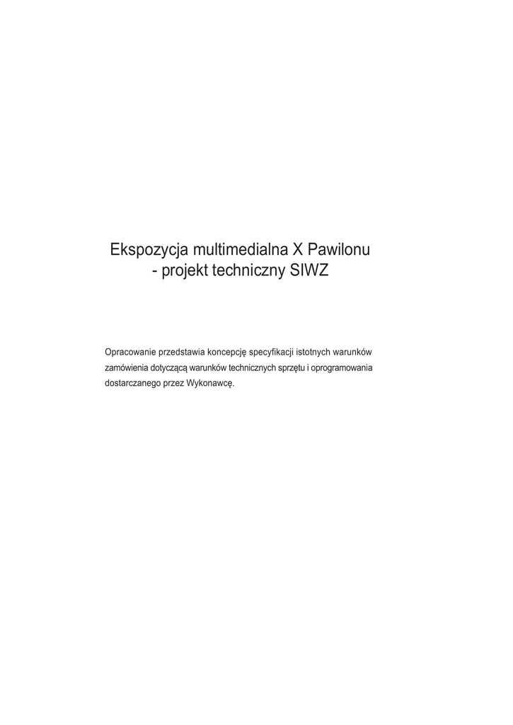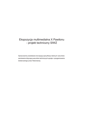 Ekspozycja multimedialna X Pawilonu - projekt techniczny SIWZ Opracowanie przedstawia koncepcję specyfikacji istotnych warunków zamówienia dotyczącą warunków technicznych sprzętu i oprogramowania dostarczanego przez Wykonawcę. Opis przedmiotu zamówienia przedmiot Przy przygotowaniu ogłoszenia o przetargu punkt dotyczący przedmiotu przetargu otrzymuje sformułowanie: Zakres dostawy sprzętu i prac: 1 . Dostawa i uruchomienie wyświetlacza wolnostojącego plenerowego (totem) przy wejściu do X Pawilonu. 2. Dostawa i uruchomienie kiosku multimedialnego na wejściu do X Pawilonu. 3. Dostawa i montaż wyświetlaczy informacyjnych przy ekspozycjach. 4. Dostawa i montaż ekranów LED i projektorów. 5. Dostawa i montaż mini-projektorów wewnętrznych. 6. Dostawa i montaż folii prezentacyjnych. 7. Przygotowanie skalowalnego systemu zarządzania ekspozycjami typu „światło i dźwięk”. 8. Dostawa odbiorników informacji audio/wideo (tablety). 9. Dostawa i montaż znaczników radiowych ekspozycji, synchronizacja z odbiornikami informacji. 10. Instalacja sieci bezprzewodowej i serwerów multimedialnych. 11. D ostawa komputerowego zestawu digitalizacji i realizacji multimedialnych. 12. Przygotowanie systemu propagacji informacji audio/wideo dla zwiedzających. 13. Przygotowanie i uruchomienie systemu zarządzania treścią ekspozycji multimedialnej. Termin realizacji przedmiotu zamówienia: 60 dni od daty podpisania umowy. 2 zamówienia Wstęp – warunki ogólne warunki ogólne Przedmiotem specyfikacji zamówienia są wymagania dotyczące wykonania i odbioru prac związanych z przedmiotem zamówienia - wykonania ekspozycji multimedialnej X Pawilonu. Specyfikacja przedstawiono w dwu częściach (zgodnie z Zakresem dostawy sprzętu i prac): A. dostawę sprzętu wraz z określonymi dla niej uwarunkowaniami - punkty 1-11 Zakresu, B. przygotowanie oprogramowania - punkty 12-13 Zakresu, Prace nad przygotowaniem oprogramowania powinny być prowadzone równolegle z przygotowaniem zestawienia dostarczanego sprzętu, gdyż wymagania oprogramowania mogą wymuszać parametry sprzętowe, z kolei sprzęt użyty przy realizacji może wymagać specjalnych aplikacji. Zamawiający przy odbiorze sprzętu będzie wymagał pełnej funkcjonalności urządzeń, a więc z uruchomionym, chociażby testowym pod względem treści, oprogramowaniem. Zamawiający i Wykonawca ustalą, po przedstawieniu projektu przez Wykonawcę, harmonogram realizacji inwestycji. Zamawiający zastrzega sobie kontrolę poszczególnych etapów realizacji i prawo do testów cząstkowych, wg ustalonego harmonogramu. Zamawiający udostępni dokumentację, plany obiektu, wstępny projekt treści ekspozycji i dostęp do pomieszczeń ekspozycyjnych w celu szczegółowego przygotowania projektu. Wykonawca przedstawi do uzgodnienia projekt montażu urządzeń wg ustalonego harmonogramu. Zamawiający udostępni i przygotuje ekspozycje do prac montażowych zgodnie z przyjętym projektem i harmonogramem. zakres stosowania Zakres stosowania Specyfikacji Specyfikacja obejmuje listę sprzętu ekspozycji, sposób instalacji sprzętu, jego konfigurację do wymaganych zadań, w powiązaniu z poszczególnymi elementami systemu ekspozycyjnego. Koszty zakupu sprzętu komputerowego zawierają koszty oprogramowania standardowego i specjalistycznego oprogramowania treści dla obsługi danego systemu/urządzenia oraz niezbędnych licencji do korzystania ze sprzętu. Wykonawca przedstawia projekt instalacji i montuje urządzenia w miejscach docelowych, zapewniając odpowiednie zasilanie i łączność w ramach systemu dostarczania treści. Wykonawca przeprowadzi i przedstawi wyniki próbnego uruchomienia urządzeń w zakresie wymaganym przez specyfikacje. Wykonawca zapewni serwis bieżący urządzeń, w szczególności związany z oprogramowaniem, jego współpracą z urządzeniami i utrzymaniem ruchu. Wykonawca udziela gwarancji na okres 2 lat na sprzęt i oprogramowanie lub w czasie określonym przez producenta sprzętu. Serwis gwarancyjny i pogwarancyjny powinien być określony w odpowiednich dedykowanych zapisach, zapewniających terminową i sprawną obsługę. 3 A. Warunki ogólne dotyczące zamawianego sprzętu Urządzenia dostarczane w zamówieniu powinny mieć możliwość montażu i demontażu, jeśli są montowane na stałe, przy jednoczesnym zabezpieczeniu przed kradzieżą i wandalizmem. Estetyka urządzeń powinna umożliwiać dostosowanie do istniejącej scenografii muzeum, wtapiając się, na ile to możliwe, w otoczenie. Nie powinny być widoczne elementy reklamy lub nawet identyfikacji marki urządzenia, o ile nie są elementami nieusuwalnymi. Jeśli urządzenia współpracują w systemie jako grupa urządzeń, powinny mieć możliwość skalowania (rozszerzania o dalsze urządzenia), zmiany ich właściwości lub wymiany na sprzęt nowszych generacji. Nie przewiduje się łączności przewodowej. Sterowanie urządzeń powinno być zdalne, nie licząc standardowego wyposażenia obsługi. I. Warunki techniczne obowiązujące dla wszystkich urządzeń Wszystkie urządzenia dostarczane przez Wykonawcę muszą spełniać następujące warunki: -- w przypadku zasilania przewodowego zasilane są z sieci energetycznej AC 230V, warunki dla wszystkich urządzeń -- w przypadku zasilania akumulatorowego Wykonawca zapewnia odpowiednie urządzenia ładujące, -- wszystkie urządzenia stacjonarne muszą spełniać warunki nieprzerwanej pracy min. 10 godzin, bez utraty żywotności, przekraczania standardowych granicznych parametrów temperaturowych i głośności, -- urządzenia wyświetlające dostarczają obraz w standardzie RGB True Color, -- wszystkie urządzenia prezentacji multimedialnej muszą mieć zapewnioną komunikację WiFi o przepustowości minimum 5 MB/sek, -- wszystkie urządzenia prezentacji multimedialnej muszą odtwarzać materiały zakodowane w formatach HTML5 i Flash, -- jeśli urządzenia są obsługiwane przez komputer, to sys
