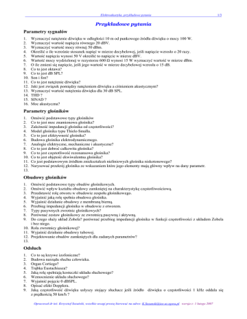 Przykładowe pytania Parametry sygnałów Parametry głośników