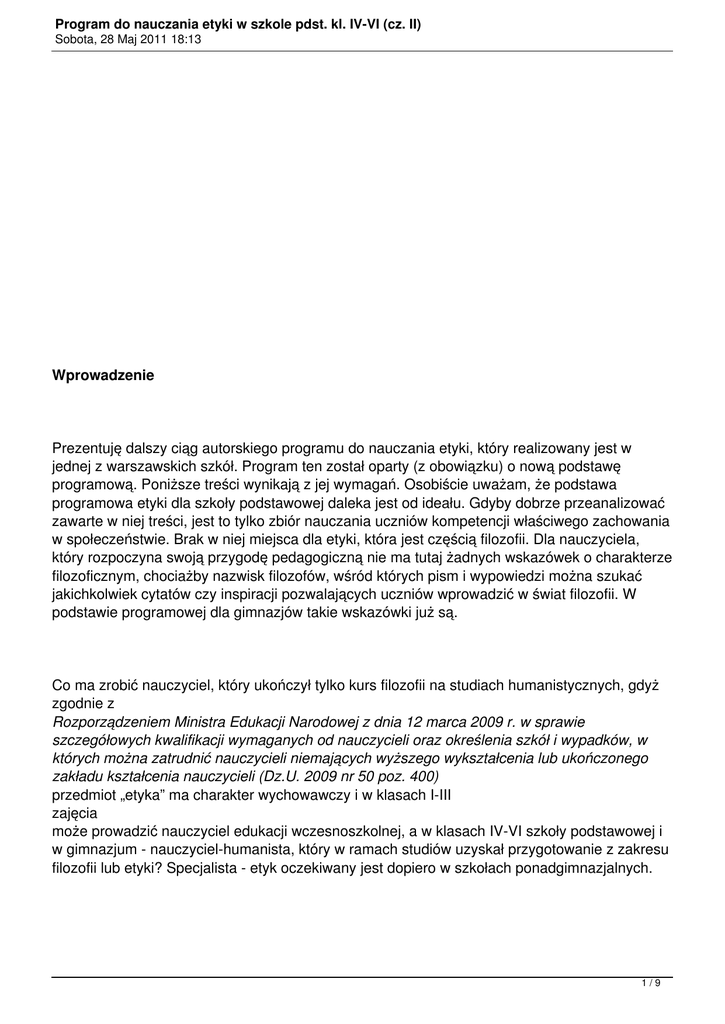 Program do nauczania etyki w szkole pdst. kl. IV-VI (cz. II) Sobota, 28 Maj 2011 18:13 Wprowadzenie Prezentuję dalszy ciąg autorskiego programu do nauczania etyki, który realizowany jest w jednej z warszawskich szkół. Program ten został oparty (z obowiązku) o nową podstawę programową. Poniższe treści wynikają z jej wymagań. Osobiście uważam, że podstawa programowa etyki dla szkoły podstawowej daleka jest od ideału. Gdyby dobrze przeanalizować zawarte w niej treści, jest to tylko zbiór nauczania uczniów kompetencji właściwego zachowania w społeczeństwie. Brak w niej miejsca dla etyki, która jest częścią filozofii. Dla nauczyciela, który rozpoczyna swoją przygodę pedagogiczną nie ma tutaj żadnych wskazówek o charakterze filozoficznym, chociażby nazwisk filozofów, wśród których pism i wypowiedzi można szukać jakichkolwiek cytatów czy inspiracji pozwalających uczniów wprowadzić w świat filozofii. W podstawie programowej dla gimnazjów takie wskazówki już są. Co ma zrobić nauczyciel, który ukończył tylko kurs filozofii na studiach humanistycznych, gdyż zgodnie z Rozporządzeniem Ministra Edukacji Narodowej z dnia 12 marca 2009 r. w sprawie szczegółowych kwalifikacji wymaganych od nauczycieli oraz określenia szkół i wypadków, w których można zatrudnić nauczycieli niemających wyższego wykształcenia lub ukończonego zakładu kształcenia nauczycieli (Dz.U. 2009 nr 50 poz. 400) przedmiot „etyka” ma charakter wychowawczy i w klasach I-III zajęcia może prowadzić nauczyciel edukacji wczesnoszkolnej, a w klasach IV-VI szkoły podstawowej i w gimnazjum - nauczyciel-humanista, który w ramach studiów uzyskał przygotowanie z zakresu filozofii lub etyki? Specjalista - etyk oczekiwany jest dopiero w szkołach ponadgimnazjalnych. 1/9 Program do nauczania etyki w szkole pdst. kl. IV-VI (cz. II) Sobota, 28 Maj 2011 18:13 Dlaczego etyka zostaje sprowadzona do kolejnej godziny wychowawczej? Czy dlatego, że uczniowie w szkole podstawowej (w Polsce!) nie potrafią przyjąć w najprostszej postaci myśli filozofów i założeń etycznych, które rozwijały się przez wieki? Czy etyka w tej formie zostaje sprowadzona do tego, jak należy się zachowywać, jak nie można postępować, czyli do zbioru zakazów i nakazów? W treści nauczania włączyłam zagadnienia bioetyczne i związane z ochroną środowiska, które w ministerialnym dokumencie zostały pominięte, a moje doświadczenie pokazuje jak bliskie i ważne są to treści dla młodych ludzi. Trzeba również pamiętać, aby kształcąc młodego człowieka nauczyć go krytycznego myślenia wobec narzucanych autorytetów, kultury, relacji społecznych, praw i norm. Czasem trzeba wsadzić „kij w mrowisko”, który pobudzi dziecięce umysły i przyzwyczai do tego, że wątpienie i pozytywna kontestacja jest konieczna, aby stać się w pełni świadomym dojrzałym człowiekiem. Prezentowany program jest propozycją, swego rodzaju fundamentem, na bazie którego można wprowadzać własne modyfikacje, co również poczynię, gdyż rok praktycznego nauczania etyki wskazał mi jakie rzeczywiste potrzeby mają uczniowie oraz ich rodzice, jaki kierunek należy obrać, by rozpoczęła się „moda” na etykę. IV. Treści nauczania i umiejętności – wymagania szczegółowe 1. Wstęp – co to jest etyka? a. Narodziny etyki: greckie rozumienie cnoty. Szczęście jako dążenie do doskonałości. Waga wyboru drogi życiowej. Cnota wg Arystotelesa. b. Postępowanie: jak bym postąpił w danej sytuacji. Ocenianie postępowania innych. Powinność i jej znaczenie. 2/9 Program do nauczania etyki w szkole pdst. kl. IV-VI (cz. II) Sobota, 28 Maj 2011 18:13 c. Etyka w życiu codziennym: zadawanie pytań. Dokonywanie wyborów. Nawyki i zwyczaje. d. Normy: normy etyczne i prawo. e. Czym jest wartość? Obiektywizm wartości. Życiowe wybory między wartościami. 2. Poznawanie siebie, dostrzeganie cech indywidualnych własnych i najbliższych osób. a. Poznawanie samego siebie: opisywanie postaci. Tożsamość. Zagadnienie tego, kim jesteśmy. Jak oceniają nas inni i na jakiej podstawie. Jak ważne jest imię. Co to znaczy „być sobą”? Trudności z ustaleniem odpowiedzi na pytanie: „Jak być sobą?”. Waga poznania samego siebie. 3. Wyjaśnianie prawdziwego znaczenia własnych zachowań oraz ich przyczyn i konsekwencji. a. Konsekwencje. Stawianie warunków. Wyrządzanie krzywdy i jej doznawanie. Etyczny wybór. b. Kłamstwo i prawda. Wydawanie sądów. Czy dobro i zło zależą od sytuacji? Pojęcia: dobra, odwagi, bohaterstwa. Moralność jako coś, co musimy wydobyć z siebie. c. Dlaczego postępuję w jakiś sposób? Nasze zachowanie wobec kogoś. Poczucie winy, lekceważenie, 4. Człowiek jako osoba, godność człowieka. 3/9 Program do nauczania etyki w szkole pdst. kl. IV-VI (cz. II) Sobota, 28 Maj 2011 18:13 a. Człowieczeństwo: próba zdefiniowania człowieka. Natura człowieka. b. Rozważania o śmierci: dzieci chore i najbliżsi, śmierć w mediach i filmach. Oswajanie się ze śmiercią bliskich osób. W jakim sensie śmierć czyni nas istotami ludzkimi? c. Miłość: moc miłości. Potrzeba miłości. Miłość w literaturze i sztuce. Rodzaje miłości. d. Prawda: różne znaczenia słowa „prawda”. Zdania prawdziwe. Paradoksy i zagadki związane z prawdą. e. Tolerancja: inność w grupie. Pozytywny ideał tolerancji. My i nietolerancja. Tolerancja a obojętność. f. Zło: istnienie zła. Pojęcie zła moralnego. Szukanie usprawiedliwień. Niezawinione cierpienie. 5. Przyjmowanie odpowiedzialności za siebie. a. Odpowiedzialność: różne rodzaje odpowiedzialności. Sumienie. Granice odpowiedzialności. 6. Prawa i obowiązki, zasady i reguły postępowania, w tym także w ruchu drogowym. a. Lista praw i obowiązków (szkolne, prawa człowieka i dziecka, prawo karne, ruch drogowy, dekalog, obowiązki domowe). b. Prawa a zasady. 4/9 Program do nauczania etyki w szkole 