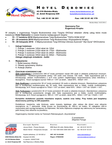 H O T E L D Ę B O W I E C 43-316 Bielsko-Biała al. Armii Krajowej 220 www.hoteldebowiec.pl ho te l@ h o t e l d e b o w i e c . p l Tel. +48 33 81 38 201 Fax: +48 33 81 42 179 Bielsko-Biała, 16.02.2016 r. Szanowny Pan Eugeniusz Kropka W związku z organizacją Targów Budownictwa oraz Targów EKOstyl składam ofertę usług które może świadczyć Hotel Dębowiec w czasie trwania następujących targów: 15 - 17 kwietnia 2016 Międzynarodowe Targi Budownictwa "TWÓJ DOM 2016" 23 - 25 września 2016 Międzynarodowe Targi Budownictwa i Wyposażenia Wnętrz 19 - 20 listopada 2016 4 Międzynarodowe Targi EKOstyl Zdrowa Żywność* Styl Życia* EKOrodzina I. Usługi hotelowe: 1. Pokoje 1 osobowe 145zł rabat do 120zł 2. Pokoje 2 osobowe 210zł rabat do 170zł – 85zł/osoba 3. Pokoje 3 osobowe 270zł rabat do 240zł – 80zł/osoba 4. Pokoje 4 osobowe 340zł rabat do 300zł – 75zł/osoba Usługa obejmuje śniadanie - bufet. II. Wyżywienie: 1. Bufet kawowy 20zł/os 2. Obiady serwowany 35zł/os 4. Kolacje 25zł/os III. CENTRUM KONFERENCYJNE Sala Lazurytowa o powierzchni 340 m2 może pomieścić nawet 200 osób w układzie podłużnym kinowym. Standartowo - konferencyjna/szkoła (stoły) 120 osób oraz kinowa 130 osób. Sala wyposażona jest w klimatyzację, zestaw multimedialny z wi-fi oraz system nagłaśniający bezprzewodowy (dwa mikrofony i laryngofon). Koszt wynajęcia wynosi 1000 zł + VAT za dzień, rabat 50% - 500zł+ VAT. Sala Szafirowa o powierzchni 30 m2 może pomieścić 30 osób w układzie kinowym. Standardowo ustawiona jest w konfiguracji konferencyjnej dla 16 osób. Sala wyposażona jest w fotele, rzutnik multimedialny, klimatyzację, wi-fi. Koszt wynajęcia to 700zł + VAT za dzień, rabat 50% - 350zł + VAT lub 120zł/h + VAT. Sala Turkusowa o powierzchni 30 m2 może pomieścić 30 osób w układzie kinowym. Standardowo ustawiona jest w konfiguracji posiedzenie okrągły stół. Sala wyposażona jest w fotele, rzutnik multimedialny, klimatyzację, wi-fi. Koszt wynajęcia to 600 zł + VAT za dzień, rabat 50% - 300zł + VAT lub 110zł/h + VAT Kompleks dodatkowo posiada niezależne wejście, szatnie oraz lobby. Przy hotelu jest bezpłatny dozorowany parking na 200 pojazdów. Dodatkowo: kawiarnia, sala klubowa, salon masażu tajskiego, plac zabaw dla dzieci oraz siłownia zewnętrzna na 7 stanowisk. Kolej linowa na Szyndzielnię ok. 800 m od hotelu. W odległości 400 m usytuowany jest wyciąg kanapowy na Dębowiec. Na stoku Dębowca znajduje się całoroczny tor saneczkowy, park linowy oraz siłownia na powietrzu. Organizujemy również iventy na Terenach Rekreacyjnych „Szyndzielnia” Z poważaniem Zbigniew Faruga Zarząd Spółki Konto: Kontakt: Janusz Kisiel – Prezes Zarządu BRE Bank SA oddz. Bielsko-Biała tel. +48 33 81 38 215 Marek Hetnał – Wiceprezes Zarządu 33 1140 1049 0000 3306 3300 1001 fax +48 33 81 42 231 Kapitał zakładowy: 23 194 800 zł NIP: 547-16-39-980 www.ziad.bielsko.pl ZIAD Bielsko-Biała SA Wydział VIII KRS Regon: 070844350 [email protected] 43-316 Bielsko-Biała nr rejestru 0000071046 al. Armii Krajowej 220 Sąd Rejonowy w Bielsku-Białej