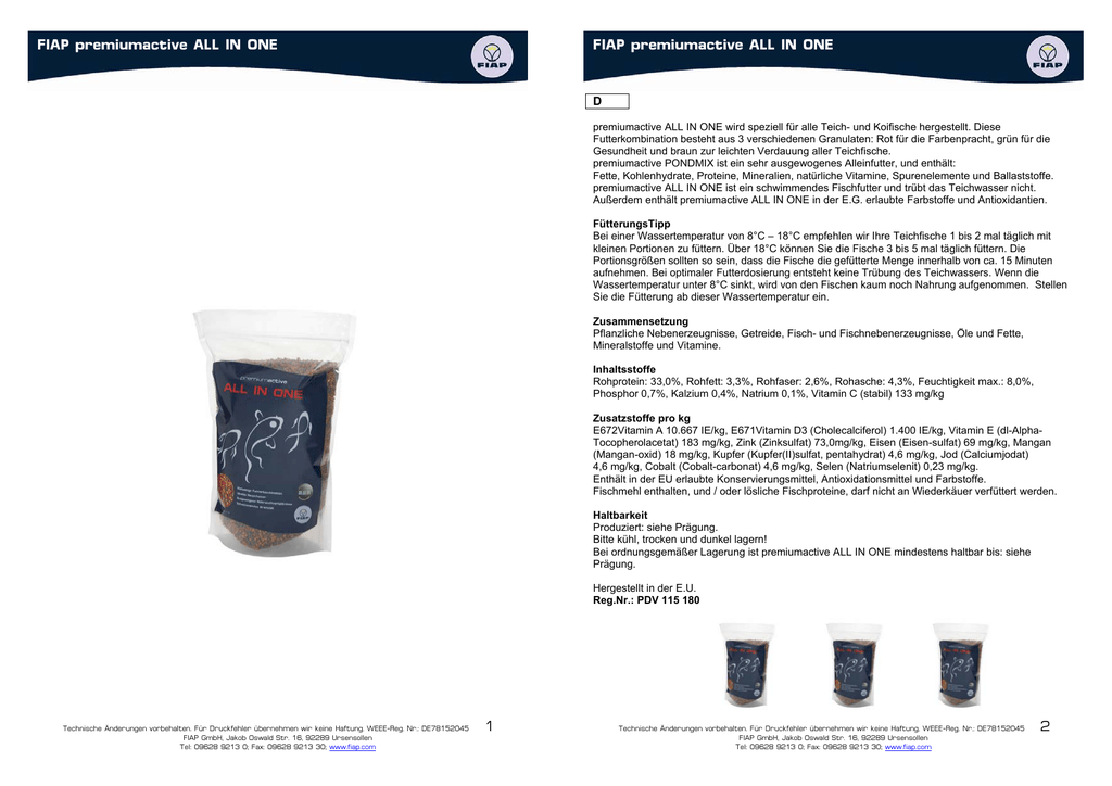 FIAP premiumactive ALL IN ONE FIAP premiumactive ALL IN ONE D premiumactive ALL IN ONE wird speziell für alle Teich- und Koifische hergestellt. Diese Futterkombination besteht aus 3 verschiedenen Granulaten: Rot für die Farbenpracht, grün für die Gesundheit und braun zur leichten Verdauung aller Teichfische. premiumactive PONDMIX ist ein sehr ausgewogenes Alleinfutter, und enthält: Fette, Kohlenhydrate, Proteine, Mineralien, natürliche Vitamine, Spurenelemente und Ballaststoffe. premiumactive ALL IN ONE ist ein schwimmendes Fischfutter und trübt das Teichwasser nicht. Außerdem enthält premiumactive ALL IN ONE in der E.G. erlaubte Farbstoffe und Antioxidantien. FütterungsTipp Bei einer Wassertemperatur von 8°C – 18°C empfehlen wir Ihre Teichfische 1 bis 2 mal täglich mit kleinen Portionen zu füttern. Über 18°C können Sie die Fische 3 bis 5 mal täglich füttern. Die Portionsgrößen sollten so sein, dass die Fische die gefütterte Menge innerhalb von ca. 15 Minuten aufnehmen. Bei optimaler Futterdosierung entsteht keine Trübung des Teichwassers. Wenn die Wassertemperatur unter 8°C sinkt, wird von den Fischen kaum noch Nahrung aufgenommen. Stellen Sie die Fütterung ab dieser Wassertemperatur ein. Zusammensetzung Pflanzliche Nebenerzeugnisse, Getreide, Fisch- und Fischnebenerzeugnisse, Öle und Fette, Mineralstoffe und Vitamine. Inhaltsstoffe Rohprotein: 33,0%, Rohfett: 3,3%, Rohfaser: 2,6%, Rohasche: 4,3%, Feuchtigkeit max.: 8,0%, Phosphor 0,7%, Kalzium 0,4%, Natrium 0,1%, Vitamin C (stabil) 133 mg/kg Zusatzstoffe pro kg E672Vitamin A 10.667 IE/kg, E671Vitamin D3 (Cholecalciferol) 1.400 IE/kg, Vitamin E (dl-AlphaTocopherolacetat) 183 mg/kg, Zink (Zinksulfat) 73,0mg/kg, Eisen (Eisen-sulfat) 69 mg/kg, Mangan (Mangan-oxid) 18 mg/kg, Kupfer (Kupfer(II)sulfat, pentahydrat) 4,6 mg/kg, Jod (Calciumjodat) 4,6 mg/kg, Cobalt (Cobalt-carbonat) 4,6 mg/kg, Selen (Natriumselenit) 0,23 mg/kg. Enthält in der EU erlaubte Konservierungsmittel, Antioxidationsmittel und Farbstoffe. Fischmehl enthalten, und / oder lösliche Fischproteine, darf nicht an Wiederkäuer verfüttert werden. Haltbarkeit Produziert: siehe Prägung. Bitte kühl, trocken und dunkel lagern! Bei ordnungsgemäßer Lagerung ist premiumactive ALL IN ONE mindestens haltbar bis: siehe Prägung. Hergestellt in der E.U. Reg.Nr.: PDV 115 180 Technische Änderungen vorbehalten. Für Druckfehler übernehmen wir keine Haftung. WEEE-Reg. Nr.: DE78152045 FIAP GmbH, Jakob Oswald Str. 16, 92289 Ursensollen Tel: 09628 9213 0; Fax: 09628 9213 30; www.fiap.com 1 Technische Änderungen vorbehalten. Für Druckfehler übernehmen wir keine Haftung. WEEE-Reg. Nr.: DE78152045 FIAP GmbH, Jakob Oswald Str. 16, 92289 Ursensollen Tel: 09628 9213 0; Fax: 09628 9213 30; www.fiap.com 2 FIAP premiumactive ALL IN ONE FIAP premiumactive ALL IN ONE GB F premiumactive ALL IN ONE is custom-made for all pond fish and koi carps. This feed combination is composed of three different kind of pellets: red for blaze of color, green for health and brown for a good digestion of all fish. premiumactive ALL IN ONE is a well-balanced sole feed and contains following: fat, carbohydrates, proteins, minerals, natural vitamins, micronutrients and fibers. premiumactive ALL IN ONE is a floating feed and won't cloud the pond water. premiumactive ALL IN ONE contains also colors and antioxidants, which are allowed in the EU. premiumactive ALL IN ONE est spécialement formulé pour tous les poissons d'étang et de Koi. Cette combinaison alimentaire se compose de 3 granules distincts: rouge pour les couleurs, le vert pour la santé et le brun pour faciliter la digestion de tous les poissons de bassin. premiumactive PONDMIX est un aliment très équilibré, et comprend: Matières grasses, glucides, protéines, minéraux, vitamines naturelles, oligo-éléments et fibres. premiumactive ALL IN ONE est un aliment de poisson flottant et ne trouble pas l'eau du bassin. En outre, la premiumactive ALL IN ONE contient la CE autorisé colorants et antioxydants. Tips for feeding At a water temperature between 8 °C and 18 °C, we recommend to feed your pond fish small portions, one to two times a day. Above 18 °C you can feed your fish three to five times a day. The portion size should be so calculated that the fish are able to eat the feed within 15 minutes. When the feed is optimal dosed, you will have no clouding of your pond water. The fish will barely take feed if the water temperature drops under 8 °C. Stop feeding from this temperature on. Conseils d'alimentation A une température de l'eau à 8 ° C - 18 ° C, nous recommandons de nourrir votre poisson de l'étang 12 fois par jour avec de petites portions. Supérieure à 18 ° C, vous pouvez nourrir les poissons 3-5 fois par jour. La taille de la portion devrait être de nature à répondre aux poissons nourris le montant en 15 minutes environ. À la posologie optimale de la nourriture produite toute la turbidité de l'eau de l'étang. Lorsque la température de l'eau descend en dessous de 8 ° C, est à peine absorbée par la nourriture pour poissons. Régler le flux de cette température de l'eau. Composition of feed Plant by-products, grain, fish and fish by-products, oils and fat. Ingredients Crude protein: 33,0%, crude fat: 3,3%, crude fiber: 2,6%, crude ash: 4,3%, max. moisture: 8,0%, Phosphor 0,7%, calcium 0.4%, sodium 0.1%, Vitamin C (stable) 133 mg/kg Additives per kg E672Vitamin A 10 667 IU/kg, E671Vitamin D3 (cholecalciferol) 1,400 IU/kg vitamin E (dl-alphatocopherol acetate) 183 mg/kg, zinc (zinc sulfate) 73.0 mg/kg, iron (ferrous sulphate) 69 mg/kg , manganese (manganese oxide) 18 mg/kg, Copper (copper (II) sulfate, pentahydrate) 4.6 mg/kg, iodine (calcium iodate) 4.6 mg/kg cobalt (cobalt carbonate) 4.6 mg/kg, selenium (sodium selenite) 0.23 mg/kg. Does the EU preservatives, antioxidants and dyes allowed. Containing fishmeal and / or soluble fish proteins may not be fed to ruminants. Expiry date Produced: see impr