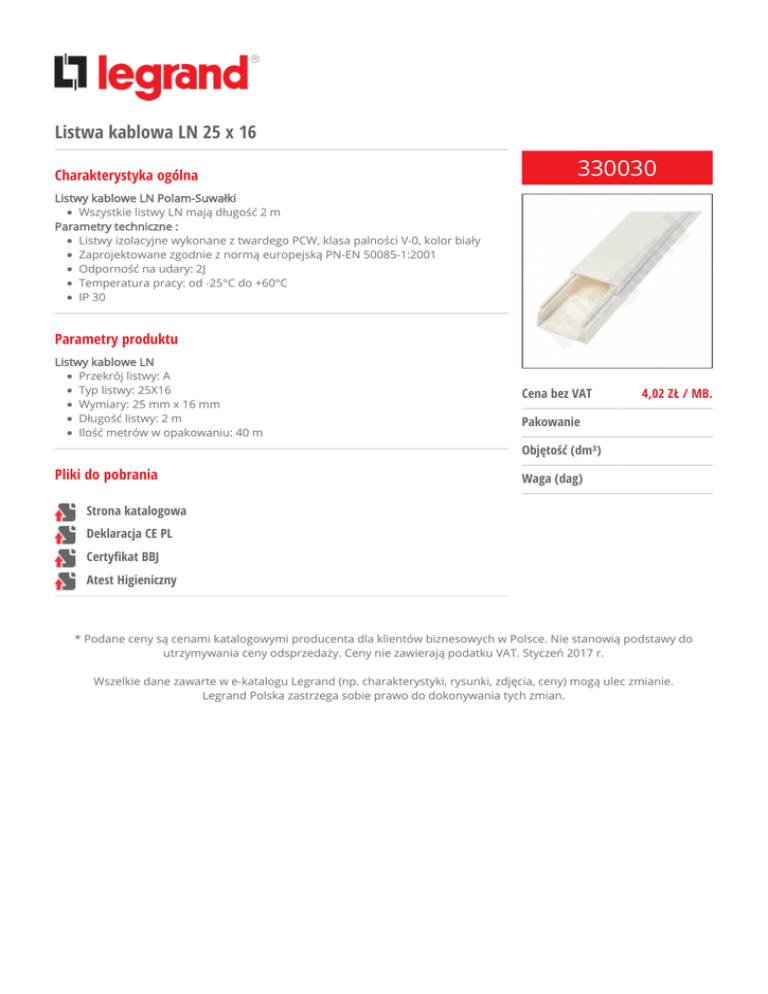 Listwa kablowa LN 25 x 16 Charakterystyka ogólna 330030 Listwy kablowe LN Polam-Suwałki Wszystkie listwy LN mają długość 2 m Parametry techniczne : Listwy izolacyjne wykonane z twardego PCW, klasa palności V-0, kolor biały Zaprojektowane zgodnie z normą europejską PN-EN 50085-1:2001 Odporność na udary: 2J Temperatura pracy: od -25°C do +60°C IP 30 Parametry produktu Listwy kablowe LN Przekrój listwy: A Typ listwy: 25X16 Wymiary: 25 mm x 16 mm Długość listwy: 2 m Ilość metrów w opakowaniu: 40 m Cena bez VAT 4,02 ZŁ / MB. Pakowanie Objętość (dm³) Pliki do pobrania Waga (dag) Strona katalogowa Deklaracja CE PL Certyfikat BBJ Atest Higieniczny * Podane ceny są cenami katalogowymi producenta dla klientów biznesowych w Polsce. Nie stanowią podstawy do utrzymywania ceny odsprzedaży. Ceny nie zawierają podatku VAT. Styczeń 2017 r. Wszelkie dane zawarte w e-katalogu Legrand (np. charakterystyki, rysunki, zdjęcia, ceny) mogą ulec zmianie. Legrand Polska zastrzega sobie prawo do dokonywania tych zmian.