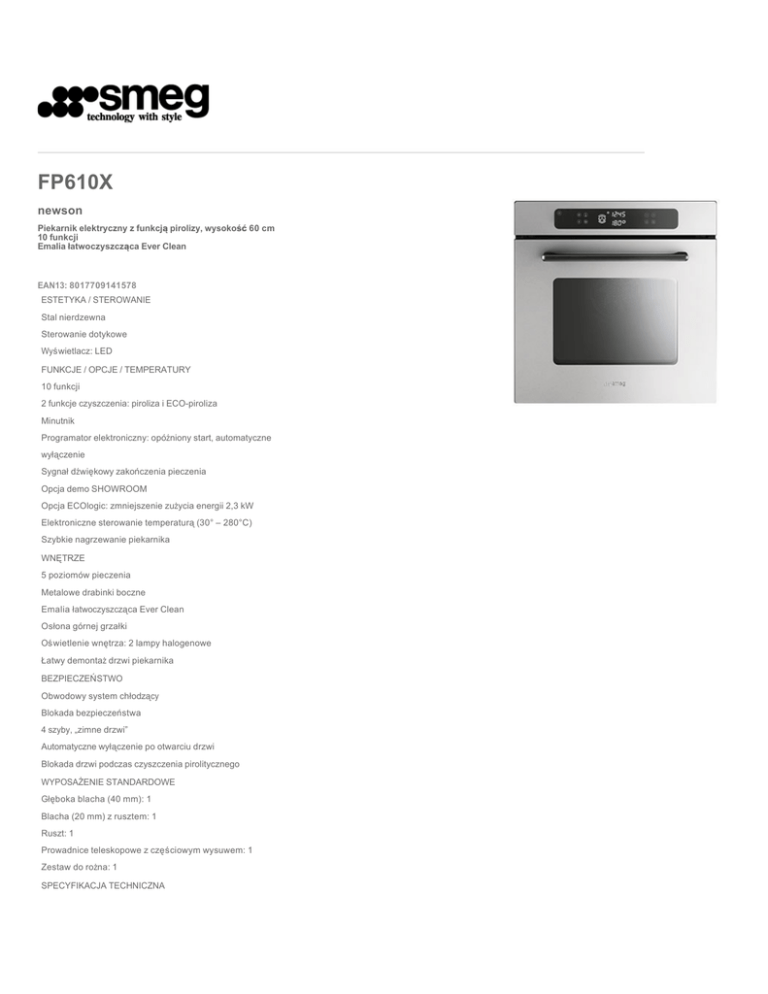 FP610X newson Piekarnik elektryczny z funkcją pirolizy, wysokość 60 cm 10 funkcji Emalia łatwoczyszcząca Ever Clean EAN13: 8017709141578 ESTETYKA / STEROWANIE Stal nierdzewna Sterowanie dotykowe Wyświetlacz: LED FUNKCJE / OPCJE / TEMPERATURY 10 funkcji 2 funkcje czyszczenia: piroliza i ECO-piroliza Minutnik Programator elektroniczny: opóźniony start, automatyczne wyłączenie Sygnał dźwiękowy zakończenia pieczenia Opcja demo SHOWROOM Opcja ECOlogic: zmniejszenie zużycia energii 2,3 kW Elektroniczne sterowanie temperaturą (30° – 280°C) Szybkie nagrzewanie piekarnika WNĘTRZE 5 poziomów pieczenia Metalowe drabinki boczne Emalia łatwoczyszcząca Ever Clean Osłona górnej grzałki Oświetlenie wnętrza: 2 lampy halogenowe Łatwy demontaż drzwi piekarnika BEZPIECZEŃSTWO Obwodowy system chłodzący Blokada bezpieczeństwa 4 szyby, „zimne drzwi” Automatyczne wyłączenie po otwarciu drzwi Blokada drzwi podczas czyszczenia pirolitycznego WYPOSAŻENIE STANDARDOWE Głęboka blacha (40 mm): 1 Blacha (20 mm) z rusztem: 1 Ruszt: 1 Prowadnice teleskopowe z częściowym wysuwem: 1 Zestaw do rożna: 1 SPECYFIKACJA TECHNICZNA Moc przyłączeniowa: 3,0 kW Moc dużego grilla: 2,7 kW Napięcie: 220-240 V Zabezpieczenie: 13 A Częstotliwość: 50/60 Hz Functions SMEG S.p.A. Via Leonardo da Vinci, 4 42016 Guastalla (RE) Tel. 0522 821 1 FP610X newson pirolityczne 60 cm stal nierdzewna klasa energochłonności A elektryczne Klasa A: Klasa A piekarnika zapewnia niskie zużycie energii. POWŁOKA ZAPOBIEGAJĄCA POWSTAWANIU ODCISKÓW PALCÓW: W większości urządzeń firmy SMEG stosowana jest, przy użyciu specjalnej technologii, powłoka zapobiegająca pozostawianiu odcisków palców na powierzchni stali nierdzewnej. BLOKADA BEZPIECZEŃSTWA: Blokady przeciwko dzieciom są stosowane w takich urządzeniach jak kuchenki, płyty grzewcze i zmywarki. Gdy opcja jest włączona wszystkie funkcje i programy są zablokowane, włącznie z funkcjami włączania i wyłączania urządzenia, co zapewnia pełne bezpieczeństwo dla dzieci. STEROWANIE DOTYKOWE: Niektóre modele piekarników, płyt grzewczych i okapy firmy SMEG posiadają panele dotykowe, co daje poczucie komfortu użytkowania i jest bardzo łatwe w utrzymaniu czystości. DRZWI Z POCZWÓRNYM SZKŁEM: Modele piekarników z funkcją pirolitycznego czyszczenia są wyposażone w poczwórnie przeszklone drzwi. Podczas pirolizy zewnętrza powierzchnia pozostaje zimna zapewniając maksymalne bezpieczeństwo użytkowania. Dwie wewnętrzne szyby odbijają ciepło, co ma znaczenie dla efektywności używanej energii. POZIOMY PIEKARNIKA: Piekarniki firmy SMEG z maksymalna pojemnością 72 litrów posiadają 5 poziomów, co zapewnia maksymalną elastyczność w użytkowaniu. Pozwala to na oszczędność czasu potrzebnego do przyrządzenia kilku potraw w tym samym czasie albo konieczności przygotowania dużych ilości. DEMONTOWALNE SZKŁO WEWNĘTRZNE: W większości piekarników firmy SMEG szkło wewnątrz drzwi jest łatwe w demontażu, co również znacznie ułatwia utrzymanie w czystości urządzenia. JEDNOLITE SZKŁO WEWNĘTRZNE: W większości piekarników firmy SMEG zainstalowane w drzwiach szkło wewnętrzne posiada wyjątkowo gładką powierzchnię, bez żadnych wkrętów, co znacznie ułatwia utrzymanie w czystości urządzenia. STATYCZNY SYSTEM CHŁODZENIA: Innowacyjny STATYCZNY system chłodzenia pomaga chronić meble od nadmiernej temperatury podczas pracy urządzenia. PROWADNICE TELESKOPOWE: Łatwe w instalacji prowadnice teleskopowe znacznie ułatwiają wyciąganie potraw z piekarnika, bez ich przymocowywania. Zapewnia to maksymalne bezpieczeństwo w procesie gotowania. MAKSYMALNA POJEMNOŚĆ: Niektóre modele piekarników firmy SMEG posiadają pojemność netto 72 litrów (79 l brutto) – tj. o 35% większej od standardowej pojemności. Zwiększenie pojemności powoduje zwiększenie liczby poziomów pieczenia do pięciu. ELEKTRONICZNA KONTROLA TEMPERATURY: Pozwala na utrzymanie temperatury we wnętrzu piekarnika w granicach tolerancji 2-3 ° C. Umożliwia to przyrządzanie dań wrażliwych na zmiany temperatury np. ciast, sufletów, puddingów. SZYBKIE NAGRZEWANIE: Ta opcja pozwala na szybkie nagrzanie piekarnika do wskazanej temperatury (w zależności od modelu trwa to od 6 do 9 minut) dla zwiększenia szybkości przygotowania potrawy. OŚWIETLENIE WNĘTRZA PIEKARNIKA: Piekarniki firmy Smeg o maksymalnej pojemności dla lepszego oświetlenia wnętrzna posiadają dwie lampy halogenowe umieszczone po bokach i na różnych poziomach. CHŁODNE DRZWI: Większość piekarników firmy SMEG posiada “chłodne drzwi”. Dzięki połączeniu systemu obwodowego chłodzenia i wewnętrznym szybom odbijającym ciepło, temperatura zewnętrznej powierzchni drzwi jest utrzymywana poniżej 50 ° C. Dodatkowo system ten chroni meble będące w kontakcie z piekarnikiem przed przegrzewaniem. OSŁONA GÓRNEJ GRZAŁKI: Rozwiązanie to chroni górną część piekarnika przed zanieczyszczeniem. Element chroniący jest łatwy w demontażu i może być myty w zmywarce. ECO-LOGIC: Opcja ECO- logic ogranicza całkowite zużycie energii do 3 kW, umożliwia to używanie płyty i innych urządzeń w tym samym czasie. EMALIA ŁATWOCZYSZCZĄCA EVER CLEAN: Emalia, którą jest pokryte wnętrze piekarników. Jest niezwykle łatwa w czyszczeniu, ze względu na znikomą interakcję z tłuszczami i odporność na różne kwasy. WENTYLATOR, GRZAŁKA GÓRNA I DOLNA: Grzałki w połączeniu z wentylatorem zapewniają równomierną temperaturę w całej komorze. Jest to metoda dająca podobne efekty do pieczenia tradycyjnego. Mniej wydajna od użycia wentylatora i 3 grzalek. Najlepsza do wypieku ciast. WENTYLATOR, GRZAŁKA DOLNA: Dodanie dolnej grzałki do wymuszonego obiegu podnosi temperaturę w dolnej części potrawy, zapewniając jej skuteczniejsze pieczenie środka bez przypiekania powierzchni. GRZAŁKA GÓRNA I DOLNA: Włączenie tych 2 grzałek stosuje się w pie