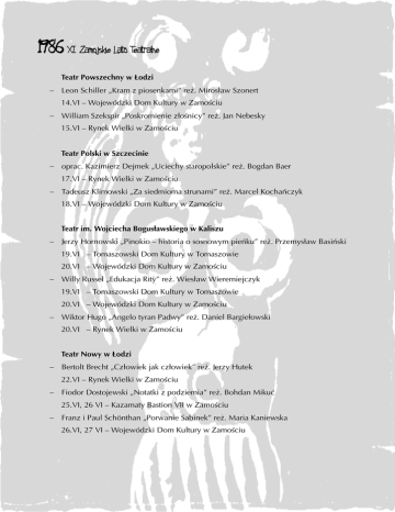 1986 XI Zamojskie Lato Teatralne Teatr Powszechny w Łodzi − Leon Schiller „Kram z piosenkami” reż. Mirosław Szonert 14.VI – Wojewódzki Dom Kultury w Zamościu − William Szekspir „Poskromienie złośnicy” reż. Jan Nebesky 15.VI – Rynek Wielki w Zamościu Teatr Polski w Szczecinie − oprac. Kazimierz Dejmek „Uciechy staropolskie” reż. Bogdan Baer 17.VI – Rynek Wielki w Zamościu − Tadeusz Klimowski „Za siedmioma strunami” reż. Marcel Kochańczyk 18.VI – Wojewódzki Dom Kultury w Zamościu Teatr im. Wojciecha Bogusławskiego w Kaliszu − Jerzy Hornowski „Pinokio – historia o sosnowym pieńku” reż. Przemysław Basiński 19.VI – Tomaszowski Dom Kultury w Tomaszowie 20.VI – Wojewódzki Dom Kultury w Zamościu − Willy Russel „Edukacja Rity” reż. Wiesław Wieremiejczyk 19.VI – Tomaszowski Dom Kultury w Tomaszowie 20.VI – Wojewódzki Dom Kultury w Zamościu − Wiktor Hugo „Angelo tyran Padwy” reż. Daniel Bargiełowski 20.VI – Rynek Wielki w Zamościu Teatr Nowy w Łodzi − Bertolt Brecht „Człowiek jak człowiek” reż. Jerzy Hutek 22.VI – Rynek Wielki w Zamościu − Fiodor Dostojewski „Notatki z podziemia” reż. Bohdan Mikuć 25.VI, 26 VI – Kazamaty Bastion VII w Zamościu − Franz i Paul Schönthan „Porwanie Sabinek” reż. Maria Kaniewska 26.VI, 27 VI – Wojewódzki Dom Kultury w Zamościu Teatr Polski w Warszawie − Mikołaj Rej „Żywot Józefa” reż. Kazimierz Dejmek 24.VI – Rynek Wielki w Zamościu − Sławomir Mrożek „Letni dzień” reż. Kazimierz Dejmek 25.VI – Wojewódzki Dom Kultury w Zamościu Teatr Popularny w Warszawie − Roman Brandstaetter „Król i aktor” reż. Andrzej Ziębiński 29.VI – Wojewódzki Dom Kultury w Zamościu 30.VI – Tomaszowski Dom Kultury w Tomaszowie Teatr im. Juliusza Osterwy w Lublinie − Stanisław Tym „Okręt” reż. Andrzej Rozhin 30.VI – Rynek Wielki w Zamościu − wg Kornela Makuszyńskiego „O dwóch takich co ukradli księżyc” reż. Bogusława Czosnowska 1.VII – Wojewódzki Dom Kultury w Zamościu Teatr Stu w Krakowie − Henryk Jachimowski „Makijaż” reż. Krzysztof Jasiński 3.VII, 4.VII – Stare Miasto w Zamościu Teatr Adekwatny w Warszawie − wg Czesława Miłosza „Traktat moralny” reż. Henryk Boukołowski 5.VII – Wojewódzki Dom Kultury w Zamościu 7.VII – Biłgorajski Dom Kultury w Biłgoraju 6.VII – Hrubieszowski Dom Kultury w Hrubieszowie 5.VII – Tomaszowski Dom Kultury w Tomaszowie 7.VII – Gminny Ośrodek Kultury w Tarnogrodzie 6.VII – Gminny Ośrodek Kultury w Werbkowicach Teatr Stara Prochownia w Warszawie „Rzecz o Witkacym” reż. Wojciech Siemion 2 VII – Wojewódzki Dom Kultury w Zamościu 3 VII – Gminny Ośrodek Kultury w Krasnobrodzie 4 VII – Biłgorajski Dom Kultury w Biłgoraju 5 VII – Gminny Ośrodek Kultury w Tarnogrodzie