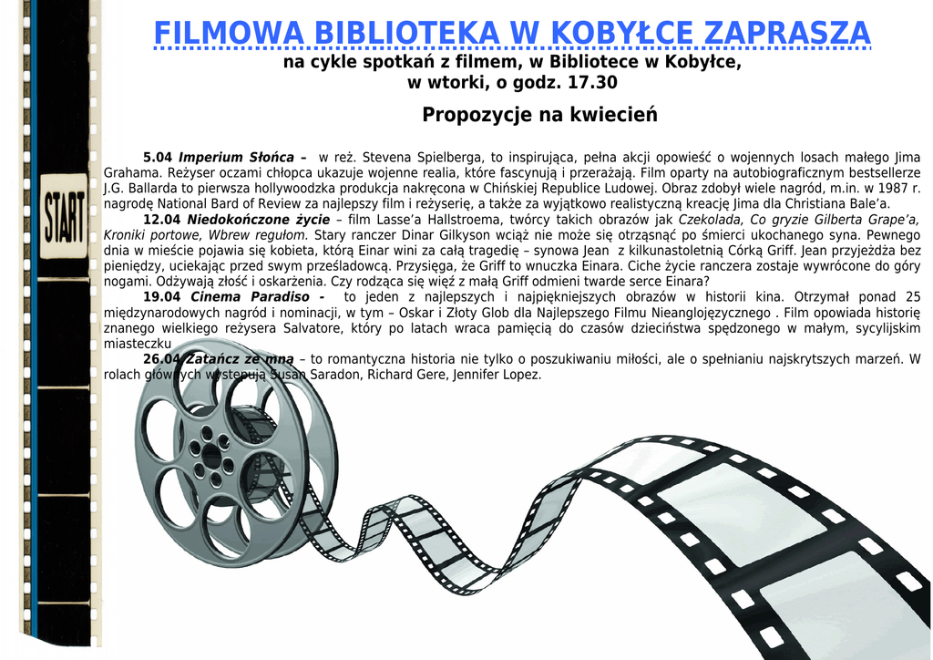 FILMOWA BIBLIOTEKA W KOBYŁCE ZAPRASZA na cykle spotkań z filmem, w Bibliotece w Kobyłce, w wtorki, o godz. 17.30 Propozycje na kwiecień 5.04 Imperium Słońca – w reż. Stevena Spielberga, to inspirująca, pełna akcji opowieść o wojennych losach małego Jima Grahama. Reżyser oczami chłopca ukazuje wojenne realia, które fascynują i przerażają. Film oparty na autobiograficznym bestsellerze J.G. Ballarda to pierwsza hollywoodzka produkcja nakręcona w Chińskiej Republice Ludowej. Obraz zdobył wiele nagród, m.in. w 1987 r. nagrodę National Bard of Review za najlepszy film i reżyserię, a także za wyjątkowo realistyczną kreację Jima dla Christiana Bale’a. 12.04 Niedokończone życie – film Lasse’a Hallstroema, twórcy takich obrazów jak Czekolada, Co gryzie Gilberta Grape’a, Kroniki portowe, Wbrew regułom. Stary ranczer Dinar Gilkyson wciąż nie może się otrząsnąć po śmierci ukochanego syna. Pewnego dnia w mieście pojawia się kobieta, którą Einar wini za całą tragedię – synowa Jean z kilkunastoletnią Córką Griff. Jean przyjeżdża bez pieniędzy, uciekając przed swym prześladowcą. Przysięga, że Griff to wnuczka Einara. Ciche życie ranczera zostaje wywrócone do góry nogami. Odżywają złość i oskarżenia. Czy rodząca się więź z małą Griff odmieni twarde serce Einara? 19.04 Cinema Paradiso - to jeden z najlepszych i najpiękniejszych obrazów w historii kina. Otrzymał ponad 25 międzynarodowych nagród i nominacji, w tym – Oskar i Złoty Glob dla Najlepszego Filmu Nieanglojęzycznego . Film opowiada historię znanego wielkiego reżysera Salvatore, który po latach wraca pamięcią do czasów dzieciństwa spędzonego w małym, sycylijskim miasteczku 26.04 Zatańcz ze mną – to romantyczna historia nie tylko o poszukiwaniu miłości, ale o spełnianiu najskrytszych marzeń. W rolach głównych występują Susan Saradon, Richard Gere, Jennifer Lopez.