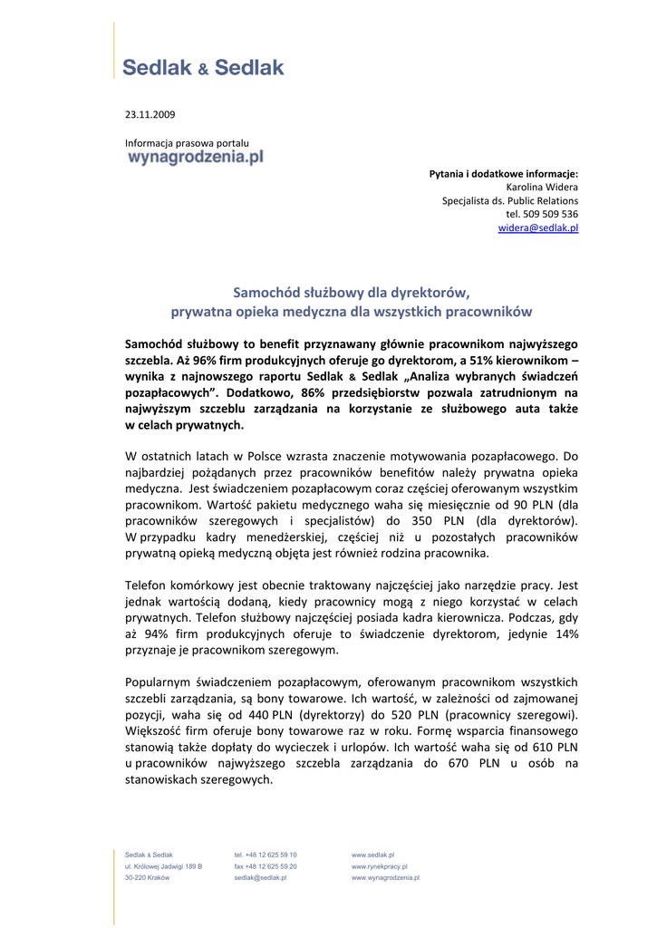 23.11.2009 Informacja prasowa portalu Pytania i dodatkowe informacje: Karolina Widera Specjalista ds. Public Relations tel. 509 509 536 [email protected] Samochód służbowy dla dyrektorów, prywatna opieka medyczna dla wszystkich pracowników Samochód służbowy to benefit przyznawany głównie pracownikom najwyższego szczebla. Aż 96% firm produkcyjnych oferuje go dyrektorom, a 51% kierownikom – wynika z najnowszego raportu Sedlak & Sedlak „Analiza wybranych świadczeo pozapłacowych”. Dodatkowo, 86% przedsiębiorstw pozwala zatrudnionym na najwyższym szczeblu zarządzania na korzystanie ze służbowego auta także w celach prywatnych. W ostatnich latach w Polsce wzrasta znaczenie motywowania pozapłacowego. Do najbardziej pożądanych przez pracowników benefitów należy prywatna opieka medyczna. Jest świadczeniem pozapłacowym coraz częściej oferowanym wszystkim pracownikom. Wartośd pakietu medycznego waha się miesięcznie od 90 PLN (dla pracowników szeregowych i specjalistów) do 350 PLN (dla dyrektorów). W przypadku kadry menedżerskiej, częściej niż u pozostałych pracowników prywatną opieką medyczną objęta jest również rodzina pracownika. Telefon komórkowy jest obecnie traktowany najczęściej jako narzędzie pracy. Jest jednak wartością dodaną, kiedy pracownicy mogą z niego korzystad w celach prywatnych. Telefon służbowy najczęściej posiada kadra kierownicza. Podczas, gdy aż 94% firm produkcyjnych oferuje to świadczenie dyrektorom, jedynie 14% przyznaje je pracownikom szeregowym. Popularnym świadczeniem pozapłacowym, oferowanym pracownikom wszystkich szczebli zarządzania, są bony towarowe. Ich wartośd, w zależności od zajmowanej pozycji, waha się od 440 PLN (dyrektorzy) do 520 PLN (pracownicy szeregowi). Większośd firm oferuje bony towarowe raz w roku. Formę wsparcia finansowego stanowią także dopłaty do wycieczek i urlopów. Ich wartośd waha się od 610 PLN u pracowników najwyższego szczebla zarządzania do 670 PLN u osób na stanowiskach szeregowych. Sedlak & Sedlak tel. +48 12 625 59 10 www.sedlak.pl ul. Królowej Jadwigi 189 B fax +48 12 625 59 20 www.rynekpracy.pl 30-220 Kraków [email protected] www.wynagrodzenia.pl Informacja o raporcie Raport „Analiza wybranych świadczeo pozapłacowych” zawiera dane o świadczeniach pozapłacowych na różnych poziomach zarządzania. Omówiono i porównano w nim świadczenia dla stanowisk szeregowych, specjalistów, kadry zarządzającej średniego i wyższego szczebla. Porównanie obejmuje siedem najpopularniejszych benefitów, takich jak np. samochód służbowy, telefon komórkowy, bony towarowe. Raport można zakupid na stronie www.wynagrodzenia.pl. Redakcja portalu wynagrodzenia.pl Więcej informacji prasowych portalu wynagrodzenia.pl znajdą Paostwo w zakładce Dla mediów. Wszystko o wynagrodzeniach. Profesjonalna wiedza dla pracodawców i pracowników. Raporty, analizy, opracowania. Niezależne badania wynagrodzeo w Polsce. Sedlak & Sedlak tel. +48 12 625 59 10 www.sedlak.pl ul. Królowej Jadwigi 189 B fax +48 12 625 59 20 www.rynekpracy.pl 30-220 Kraków [email protected] www.wynagrodzenia.pl