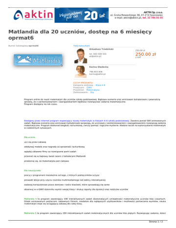 Matlandia dla 20 uczniów, dostęp na 6 miesięcy oprmat6 Numer katalogowy:oprmat6 Twój konsultant Arkadiusz Trzebiński tel. 503 030 555 [email protected] NOWOŚĆ W OFERCIE 250.00 zł 250.00 zł z VAT Karina Gładecka 796 603 606 [email protected] CECHY PRODUKTU: Kategoria wiekowa - Klasa 4-6 Producent - GWO Przedmiot - Matematyka Zastosowanie - Gry Program online do nauki matematyki dla uczniów szkoły podstawowej. Bajkowa sceneria oraz animowani bohaterowie z pewnością sprawią, że z zainteresowaniem i zaangażowaniem będziesz rozwiązywać zadania matematyczne. Program dostępny na rok czasu. Dostępny przez internet program wspierający naukę matematyki w klasach 4–6 szkoły podstawowej. Zawiera ponad 500 animowanych zadań. Bajkowa sceneria oraz animowani bohaterowie sprawiają, że uczniowie z zainteresowaniem i zaangażowaniem rozwiązują zadania matematyczne. Program doskonali biegłość rachunkową, ćwiczy pamięć i logiczne myślenie. Kładzie nacisk na wykorzystanie matematyki w codziennych sytuacjach. Dla ucznia: ucz się przez zabawę zdobywaj medale oraz nagrody za sprawność rachunkową oglądaj zabawne filmy za rozwiązanie partii zadań przenieś się w bajkowy świat razem z bohaterami Matlandii przekonaj się, że matematyka jest ciekawa Dla nauczyciela: pracuj z programem niezależnie od tego, z których podręczników uczysz prowadź lekcje przy użyciu rzutnika multimedialnego lub tablicy interaktywnej zadawaj komputerowe prace domowe i twórz klasówki, które sprawdzają się same obserwuj w e-GWO dzienniku wyniki swojej klasy i drukuj raporty dla dyrekcji oraz rodziców uczniów Matlandia 4 to program zawierający 190 interaktywnych zadań doskonalących umiejętności matematyczne uczniów klas czwartych. Dzięki animowanym postaciom, zabawnym filmom, medalom dla najlepszych użytkowników i możliwości porównania wyników, nauka matematyki staje się wciągającą zabawą dla całej klasy. Matlandia 5 to program zawierający 200 interaktywnych zadań matematycznych dla uczniów klas piątych. Rozwiązując zadania, dzieci Strona 1 / 2 odkrywają zakamarki bajkowej wyspy, zdobywają skarby i pomagają bohaterowi opowieści naprawić uszkodzony pojazd. Przekonaj swoich uczniów, że nauka matematyki może być tak ciekawa, jak ich ulubione gry komputerowe. Matlandia 6 zawiera 140 interaktywnych zadań matematycznych dla klas szóstych. Uczniowie rozwiązują zadania, podróżując po odległych galaktykach. Wraz z bohaterem gry doskonalą swoje umiejętności matematyczne. Zdobywają przy tym multimedialne nagrody: tapety, wygaszacze, dzwonki, awatary oraz zabawne filmiki. Przekonaj się jak wygląda nauka przez zabawę. Strona 2 / 2 Powered by TCPDF (www.tcpdf.org)