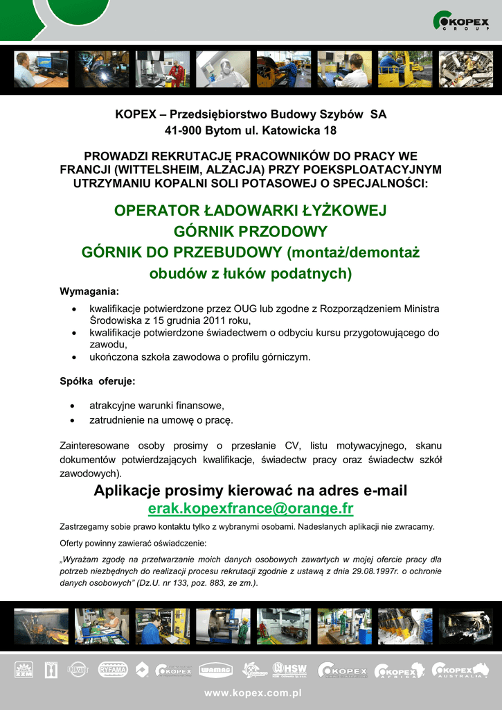 KOPEX – Przedsiębiorstwo Budowy Szybów SA 41-900 Bytom ul. Katowicka 18 PROWADZI REKRUTACJĘ PRACOWNIKÓW DO PRACY WE FRANCJI (WITTELSHEIM, ALZACJA) PRZY POEKSPLOATACYJNYM UTRZYMANIU KOPALNI SOLI POTASOWEJ O SPECJALNOŚCI: OPERATOR ŁADOWARKI ŁYŻKOWEJ GÓRNIK PRZODOWY GÓRNIK DO PRZEBUDOWY (montaż/demontaż obudów z łuków podatnych) Wymagania: kwalifikacje potwierdzone przez OUG lub zgodne z Rozporządzeniem Ministra Środowiska z 15 grudnia 2011 roku, kwalifikacje potwierdzone świadectwem o odbyciu kursu przygotowującego do zawodu, ukończona szkoła zawodowa o profilu górniczym. Spółka oferuje: atrakcyjne warunki finansowe, zatrudnienie na umowę o pracę. Zainteresowane osoby prosimy o przesłanie CV, listu motywacyjnego, skanu dokumentów potwierdzających kwalifikacje, świadectw pracy oraz świadectw szkół zawodowych). Aplikacje prosimy kierować na adres e-mail [email protected] Zastrzegamy sobie prawo kontaktu tylko z wybranymi osobami. Nadesłanych aplikacji nie zwracamy. Oferty powinny zawierać oświadczenie: „Wyrażam zgodę na przetwarzanie moich danych osobowych zawartych w mojej ofercie pracy dla potrzeb niezbędnych do realizacji procesu rekrutacji zgodnie z ustawą z dnia 29.08.1997r. o ochronie danych osobowych” (Dz.U. nr 133, poz. 883, ze zm.). www.kopex.com.pl