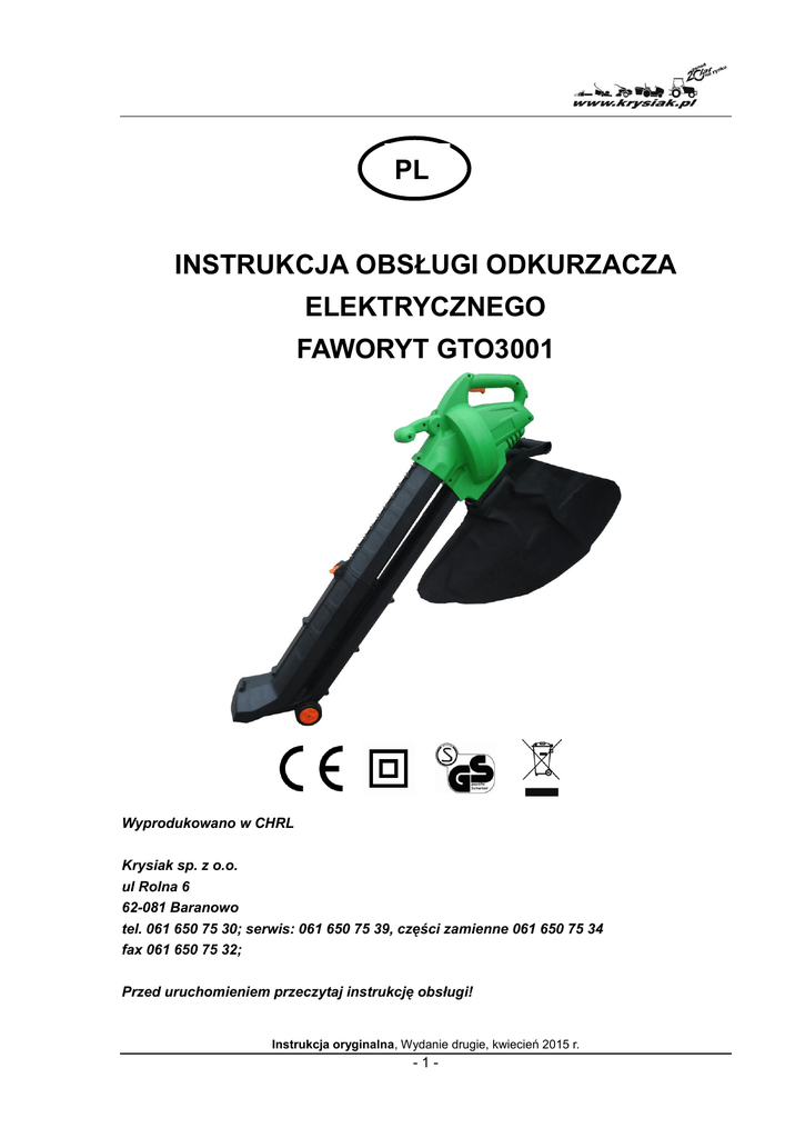 PL INSTRUKCJA OBSŁUGI ODKURZACZA ELEKTRYCZNEGO FAWORYT GTO3001 Wyprodukowano w CHRL Krysiak sp. z o.o. ul Rolna 6 62-081 Baranowo tel. 061 650 75 30; serwis: 061 650 75 39, części zamienne 061 650 75 34 fax 061 650 75 32; Przed uruchomieniem przeczytaj instrukcję obsługi! Instrukcja oryginalna, Wydanie drugie, kwiecień 2015 r. -1- Uwaga Zmiany techniczne i optyczne mogą być wprowadzane bez zapowiedzi, w trakcie procesu modyfikacji i ulepszania produktów. Wszelkie wymiary, wskazówki i dane podane w niniejszej instrukcji obsługi są w związku z tym podawane w sposób niewiążący. Roszczenia zgłaszane na podstawie treści instrukcji obsługi są nieważne. Wskazówki bezpieczeństwa UWAGA. Proszę przeczytać wszystkie wskazówki zawarte w instrukcji i upewnić się, że wszystkie są zrozumiałe. Nieprzestrzeganie poniższych wskazówek może spowodować porażenie prądem, pożar i poważne okaleczenia. W poniższym tekście używa się zawsze słowa „elektronarzędzie” dla zakupionego przez Państwo narzędzia elektrycznego zasilanego z sieci. Proszę starannie przechowywać niniejszą instrukcje. Okolice pracy Miejsce i okolice należy utrzymywać w czystości i zwracać uwagę na wystarczające oświetlenie. Anormalne i złe oświetlenie miejsca pracy zwiększa ryzyko wypadków. Nigdy nie używaj elektronarzędzi w okolicach zagrożonych eksplozjami, jak na przykład w pobliżu łatwopalnych płynów, gazów lub pyłów. Elektronarzędzia wytwarzają iskry mogą zapalić pyły lub opary. Dzieci i osoby postronne należy w trakcie pracy elektronarzędziem utrzymywać z daleka. Odwrócenia uwagi mogą prowadzić do utraty kontroli nad urządzeniem. Bezpieczeństwo elektryczne Wtyczka elektronarzędzia musi zawsze idealnie pasować do gniazda. W żadnym wypadku nie wolno przerabiać wtyczki. Nie używać żadnych adapterów w połączeniu z elektronarzędziami. Nieprzerobione wtyczki i pasujące gniazda zmniejszają ryzyko porażenia prądem. Proszę unikać kontaktu ciała z uziemionymi powierzchniami, jak rury, grzejniki CO, kuchenki i lodówki. Gdy Państwa ciało jest uziemione, zachodzi zwiększone ryzyko porażenia prądem. Proszę nigdy nie wystawiać elektronarzędzia na działanie deszczu lub innych wilgotnych warunków zewnętrznych. Woda, która mogłaby wniknąć do elektronarzędzia, podnosi ryzyko porażenia prądem. Nie wolno używać przewodu elektrycznego do celów dla niego nie przeznaczonych. Nigdy nie należy używać przewodu do noszenia lub przeciągania elektronarzędzia. Nigdy nie należy wyciągać wtyczki z gniazda poprzez pociąganie za przewód elektryczny. Przewód elektryczny należy trzymać z dala od gorącego oleju, ostrych krawędzi lub ruchomych części. Uszkodzone lub nadwyrężone przewody zwiększają ryzyko porażenia prądem. Pracując na dworze należy używać wyłącznie przedłużaczy przeznaczonych do pracy na zewnątrz. Używanie przedłużacza przeznaczonego do pracy na zewnątrz zmniejsza ryzyko porażenia prądem. Bezpieczeństwo osobiste Pracując elektronarzędziem należy zawsze być uważnym, skoncentrowanym na swojej pracy i rozsądnym. Nie należy używać elektronarzędzi, jeśli jesteśmy zmęczeni, pod wpływem narkotyków, alkoholu lub medykamentów. Przy pracy elektronarzędziem już krótka chwila nieuwagi może doprowadzić do poważnego uszkodzenia ciała. Proszę nosić osobiste środki ochrony, proszę używać okularów ochronnych. Noszenie osobistych środków ochrony, jak maska, solidne obuwie, kask ochronny czy nauszniki (zawsze w zależności od aktualnych warunków pracy) zmniejsza ryzyko okaleczenia. -2- Przed wyłączeniem urządzenia należy usunąć z niego wszelkie narzędzia regulacyjne. Klucz lub inne narzędzie, które mogą dostać się do obracającej się części elektronarzędzia, może doprowadzić to do okaleczenia. Proszę nie nachylać się zbytnio nad elektronarzędziem. Zawsze należy dbać o stabilną pozycję. Umożliwi to lepszą kontrolę nad elektronarzędziem w nieoczekiwanych sytuacjach. Proszę nosić odpowiednie ubranie. Nie należy nosić luźnych ubrań i biżuterii. Włosy, ubranie i rękawice należy trzymać z dala od ruchomych części urządzenia. Luźne ubranie, biżuteria czy długie włosy mogą zaplątać się w ruchome części urządzenia. Używanie i konserwacja elektronarzędzi Proszę nie przeciążać urządzenia. Należy używać elektronarzędzia nadającego się do danego zastosowania. Elektronarzędziem dopasowanym do zadania wykonacie je Państwo lepiej i pewniej w przewidzianym do tego zakresie mocy. Proszę nie używać elektronarzędzia, jeżeli nie daje się ono włączyć lub wyłączyć za pomocą jego włącznika. Elektronarzędzie takie jest niebezpieczne i musi być naprawione. Należy zawsze wyjąć wtyczkę z gniazda elektrycznego przed podjęciem regulacji elektronarzędzia, przed wymianą oprzyrządowania lub przed jego odstawieniem. Takie działanie zapobiegawcze zmniejsza ryzyko niezamierzonego uruchomienia urządzenia. Nie używane elektronarzędzia należy przechowywać w miejscu niedostępnym dla dzieci. Nigdy nie wolno dopuścić do używania elektronarzędzia przez osoby, które nie znają niniejszych wskazówek i urządzenia. Elektronarzędzia są niebezpieczne, jeśli używane są przez osoby niedoświadczone. Proszę konserwować Państwa elektronarzędzie. Proszę zwracać uwagę na prawidłowe zamocowanie i ustawienie części ruchomych, na ewentualne uszkodzenia lub wady, które mogą mieć wpływ na prawidłową prace urządzenia. Proszę zawsze zwracać uwagę na warunki pracy. Używanie tego elektronarzędzia do celów niezgodnych z jego przeznaczeniem może doprowadzić do sytuacji niebezpiecznych. Serwis Naprawy urządzenia należy zlecać tylko wykwalifikowanemu personelowi. Należy używać tylko oryginalnych części zamiennych. Zagwarantuje to zachowanie bezpieczeństwa urządzenia. Dodatkowe przepisy bezpieczeństw