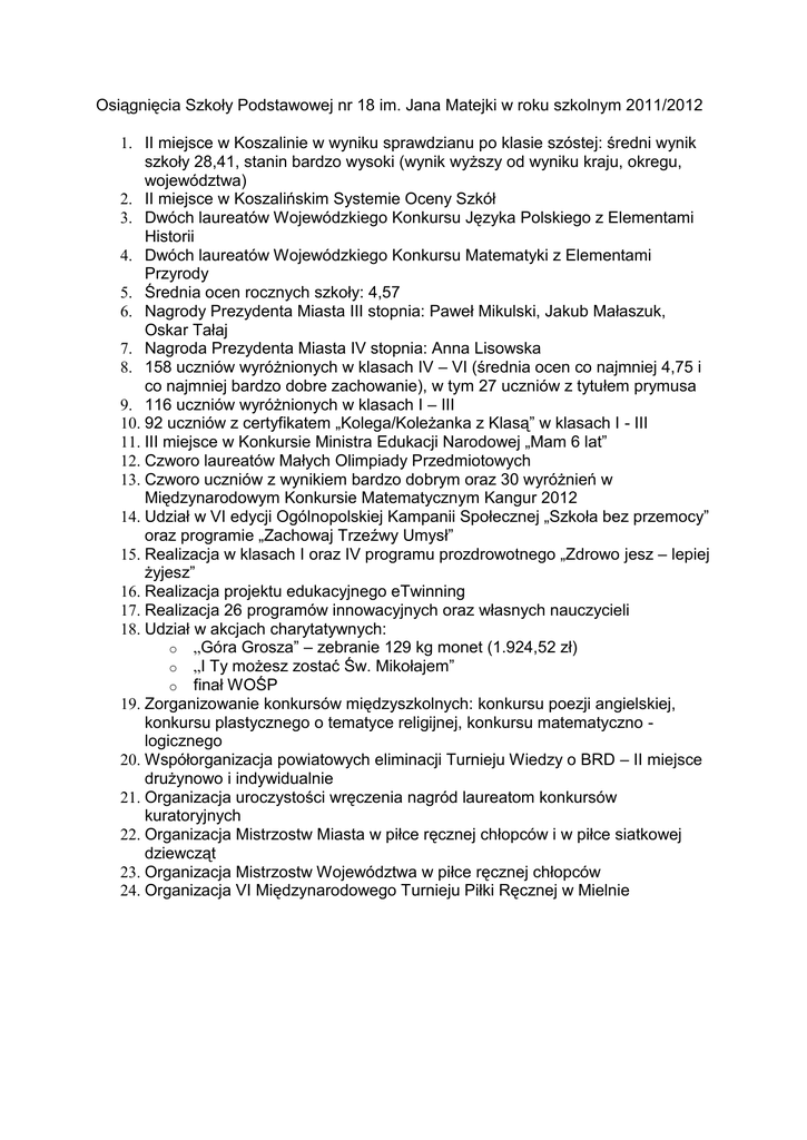 Osiągnięcia Szkoły Podstawowej nr 18 im. Jana Matejki w roku szkolnym 2011/2012 1. II miejsce w Koszalinie w wyniku sprawdzianu po klasie szóstej: średni wynik szkoły 28,41, stanin bardzo wysoki (wynik wyższy od wyniku kraju, okregu, województwa) 2. II miejsce w Koszalińskim Systemie Oceny Szkół 3. Dwóch laureatów Wojewódzkiego Konkursu Języka Polskiego z Elementami Historii 4. Dwóch laureatów Wojewódzkiego Konkursu Matematyki z Elementami Przyrody 5. Średnia ocen rocznych szkoły: 4,57 6. Nagrody Prezydenta Miasta III stopnia: Paweł Mikulski, Jakub Małaszuk, Oskar Tałaj 7. Nagroda Prezydenta Miasta IV stopnia: Anna Lisowska 8. 158 uczniów wyróżnionych w klasach IV – VI (średnia ocen co najmniej 4,75 i co najmniej bardzo dobre zachowanie), w tym 27 uczniów z tytułem prymusa 9. 116 uczniów wyróżnionych w klasach I – III 10. 92 uczniów z certyfikatem „Kolega/Koleżanka z Klasą” w klasach I - III 11. III miejsce w Konkursie Ministra Edukacji Narodowej „Mam 6 lat” 12. Czworo laureatów Małych Olimpiady Przedmiotowych 13. Czworo uczniów z wynikiem bardzo dobrym oraz 30 wyróżnień w Międzynarodowym Konkursie Matematycznym Kangur 2012 14. Udział w VI edycji Ogólnopolskiej Kampanii Społecznej „Szkoła bez przemocy” oraz programie „Zachowaj Trzeźwy Umysł” 15. Realizacja w klasach I oraz IV programu prozdrowotnego „Zdrowo jesz – lepiej żyjesz” 16. Realizacja projektu edukacyjnego eTwinning 17. Realizacja 26 programów innowacyjnych oraz własnych nauczycieli 18. Udział w akcjach charytatywnych: o „Góra Grosza” – zebranie 129 kg monet (1.924,52 zł) o „I Ty możesz zostać Św. Mikołajem” o finał WOŚP 19. Zorganizowanie konkursów międzyszkolnych: konkursu poezji angielskiej, konkursu plastycznego o tematyce religijnej, konkursu matematyczno logicznego 20. Współorganizacja powiatowych eliminacji Turnieju Wiedzy o BRD – II miejsce drużynowo i indywidualnie 21. Organizacja uroczystości wręczenia nagród laureatom konkursów kuratoryjnych 22. Organizacja Mistrzostw Miasta w piłce ręcznej chłopców i w piłce siatkowej dziewcząt 23. Organizacja Mistrzostw Województwa w piłce ręcznej chłopców 24. Organizacja VI Międzynarodowego Turnieju Piłki Ręcznej w Mielnie Najważniejsze osiągnięcia sportowe 1. Srebrny medal mistrzostw województwa w piłce ręcznej chłopców 2. Udział w finale wojewódzkim dziewcząt 3. I miejsce w mistrzostwach miasta w skoku wzwyż 4. Finał wojewódzki w indywidualnych biegach przełajowych 5. I miejsce w ogólnopolskim turnieju minipiłki siatkowej w Wałczu 6. IV miejsce w międzynarodowym turnieju miłki ręcznej w Szczecinie 7. I miejsce w turnieju minipiłki ręcznej w Golczewie 8. I miejsce w turnieju piłki ręcznej w Szczecinie kl IV 9. VII miejsce w międzynarodowym turnieju piłki siatkowej w Gdańsku 10. Srebrny medal w mistrzostwach miasta wpływaniu dziewcząt kl II Sukcesy uczniów w konkursach pozaszkolnych Interdyscyplinarny Konkurs Matematyczny z Elementami Przyrody (etap rejonowy) Oskar Tałaj kl. VI b Paweł Mikulski kl. VI b Interdyscyplinarny Konkurs Języka Polskiego z Elementami Historii (etap rejonowy) Karolina Raniszewska kl. VI c Jakub Małaszuk kl. VI b Paweł Mikulski kl. VI b Interdyscyplinarny Konkurs Języka Polskiego z Elementami Historii (etap wojewódzki) Paweł Mikulski kl. VI b Jakub Małaszuk kl. VI b Interdyscyplinarny Konkurs Matematyczny z Elementami Przyrody (etap wojewódzki) Oskar Tałaj kl. VI b Paweł Mikulski kl. VI b MAŁE OLIMPIADY PRZEDMIOTOWE - ETAP MIEJSKI Mała Olimpiada Przedmiotowa z Muzyki I miejsce – Anna Lisowska kl. VI c Mała Olimpiada Przedmiotowa z Przyrody III miejsce – Filip Podgórski kl. VI d Mała Olimpiada Przedmiotowa z Języka Polskiego III miejsce – Sandra Wikarska kl. VI c Olimpiada Malucha III miejsce – Kacper Natusiewicz kl. III c I etap Ogólnopolskiej Kampanii „Zachowaj trzeźwy umysł” 2011 zorganizowany przez Stowarzyszenie Producentów Dziennikarzy Radiowych Konkurs plastyczny „ Rosnę – Myślę – Dbam” Laureaci: Lilianna Grochowska kl. V b Dominika Usik kl. III a Magdalena Fabianiak kl. VI c Kinga Kopera – ubiegłoroczna uczennica SP 18 – absolwentka Międzyszkolny Konkurs Piosenki Patriotycznej i Żołnierskiej organizowany przez SP 18 w Koszalinie I miejsce – duet: Wiktoria Burek kl. III b, Karina Kujawa kl. III b III miejsce – Chór szkolny kl. I – III Wyróżnienie: Julia Krawczyk kl. II c Rejonowy Konkurs Plastyczny PCK pod hasłem „90 lat działalności młodzieży PCK” I miejsce – Magdalena Krukowska kl. V d II miejsce – Magdalena Radmerska kl. IV e II Międzyszkolny Konkurs Historyczno –Przyrodniczy „Mikołaj Kopernik – Wielki Astronom” organizowany przez SP Nr 9 w Koszalinie. III miejsce –SP 18 Zespół z klasy VI d w składzie: 1. Maja Pękała 2. Katarzyna Gębka 3. Mateusz Gładysz 4. Mateusz Polaszek Międzyszkolny Konkurs „6x6” zorganizowany przez Gimnazjum Nr 6 I miejsce drużyna SP 18 Zespół w składzie: 1. Sandra Wikarska kl. VI c 2. Jakub Małaszuk kl. VI b 3. Paweł Mikulski kl. VI b XXVIII Międzynarodowy Konkurs Literackiej Twórczości Dzieci i Młodzieży zorganizowany przez Gimnazjum nr 2 im. Ks. Jana Twardowskiego w Słupsku Wyróżnienie: Wiktoria Wójcik z kl. VI c Międzyszkolny konkurs dla uczniów klas VI pt. „Powietrze i jego znaczenie”, zorganizowany przez Gimnazjum nr 11 im. Lotników Polskich w Koszalinie II miejsce – SP 18 Zespół w składzie: Oskar Wielgosz kl. VI a Julia Łyczko kl. VI c Karolina Raniszewska kl. VI c III miejsce - w zmaganiach indywidualnych: Karolina Raniszewska kl. VI c Międzyszkolny konkurs plastyczny wielkanocny na kartkę i ozdobę zorganizowany przez klub osiedlowy „W Klocku” I miejsce – Kinga Mazur kl. III d I miejsce – Aleksandra Juśkiewicz kl. III a II miejsce – Zuzanna Bastek kl. III a III miejsce – Dawid Nykiel kl. III a III miejsce – Hanna Kwietniewska k
