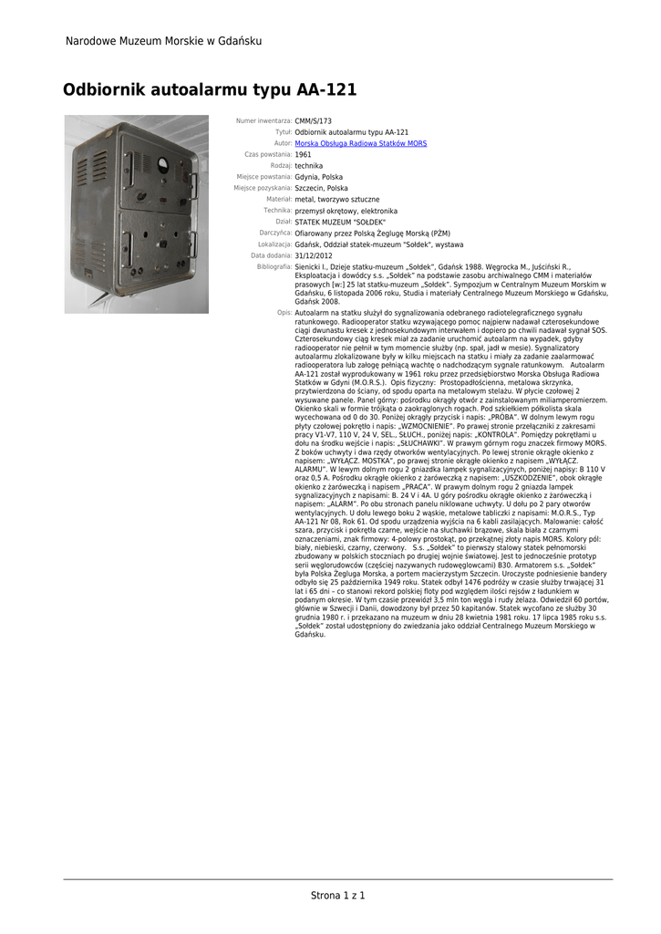 Narodowe Muzeum Morskie w Gdańsku Odbiornik autoalarmu typu AA-121 Numer inwentarza: CMM/S/173 Tytuł: Odbiornik autoalarmu typu AA-121 Autor: Morska Obsługa Radiowa Statków MORS Czas powstania: 1961 Rodzaj: technika Miejsce powstania: Gdynia, Polska Miejsce pozyskania: Szczecin, Polska Materiał: metal, tworzywo sztuczne Technika: przemysł okrętowy, elektronika Dział: STATEK MUZEUM "SOŁDEK" Darczyńca: Ofiarowany przez Polską Żeglugę Morską (PŻM) Lokalizacja: Gdańsk, Oddział statek-muzeum "Sołdek", wystawa Data dodania: 31/12/2012 Bibliografia: Sienicki I., Dzieje statku-muzeum „Sołdek”, Gdańsk 1988. Węgrocka M., Juściński R., Eksploatacja i dowódcy s.s. „Sołdek” na podstawie zasobu archiwalnego CMM i materiałów prasowych [w:] 25 lat statku-muzeum „Sołdek”. Sympozjum w Centralnym Muzeum Morskim w Gdańsku, 6 listopada 2006 roku, Studia i materiały Centralnego Muzeum Morskiego w Gdańsku, Gdańsk 2008. Opis: Autoalarm na statku służył do sygnalizowania odebranego radiotelegraficznego sygnału ratunkowego. Radiooperator statku wzywającego pomoc najpierw nadawał czterosekundowe ciągi dwunastu kresek z jednosekundowym interwałem i dopiero po chwili nadawał sygnał SOS. Czterosekundowy ciąg kresek miał za zadanie uruchomić autoalarm na wypadek, gdyby radiooperator nie pełnił w tym momencie służby (np. spał, jadł w mesie). Sygnalizatory autoalarmu zlokalizowane były w kilku miejscach na statku i miały za zadanie zaalarmować radiooperatora lub załogę pełniącą wachtę o nadchodzącym sygnale ratunkowym. Autoalarm AA-121 został wyprodukowany w 1961 roku przez przedsiębiorstwo Morska Obsługa Radiowa Statków w Gdyni (M.O.R.S.). Opis fizyczny: Prostopadłościenna, metalowa skrzynka, przytwierdzona do ściany, od spodu oparta na metalowym stelażu. W płycie czołowej 2 wysuwane panele. Panel górny: pośrodku okrągły otwór z zainstalowanym miliamperomierzem. Okienko skali w formie trójkąta o zaokrąglonych rogach. Pod szkiełkiem półkolista skala wycechowana od 0 do 30. Poniżej okrągły przycisk i napis: „PRÓBA”. W dolnym lewym rogu płyty czołowej pokrętło i napis: „WZMOCNIENIE”. Po prawej stronie przełączniki z zakresami pracy V1-V7, 110 V, 24 V, SEL., SŁUCH., poniżej napis: „KONTROLA”. Pomiędzy pokrętłami u dołu na środku wejście i napis: „SŁUCHAWKI”. W prawym górnym rogu znaczek firmowy MORS. Z boków uchwyty i dwa rzędy otworków wentylacyjnych. Po lewej stronie okrągłe okienko z napisem: „WYŁĄCZ. MOSTKA”, po prawej stronie okrągłe okienko z napisem „WYŁĄCZ. ALARMU”. W lewym dolnym rogu 2 gniazdka lampek sygnalizacyjnych, poniżej napisy: B 110 V oraz 0,5 A. Pośrodku okrągłe okienko z żaróweczką z napisem: „USZKODZENIE”, obok okrągłe okienko z żaróweczką i napisem „PRACA”. W prawym dolnym rogu 2 gniazda lampek sygnalizacyjnych z napisami: B. 24 V i 4A. U góry pośrodku okrągłe okienko z żaróweczką i napisem: „ALARM”. Po obu stronach panelu niklowane uchwyty. U dołu po 2 pary otworów wentylacyjnych. U dołu lewego boku 2 wąskie, metalowe tabliczki z napisami: M.O.R.S., Typ AA-121 Nr 08, Rok 61. Od spodu urządzenia wyjścia na 6 kabli zasilających. Malowanie: całość szara, przycisk i pokrętła czarne, wejście na słuchawki brązowe, skala biała z czarnymi oznaczeniami, znak firmowy: 4-polowy prostokąt, po przekątnej złoty napis MORS. Kolory pól: biały, niebieski, czarny, czerwony. S.s. „Sołdek” to pierwszy stalowy statek pełnomorski zbudowany w polskich stoczniach po drugiej wojnie światowej. Jest to jednocześnie prototyp serii węglorudowców (częściej nazywanych rudowęglowcami) B30. Armatorem s.s. „Sołdek” była Polska Żegluga Morska, a portem macierzystym Szczecin. Uroczyste podniesienie bandery odbyło się 25 października 1949 roku. Statek odbył 1476 podróży w czasie służby trwającej 31 lat i 65 dni – co stanowi rekord polskiej floty pod względem ilości rejsów z ładunkiem w podanym okresie. W tym czasie przewiózł 3,5 mln ton węgla i rudy żelaza. Odwiedził 60 portów, głównie w Szwecji i Danii, dowodzony był przez 50 kapitanów. Statek wycofano ze służby 30 grudnia 1980 r. i przekazano na muzeum w dniu 28 kwietnia 1981 roku. 17 lipca 1985 roku s.s. „Sołdek” został udostępniony do zwiedzania jako oddział Centralnego Muzeum Morskiego w Gdańsku. Strona 1 z 1