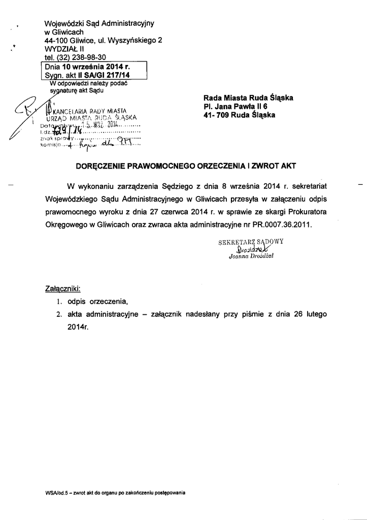 Wojewódzki S ąd Administracyjny w Gliwicach 44-100 Gliwice, ul. Wyszy ńskiego 2 WYDZIAŁ II tel. (32) 238-98-30 Dnia 10 września 2014 r. Sygn. akt II SA/GI 217/14 ł W odpowiedzi należy podać akt Sądu syturę gna KANCELARIA RADY MIASTA URZĄ D MIASTA RUDA ŚTASKA 049 utt;1, ;;.. i.dz.ini n .44 Do Rada Miasta Ruda Śląska Pl. Jana Pawła II 6 41- 709 Ruda Śląska 2(1.1 4 9 znak sp o y kornisJo...,+ DORĘCZENIE PRAWOMOCNEGO ORZECZENIA I ZWROT AKT W wykonaniu zarządzenia Sędziego z dnia 8 września 2014 r. sekretariat Wojewódzkiego S ądu Administracyjnego w Gliwicach przesyła w załączeniu odpis prawomocnego wyroku z dnia 27 czerwca 2014 r. w sprawie ze skargi Prokuratora Okręgowego w Gliwicach oraz zwraca akta administracyjne nr PR.0007.36.2011. SEKRETARZ S ĄDOWY Joanna Drożdżał Załaczniki: 1. odpis orzeczenia, 2. akta administracyjne — załącznik nadesłany przy pi śmie z dnia 26 lutego 2014r. WSNod.5 — zwrot akt do organu po zako ńczeniu postępowania Sygn. akt II SA/GI 217/14 ODPIS WYROK W IMIENIU RZECZYPOSPOLITEJ POLSKIEJ Dnia 27 czerwca 2014 r. Wojewódzki Sąd Administracyjny w Gliwicach w składzie nastę pującym: Przewodniczący Sę dzia NSA Bonifacy Bronkowski Sędziowie Sę dzia WSA Piotr Broda, Sę dzia WSA Maria Taniewska-Banacka (spr.) specjalista Ewa J ędrasik Protokolant po rozpoznaniu na rozprawie w dniu 27 czerwca 2014 r. sprawy ze skargi Prokuratora Okr ę gowego w Gliwicach na uchwałę Rady Miasta Ruda Ś ląska z dnia 24 lutego 2011 r. nr PR.0007.36.2011 w przedmiocie ustalenia wysoko ści stawek opł at za zaj ęcie pasa drogowego dróg publicznych stwierdza niewa żność zaskarżonej uchwały w części obejmującej § 2 ust 3 oraz § 4 ust 2. Na oryginale w łaściwe podpisy Za godność z oryginałem SEKRETARZ S ĄDOWY 2.d2/217 Joanna Droklżal Wyrok z dnia -6 °c 4' 4 ' sygn. akt Restatravvietrre prawomoony(e) od dnia WSA/wyr.1 — sentencja wy oku 0-16( d/l « J8, 08. l-o$ S ę dzi jest