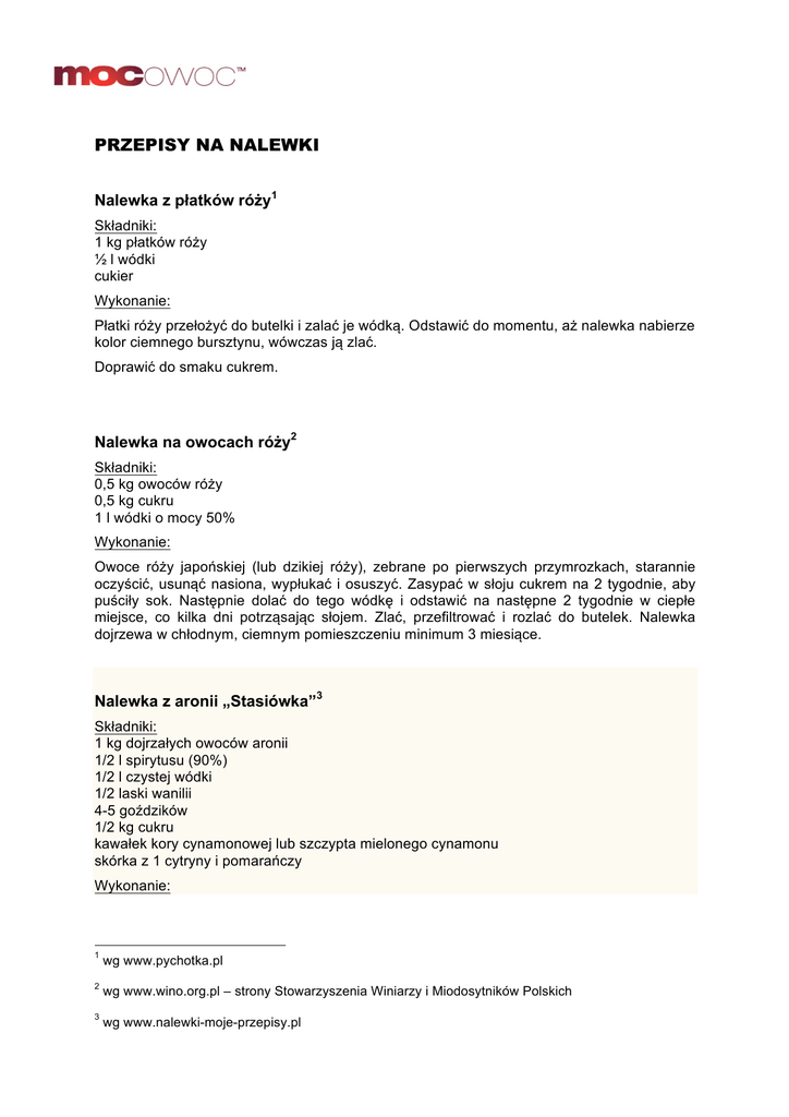 PRZEPISY NA NALEWKI Nalewka z płatków róży1 Składniki: 1 kg płatków róży ½ l wódki cukier Wykonanie: Płatki róży przełożyć do butelki i zalać je wódką. Odstawić do momentu, aż nalewka nabierze kolor ciemnego bursztynu, wówczas ją zlać. Doprawić do smaku cukrem. Nalewka na owocach róży2 Składniki: 0,5 kg owoców róży 0,5 kg cukru 1 l wódki o mocy 50% Wykonanie: Owoce róży japońskiej (lub dzikiej róży), zebrane po pierwszych przymrozkach, starannie oczyścić, usunąć nasiona, wypłukać i osuszyć. Zasypać w słoju cukrem na 2 tygodnie, aby puściły sok. Następnie dolać do tego wódkę i odstawić na następne 2 tygodnie w ciepłe miejsce, co kilka dni potrząsając słojem. Zlać, przefiltrować i rozlać do butelek. Nalewka dojrzewa w chłodnym, ciemnym pomieszczeniu minimum 3 miesiące. Nalewka z aronii „Stasiówka”3 Składniki: 1 kg dojrzałych owoców aronii 1/2 l spirytusu (90%) 1/2 l czystej wódki 1/2 laski wanilii 4-5 goździków 1/2 kg cukru kawałek kory cynamonowej lub szczypta mielonego cynamonu skórka z 1 cytryny i pomarańczy Wykonanie: 1 wg www.pychotka.pl 2 wg www.wino.org.pl – strony Stowarzyszenia Winiarzy i Miodosytników Polskich 3 wg www.nalewki-moje-przepisy.pl Owoce umyć i osuszyć następnie przełożyć do niewielkiego gąsiorka, lekko ugnieść. Wanilię i skórkę cytrusową drobno posiekać i wymieszać z owocami. Spirytus wymieszać z wódką, zalać owoce i wystawić w ciepłe miejsce przynajmniej na miesiąc. Po upływie miesiąca nalewkę z aronii zlać do innego naczynia, a owoce zasypać cukrem i wymieszać, energicznie potrząsając. Nalewkę z aronii należy ponownie odstawić w ciepłe miejsce. Codziennie potrząsając gąsiorkiem dopóki cukier się całkiem nie rozpuści. Syrop zalać, wyciskając owoce przez bawełnianą szmatkę. Pozyskaną nalewkę z aronii należy przefiltrować przez gazę i przelać do butelek. Nalewka z aronii osiąga pełnie smaku osiąga po paru miesiącach leżakowania w ciemnym i chłodnym miejscu. Pigwowy likier z Zurychu Już w roku 1889 czasopismo „Möllers Deutsche Gärtnerzeitung” wydrukowało przepis na likier opracowany przez ogrodnika Olbricha z Zurichu: Owoce są zbierane przed przymrozkami i przecierane na tarce. Powstała masa jest następnie delikatnie przeciskana przez gazę, jednakże nie za mocno, gdyż w przeciwnym razie otrzyma się zbyt dużo osadu. Otrzymany sok jest gotowany z cukrem (750 g cukru na każdy litr soku) oraz dokładnie odszumowywany. Po wystarczającym ochłodzeniu do 1 litra soku dodaje się 0,5 litra dobrego spirytusu. Sok nalewa się do butelek i dobrze wygotowuje. Zamiast spirytusu można użyć również dobrej wódki zbożowej. Gdy mieszanina odstała kilka tygodni w butelkach, jest ona gotowa do spożycia. Im starsza będzie, tym lepiej będzie smakować. Wódka pigwowa (niemiecki przepis z 1786 r.) Najpierw pigwy muszą zostać oczyszczone za pomocą ścierki, a następnie na tarce należy zetrzeć taką ich ilość, aby można było przez ścierkę wycisnąć sześć kwart4 soku. Ten sok umieszcza się w naczyniu, dodaje cztery kwarty spirytusu winnego5, obok pestek 60 brzoskwiń i 60 moreli, które należy grubo zmielić, drobno pokrojonego cynamonu i goździków, jak i jednego funta drobnego cukru kanaryjskiego 6. Naczynie musi być jednak tak duże, aby z tymi wszystkimi składnikami nie było całkiem pełne. Jest ono następnie zamykane i odstawiane na 3 do 4 tygodni, jednak trzeba je codziennie raz wstrząsnąć. Następnie próbuje się, czy wódka jest dobra, i przechowuje się ją potem w butelkach. 4 1 kwarta berlińska była równa 1,145 litra. 5 Spirytus, który otrzymuje się w procesie destylacji wina gronowego lub wytłoków winogronowych, zwykle o mocy 65-70º. 6 Tradycyjna nazwa cukru trzcinowego. TM MOCOWOC – kolekcja ośmiu dekoracyjnych krzewów owocowych o szczególnie cennych właściwościach smakowych, zdrowotnych i kulinarnych, oferowana od maja 2011 r. przez szkółkę Grąbczewscy. Facebook.com/MOCOWOC SZKÓŁKA GRĄBCZEWSCY Historia szkółek rodziny Grąbczewskich sięga roku 1936, w którym Leopold Grąbczewski rozpoczął produkcję krzewów róż. Obecnie szkółki znajdują się w Runowie koło Warszawy i oferują pełen asortyment roślin dostępny przez cały rok: byliny, krzewy iglaste i liściaste, drzewa alejowe. Szersze informacje o szkółkach dostępne są na stronie www.grabczewscy.pl Dodatkowych informacji udziela: Barbara Czerniawska Tel. + 604 16 16 06 e-mail: [email protected]