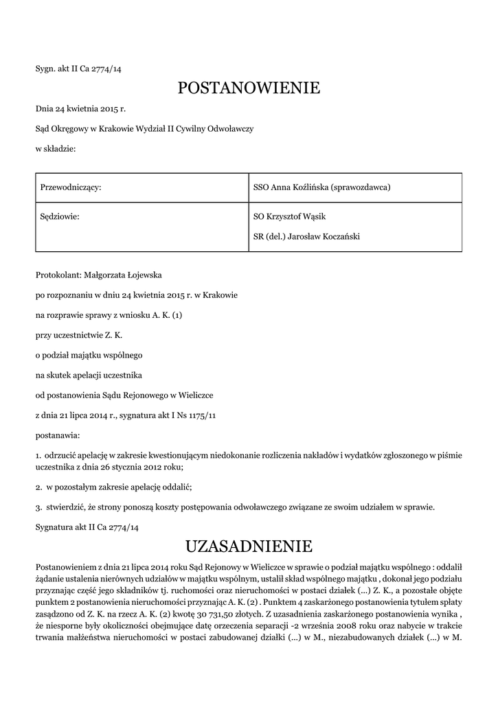 Sygn. akt II Ca 2774/14 POSTANOWIENIE Dnia 24 kwietnia 2015 r. Sąd Okręgowy w Krakowie Wydział II Cywilny Odwoławczy w składzie: Przewodniczący: SSO Anna Koźlińska (sprawozdawca) Sędziowie: SO Krzysztof Wąsik SR (del.) Jarosław Koczański Protokolant: Małgorzata Łojewska po rozpoznaniu w dniu 24 kwietnia 2015 r. w Krakowie na rozprawie sprawy z wniosku A. K. (1) przy uczestnictwie Z. K. o podział majątku wspólnego na skutek apelacji uczestnika od postanowienia Sądu Rejonowego w Wieliczce z dnia 21 lipca 2014 r., sygnatura akt I Ns 1175/11 postanawia: 1. odrzucić apelację w zakresie kwestionującym niedokonanie rozliczenia nakładów i wydatków zgłoszonego w piśmie uczestnika z dnia 26 stycznia 2012 roku; 2. w pozostałym zakresie apelację oddalić; 3. stwierdzić, że strony ponoszą koszty postępowania odwoławczego związane ze swoim udziałem w sprawie. Sygnatura akt II Ca 2774/14 UZASADNIENIE Postanowieniem z dnia 21 lipca 2014 roku Sąd Rejonowy w Wieliczce w sprawie o podział majątku wspólnego : oddalił żądanie ustalenia nierównych udziałów w majątku wspólnym, ustalił skład wspólnego majątku , dokonał jego podziału przyznając część jego składników tj. ruchomości oraz nieruchomości w postaci działek (...) Z. K., a pozostałe objęte punktem 2 postanowienia nieruchomości przyznając A. K. (2) . Punktem 4 zaskarżonego postanowienia tytułem spłaty zasądzono od Z. K. na rzecz A. K. (2) kwotę 30 731,50 złotych. Z uzasadnienia zaskarżonego postanowienia wynika , że niesporne były okoliczności obejmujące datę orzeczenia separacji -2 września 2008 roku oraz nabycie w trakcie trwania małżeństwa nieruchomości w postaci zabudowanej działki (...) w M., niezabudowanych działek (...) w M. oraz nieruchomości w postaci 6 działek położonych w G.. Poza sporem pozostawało także nabycie w trakcie związku stron objętych działem ruchomości. Ponadto sąd pierwszej instancji ustalił między innymi to , że po zawarciu związku małżeńskiego, strony do grudnia 1990 roku wspólnie zamieszkiwały oraz pracowały w Niemczech . Po zajściu w ciążę A. K. (2) wróciła do Polski i zamieszkała u matki uczestnika . W 1991 roku zamieszkała w wynajętym mieszkaniu w K., a od 1993 roku mieszkała w budynku na terenie nieruchomości w M.. Przez cały czas trwania wspólności Z. K. pracował na terenie Niemiec , przebywając tam przez trzy tygodnie każdego miesiąca w sezonie wiosenno- letnim . W okresach od listopada do lutego, także przebywał w domu. A. K. (2) zajmowała się domem i dziećmi , które były zadbane i otoczone opieką . W części obejmującej rozważania prawne sąd pierwszej instancji wskazał na przepisy art. 43 par 1 i 2 kriop oraz stwierdził brak podstaw dla ustalenia nierównych udziałów małżonków w majątku wspólnym, wobec nie spełnienia żadnej z przesłanek mogących uzasadniać uwzględnienie takiego żądania . Zdaniem sądu rejonowego dla ustalenia nierównych udziałów we wspólnym majątku, nie jest wystarczające odwoływanie się wyłącznie do wymiernych ekonomicznych proporcji w jakich małżonkowie przyczynili się do jego powstania, albowiem równoważne z nimi jest osobiste angażowanie się w wychowanie dzieci i praca w gospodarstwie domowym . Nie może też być podstawą dla modyfikowania ustawowych, równych udziałów we wspólnym majątku , aktualna wzajemna niechęć do siebie stron postępowania .W dalszej części uzasadnienia sąd rejonowy wskazując na przepisy art .567 par 3 kpc i art.688 kpc a w związku z tym art. 680-689 kpc oraz art. 617 -625 kpc, zsumował wartość składników majątku wspólnego, która odpowiada kwocie 915 937 złotych , ustalił wartość udziałów na kwoty po 457 968 złotych oraz stwierdził , że skoro wnioskodawczyni otrzymała składniki o wartości mniejszej od połowy o 32 355 , 50 złotych uwzględniono jej wniosek o spłatę kwoty 30 731, 50 złotych. Uczestnik w apelacji od powyższego postanowienia zaskarżając je w całości zarzucił : -błąd w ustaleniach faktycznych a w konsekwencji naruszenie art. 43 par 2 kriop polegający na ustaleniu , że nie zachodzą ważne powody uzasadniające ustalenie nierównych udziałów , pomimo tego, że całokształt zgromadzonych dowodów wskazywał na zasadność takiego żądania; -naruszenie art. 684 kpc poprzez nieustalenie w orzeczeniu wartości wspólnego majątku ; -naruszenie art. 45 par 1 kriop poprzez pominięcie wniosku uczestnika zgłoszonego w odpowiedzi na wniosek z dnia 26 stycznia 2012 roku o rozliczenie wydatków i nakładów poniesionych przez uczestnika z majątku osobistego na wspólny majątek, a w konsekwencji nie rozliczenie tych wydatków i nakładów. Wskazując na powyższe zarzuty uczestnik wniósł o uchylenie zaskarżonego postanowienia w całości . W uzasadnieniu apelacji uczestnik wyeksponował w sposób szczególny fakt związania się wnioskodawczyni z innym mężczyzną i zerwania wieloletniego pożycia małżeńskiego oraz to, że do wniosku o rozliczenie nakładów sąd pierwszej instancji w ogóle nie odniósł się ani w sentencji ani w uzasadnieniu zaskarżonego postanowienia . Sąd Okręgowy zważył . Apelacja jest bezzasadna pomimo , iż jest faktem całkowite pominięcie wniosku o rozliczenie nakładów zgłoszonego przez uczestnika w piśmie z dnia 26 stycznia 2012 roku. Powyższe uchybienie przepisom procedury nie wpływa jednak na pozytywna ocenę zaskarżonego postanowienia . Stan faktyczny poprawnie ustalony przez sąd pierwszej instancji sąd odwoławczy przyjął za własny, czyniąc go tym samym podstawą faktyczną rozstrzygnięcia apelacyjnego. Uchybienie polegające na całkowitym pominięciu żądań uczestnika zgłoszonych w piśmie z dnia 26 stycznia 2012 roku obejmujących wpłaty i wydatki czynione po ustaniu wspólności, niewątpliwie popełnione przez sąd pierwszej instancji, nie ma wpływu na ocenę poprawności zaskarżonego po
