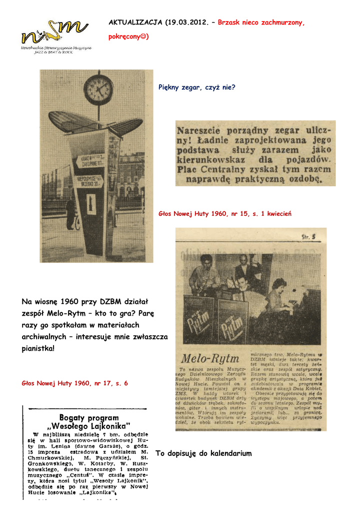 AKTUALIZACJA (19.03.2012. – Brzask nieco zachmurzony, pokręcony☺ ☺) Piękny zegar, czyż nie? Głos Nowej Huty 1960, nr 15, s. 1 kwiecień Na wiosnę 1960 przy DZBM działał zespół Melo-Rytm – kto to gra? Parę razy go spotkałam w materiałach archiwalnych – interesuje mnie zwłaszcza pianistka! Głos Nowej Huty 1960, nr 17, s. 6 To dopisuję do kalendarium Taka ciekawostka – Jazz Camping wzbudził sensację, a Wiesław Górnicki napisał w Dookoła Świata o … prawie Sodomie i Gomorze, jakie tam się odbywały. Od tej pory jazzmani go nie tolerowali, więc przerzucił się na bigbeat☺ ☺ Dziennik Polski 1960, nr 32, s. 4 7,8 lutego – kto to na zdjęciu? Komeda? – z boku na pewno Krzysztof Komeda. Na perkusji Władysław Jagiełło? Na saksofonie Namysłowski? No cóż – trzeba oglądnąć „Niewinnych czarodziejów” Andrzeja Wajdy. Ależ rozrabiali Ci jazzmani☺ ☺ Jazz Camping jest od paru lat reaktywowany. Trzeba się kiedyś wybrać! O! proszę – 7 lutego 1960 debiut poetycki Elżbiety Zechenter w Radio Kraków☺ ☺ Pozdrowienia dla barda nowohuckiego – Rower nie pije, nie pali to jej współdziełko☺ ☺ I jeszcze przygoda nienowohucka Piotra Skrzyneckiego (ale w Nowej Hucie był instruktorem nawet przez jakiś czas, kulturalnym zresztą kiedyś☺ ☺ Dziennik Polski 1960, nr 35, s. 6, 11 lutego Dokładam kalendarz ówczesny, żeby lepiej się orientować! KALENDARIUM: ROK 1955 1. 27 listopada 1955 – pierwszy koncert quasi jazzowy w Domu Młodego Robotnika 2. 7 grudnia 1955 – koncert zespołu Andrzeja Kurylewicza i Wandy Warskiej w sali Zespołu Pieśni i Tańca na os. C-2 (obecnie os. Górali) 3. 17 grudnia 1955 – ponownie Andrzej Kurylewicz i Wanda Warska, także Zbigniew Cieplik na harmonijce ustnej (sala Teatru Ludowego). ROK 1956 4. Luty 1956 (2 lutego) - Usłyszymy urocze piosenki francuskie i polskie w wykonaniu milutkiej Michel Balard, Polski z Francji, która powróciła do ojczyzny i tym razem śpiewa przy akompaniamencie pierwszego prawdziwie jazzowego zespołu nowohuckiego, wychowanków ZDK…. Koncert w ramach powstałej właśnie Estrady przy Teatrze Ludowym – kierownik artystyczny Jerzy Horecki. 5. 5 marca 1956 – koncert „Błękitnego jazzu” w hali sportowej ZS „Gwardia” oklaskiwało ponad 5 tys. Robotników Huty im. Lenina 6. 12 kwietnia – koncert Zespołu Estradowego z Morawskiej Ostrawy 7. Maj 1956 - koncert autorstwa Stanisława Florka „Kombinat humoru, piosenki, jazzu i tańca” 8. 9 czerwca 1956 r. „Turniej jazzowy” w hali ZS „Gwardia” z udziałem zespołu „Drążek i Pięciu” z Krakowa, zespołu Władysława Kowalczyka z Warszawy i zespołu Jerzego Grzewińskiego z Poznania. Wystąpiła także Jeanne Johnstone. Zapowiadał Leszek Herdegen. No i chyba to jednak HALA WISŁY! 9. Czerwiec 1956 – zespół rytmiczny ZDK HiL gra jazz w Ostrawie (w tym zespole na pewno grał Józef Krzeczek, kto jeszcze – na razie nie wiem, może ktoś wie?) 10. 3, 4, 5 lipca – koncert orkiestry jazzowej Karola Vlacha w hali ZS „Gwardia” w Nowej Hucie. Tutaj także – pewnie jednak Hala Wisły. 11. 24 lipca w Nowej Hucie koncert m.in. orkiestry jazzowej Charlesa Bovery – oczywiście Hala Garaży! 12. Październik – grudzień - konkurs instrumentalistów i zespołów jazzowych i rozrywkowych „Echa Krakowa” oraz Polskiego Radia Kraków. ROK 1957 13. 22 lutego 1957 – jam-session w Nowohuckim Klubie Jazzowym prowadzonym przez Stanisława Florka. Występują zespoły nowohuckie: Kolorowy jazz, Modern Sekstet, zespół kierowany przez Henryka Figla, Taddy Jazz, Jazz-Plastic. Gościnnie: Andrzej Kurylewicz, Lesław Lic, Andrzej Trzaskowski i inni. 14. Marzec – zmiana lokalu ZDK – z ulicy Bulwarowej, z Domu Młodego Robotnika przenosi się do Domu Młodego Hutnika, os. C-2 Południe. 15. 7 kwietnia – impreza w Klubie Jazzowym (DMR? Czy Ognisko Młodych ZMS?) – grają: Kolorowy Jazz, Melodix, Andrzej Trzaskowski, Wojciech Karolak, Jan Byrczek, Jan Chmielewski i inni goście z Krakowa (Kto?) 16. 11 kwietnia – orkiestra Glenna Millera gra w Filharmonii, potem jam-session w Yacht Klubie przy ul. Zwierzynieckiej – obecny m.in. Stanisław Florek, szef właśnie powstałego oficjalnie Nowohuckiego Klubu Jazzowego. Zaś solo na trąbce gra wtedy Józef Krzeczek. 17. 1 maja – koncert „Kolorowego jazzu” na placu obok kina Świt 18. 1 maja – dom kultury ZBM (co to za skrót?) – koncert orkiestry „Błękitny jazz” 19. 13 czerwca – Hala Gwardii – koncert szwajcarskiego zespołu jazzowego „The Tremble kids”. Czy byli w Nowej Hucie? 20. 21 lipca – Hala Garaży – Zgaduj Zgadula – gra zespół jazzowy J. Mazurkiewicza, soliści Dana Lerska i H. Chmielewska, M. Jurga 21. 6 grudnia - jam-session w Ognisku Młodych ZMS, os. Młodości 1. Dominował styl nowoczesny, w którym na szczególną uwagę zasługiwała gra Stanisława Kalwińskiego (bs) i Wojciecha Karolaka (as), natomiast z muzyków nowohuckich wyróżnił się Józef Krzeczek (Tb). 22. 11 grudnia - jam-session w Ognisku Młodych ZMS, os. Młodości 1 z udziałem zachodnio-niemieckiego zespołu Paula Würgesa ROK 1958 23. 6 lutego – zabawa taneczna z zespołem „Rytm” w Klubie Rozrywkowym przy ul. Kocmyrzowskiej 24. 13 marca – jam session w Ognisku Młodych ZMS z udziałem Katarzyny Gaertner i ….. 25. 14, 15 marca – występy zespołu Dave Brubecka w Rotundzie, jam-session w Klubie Literatów 26. Grudzień 1958 – konkurs śpiewaczy, a później zespołów jazzowych i rozrywkowych w Ognisku Młodych ZMS (os. Młodości). ROK 1959 27. W styczniu występował w Arkadii zespół 4 tancerek „Mambo Girls” – podobno z dużym powodzeniem, a najbardziej podobało się hula-hoop i rumba. Hula-hoop – ponieważ ogłaszano w tym zakresie☺ konkurs dla panów. Jakiś Pan pamięta? 28. 18 listopada – koncert orkiestry Andrzeja Kurylewicza z Wandą Warską. Organizował ZDK HiL czyli albo sala Ogniska Młodych,