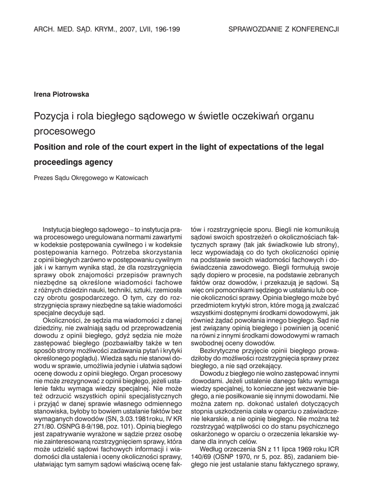 ARCH. MED. SĄD. KRYM., 2007, LVII, 196-199 Sprawozdanie z konferencji Irena Piotrowska Pozycja i rola biegłego sądowego w świetle oczekiwań organu procesowego Position and role of the court expert in the light of expectations of the legal proceedings agency Prezes Sądu Okręgowego w Katowicach Instytucja biegłego sądowego – to instytucja prawa procesowego uregulowana normami zawartymi w kodeksie postępowania cywilnego i w kodeksie postępowania karnego. Potrzeba skorzystania z opinii biegłych zarówno w postępowaniu cywilnym jak i w karnym wynika stąd, że dla rozstrzygnięcia sprawy obok znajomości przepisów prawnych niezbędne są określone wiadomości fachowe z różnych dziedzin nauki, techniki, sztuki, rzemiosła czy obrotu gospodarczego. O tym, czy do rozstrzygnięcia sprawy niezbędne są takie wiadomości specjalne decyduje sąd. Okoliczności, że sędzia ma wiadomości z danej dziedziny, nie zwalniają sądu od przeprowadzenia dowodu z opinii biegłego, gdyż sędzia nie może zastępować biegłego (pozbawiałby także w ten sposób strony możliwości zadawania pytań i krytyki określonego poglądu). Wiedza sądu nie stanowi dowodu w sprawie, umożliwia jedynie i ułatwia sądowi ocenę dowodu z opinii biegłego. Organ procesowy nie może zrezygnować z opinii biegłego, jeżeli ustalenie faktu wymaga wiedzy specjalnej. Nie może też odrzucić wszystkich opinii specjalistycznych i przyjąć w danej sprawie własnego odmiennego stanowiska, byłoby to bowiem ustalanie faktów bez wymaganych dowodów (SN, 3.03.1981roku, IV KR 271/80. OSNPG 8-9/198, poz. 101). Opinią biegłego jest zapatrywanie wyrażone w sądzie przez osobę nie zainteresowaną rozstrzygnięciem sprawy, która może udzielić sądowi fachowych informacji i wiadomości dla ustalenia i oceny okoliczności sprawy, ułatwiając tym samym sądowi właściwą ocenę fak- tów i rozstrzygnięcie sporu. Biegli nie komunikują sądowi swoich spostrzeżeń o okolicznościach faktycznych sprawy (tak jak świadkowie lub strony), lecz wypowiadają co do tych okoliczności opinię na podstawie swoich wiadomości fachowych i doświadczenia zawodowego. Biegli formułują swoje sądy dopiero w procesie, na podstawie zebranych faktów oraz dowodów, i przekazują je sądowi. Są więc oni pomocnikami sędziego w ustalaniu lub ocenie okoliczności sprawy. Opinia biegłego może być przedmiotem krytyki stron, które mogą ją zwalczać wszystkimi dostępnymi środkami dowodowymi, jak również żądać powołania innego biegłego. Sąd nie jest związany opinią biegłego i powinien ją ocenić na równi z innymi środkami dowodowymi w ramach swobodnej oceny dowodów. Bezkrytyczne przyjęcie opinii biegłego prowadziłoby do możliwości rozstrzygnięcia sprawy przez biegłego, a nie sąd orzekający. Dowodu z biegłego nie wolno zastępować innymi dowodami. Jeżeli ustalenie danego faktu wymaga wiedzy specjalnej, to konieczne jest wezwanie biegłego, a nie posiłkowanie się innymi dowodami. Nie można zatem np. dokonać ustaleń dotyczących stopnia uszkodzenia ciała w oparciu o zaświadczenie lekarskie, a nie opinię biegłego. Nie można też rozstrzygać wątpliwości co do stanu psychicznego oskarżonego w oparciu o orzeczenia lekarskie wydane dla innych celów. Według orzeczenia SN z 11 lipca 1969 roku ICR 140/69 (OSNP 1970, nr 5, poz. 85), zadaniem biegłego nie jest ustalanie stanu faktycznego sprawy, Nr 2 Pozycja biegłego lecz naświetlenie i wyjaśnienie okoliczności sprawy z punktu widzenia posiadanych przez biegłego wiadomości specjalnych przy uwzględnieniu zebranego i przedstawionego biegłemu materiału sprawy. W orzeczeniu z 8 listopada 1976 roku I CR 374/76 (OSNCP 1977,, nr 10, poz. 187) SN stwierdził, że nie jest dopuszczalne powoływanie się przez biegłego na własne spostrzeżenia o faktach, których ustalenie należy do sądu, dlatego też osobę, mającą takie własne spostrzeżenia należy przesłuchać jako świadka, czynności zaś biegłego powierzyć innej osobie. Do biegłego nie należy rozstrzyganie zagadnień prawnych; dlatego też w sprawie np. o ubezwłasnowolnienie nie jest dopuszczalne żądanie od biegłego psychiatry opinii co do tego, czy należy ubezwłasnowolnić osobę, której dotyczy postępowanie. W orzeczeniu z 8 lipca 1994 roku II PRN 4/94 SN wskazał, że ocena przyczyny zgonu pracownika wymaga wiadomości specjalnych i dlatego musi być dokonana przez sąd po zasięgnięciu opinii biegłych sądowych – lekarzy właściwej specjalności, a nie wyłącznie na podstawie zeznań świadków. W praktyce występują też tzw. opinie pozaprocesowe tj. udzielane poza postępowaniem, z zasady na prośbę strony. Opinia taka nie jest dowodem z opinii biegłego – w razie przedłożenia jej organowi procesowemu stanowi ona dokument będący informacją o dowodzie. Nie może ona zastąpić opinii biegłego, może natomiast dać asumpt do rozważenia potrzeby powołania nowych ekspertów lub zażądania od powołanego w sprawie biegłego uzupełnienia opinii w określonych kwestiach. Sąd nie jest związany opinią biegłego. Ocenia ją w ramach swobodnej oceny dowodów. Swoistość tej oceny polega na tym, że nie chodzi tu o kwestie wiarygodności jak przy dowodzie z zeznań świadków i stron, lecz o pozytywne lub negatywne uznanie wartości rozumowania zawartego w opinii i uzasadnienie, dlaczego pogląd biegłego nie trafił do przekonania sądu. Z jednej strony konieczna jest kontrola z punktu widzenia zasad logicznego rozumowania i źródeł poznania, z drugiej – istotną rolę odgrywa stopień zaufania do wiedzy reprezentowanej przez biegłego. Sąd nie może oprzeć oceny opinii wyłącznie na podstawie jej konkluzji, lecz powinien sprawdzić poprawność poszczególnych elementów składających się na trafność jej wniosków końcowych. Wnioski biegłego w zasadzie powinny być jednoznaczne i stanowcze. Jeżeli jednak ze względu na brak wszystkic