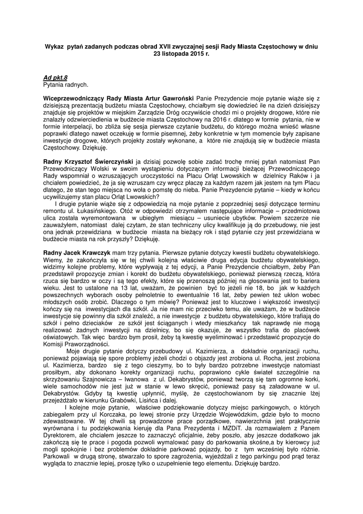 Wykaz pytań zadanych podczas obrad XVII zwyczajnej sesji Rady Miasta Częstochowy w dniu 23 listopada 2015 r. Ad pkt.8 Pytania radnych. Wiceprzewodniczący Rady Miasta Artur Gawroński Panie Prezydencie moje pytanie wiąże się z dzisiejszą prezentacją budżetu miasta Częstochowy, chciałbym się dowiedzieć ile na dzień dzisiejszy znajduje się projektów w miejskim Zarządzie Dróg oczywiście chodzi mi o projekty drogowe, które nie znalazły odzwierciedlenia w budżecie miasta Częstochowy na 2016 r. dlatego w formie pytania, nie w formie interpelacji, bo zbliża się sesja pierwsze czytanie budżetu, do którego można wnieść własne poprawki dlatego nawet oczekuję w formie pisemnej, żeby konkretnie w tym momencie były zapisane inwestycje drogowe, których projekty zostały wykonane, a które nie znajdują się w budżecie miasta Częstochowy. Dziękuję. Radny Krzysztof Świerczyński ja dzisiaj pozwolę sobie zadać trochę mniej pytań natomiast Pan Przewodniczący Wolski w swoim wystąpieniu dotyczącym informacji bieżącej Przewodniczącego Rady wspomniał o wzruszających uroczystości na Placu Orląt Lwowskich w dzielnicy Raków i ja chciałem powiedzieć, że ja się wzruszam czy wręcz płaczę za każdym razem jak jestem na tym Placu dlatego, że stan tego miejsca no woła o pomstę do nieba. Panie Prezydencie pytanie – kiedy w końcu ucywilizujemy stan placu Orląt Lwowskich? I drugie pytanie wiąże się z odpowiedzią na moje pytanie z poprzedniej sesji dotyczące terminu remontu ul. Łukasińskiego. Otóż w odpowiedzi otrzymałem następujące informacje – przedmiotowa ulica została wyremontowana w ubiegłym miesiącu – usuniecie ubytków. Powiem szczerze nie zauważyłem, natomiast dalej czytam, że stan techniczny ulicy kwalifikuje ją do przebudowy, nie jest ona jednak przewidziana w budżecie miasta na bieżący rok i stąd pytanie czy jest przewidziana w budżecie miasta na rok przyszły? Dziękuję. Radny Jacek Krawczyk mam trzy pytania. Pierwsze pytanie dotyczy kwestii budżetu obywatelskiego. Wiemy, że zakończyła się w tej chwili kolejna właściwie druga edycja budżetu obywatelskiego, widzimy kolejne problemy, które wypływają z tej edycji, a Panie Prezydencie chciałbym, żeby Pan przedstawił propozycje zmian i korekt do budżetu obywatelskiego, ponieważ pierwszą rzeczą, która rzuca się bardzo w oczy i są tego efekty, które się przenoszą później na głosowania jest to bariera wieku. Jest to ustalone na 13 lat, uważam, że powinien być to jeżeli nie 18, bo jak w każdych powszechnych wyborach osoby pełnoletnie to ewentualnie 16 lat, żeby pewien też ukłon wobec młodszych osób zrobić. Dlaczego o tym mówię? Ponieważ jest to kluczowe i większość inwestycji kończy się na inwestycjach dla szkół. Ja nie mam nic przeciwko temu, ale uważam, że w budżecie inwestycje się powinny dla szkół znaleźć, a nie inwestycje z budżetu obywatelskiego, które trafiają do szkół i pełno dzieciaków ze szkół jest ściąganych i wtedy mieszkańcy tak naprawdę nie mogą realizować żadnych inwestycji na dzielnicy, bo się okazuje, że wszystko trafia do placówek oświatowych. Tak więc bardzo bym prosił, żeby tą kwestię wyeliminować i przedstawić propozycje do Komisji Praworządności. Moje drugie pytanie dotyczy przebudowy ul. Kazimierza, a dokładnie organizacji ruchu, ponieważ pojawiają się spore problemy jeżeli chodzi o objazdy jest zrobiona ul. Rocha, jest zrobiona ul. Kazimierza, bardzo się z tego cieszymy, bo to były bardzo potrzebne inwestycje natomiast prosiłbym, aby dokonano korekty organizacji ruchu, poprawiono cykle świateł szczególnie na skrzyżowaniu Szajnowicza – Iwanowa z ul. Dekabrystów, ponieważ tworzą się tam ogromne korki, wiele samochodów nie jest już w stanie w lewo skręcić, ponieważ pasy są załadowane w ul. Dekabrystów. Gdyby tą kwestię upłynnić, myślę, że częstochowianom by się znacznie lżej przejeżdżało w kierunku Grabówki, Lisińca i dalej. I kolejne moje pytanie, właściwe podziękowanie dotyczy miejsc parkingowych, o których zabiegałem przy ul Korczaka, po lewej stronie przy Urzędzie Wojewódzkim, gdzie było to mocno zdewastowane. W tej chwili są prowadzone prace porządkowe, nawierzchnia jest praktycznie wyrównana i tu podziękowania kieruję dla Pana Prezydenta i MZDiT. Ja rozmawiałem z Panem Dyrektorem, ale chciałem jeszcze to zaznaczyć oficjalnie, żeby poszło, aby jeszcze dodatkowo jak zakończą się te prace i pogoda pozwoli wymalować pasy do parkowania skośne,a by kierowcy już mogli spokojnie i bez problemów dokładnie parkować pojazdy, bo z tym wcześniej było różnie. Parkowali w drugą stronę, stwarzało to spore zagrożenia, wyjeżdżali z tego parkingu pod prąd teraz wygląda to znacznie lepiej, proszę tylko o uzupełnienie tego elementu. Dziękuję bardzo. Radny Albert Kula Panie Prezydencie ja mam dwa pytania. Pierwsze pytanie jest takie czy istnieje jakiś przepis w mieszkalnictwie komunalnym, że w sytuacji gdy jakiekolwiek mieszkanie komunalne pozostaje bez lokatora czy też najemcy np. w przypadku śmierci czy rezygnacji dokonywany jest jego całkowity remont przez administrację osiedla na koszt spółki. Jeśli taki przepis istnieje to proszę o informacje od kiedy on obowiązuje. Drugie pytanie. Czy lokatorzy, którzy remontują swoje mieszkania na własny koszt mogą ubiegać się zwrot części poniesionych kosztów z tego tytułu. Drugie pytanie. Z rozmowach z mieszkańcami bardzo często spotykam się z pytaniami jakie stanowisko Prezydenta i miasta w sprawie przyjęcia imigrantów z Syrii zwłaszcza po tych ostatnich tragicznych wydarzeniach we Francji. Prosiłbym o króciutkie stanowisko w tym temacie. Dziękuję. Radna Jolanta Urbańska Panie Prezydencie ja z taką prośbą nietypową chciałabym, to nie jest mój pomysł tylko mieszkańców Częstochowy i bardzo bym prosiła czy mógłby Urz