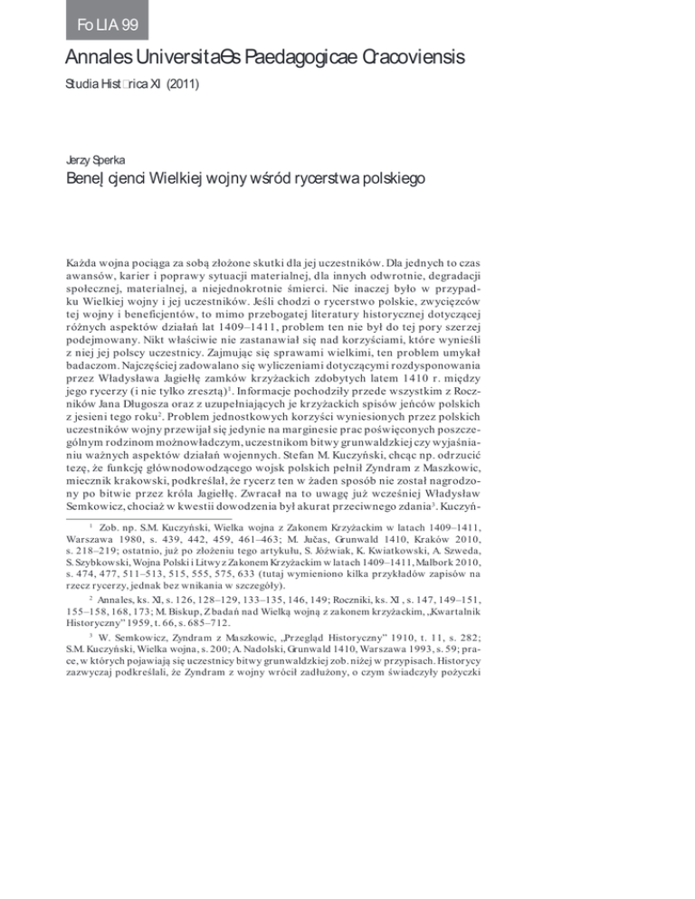 Fo LIA 99 Annales UniversitaƟs Paedagogicae Cracoviensis Studia Hist�rica XI (2011) Jerzy Sperka BeneĮ cjenci Wielkiej wojny wśród rycerstwa polskiego Każda wojna pociąga za sobą złożone skutki dla jej uczestników. Dla jednych to czas awansów, karier i poprawy sytuacji materialnej, dla innych odwrotnie, degradacji społecznej, materialnej, a niejednokrotnie śmierci. Nie inaczej było w przypadku Wielkiej wojny i jej uczestników. Jeśli chodzi o rycerstwo polskie, zwycięzców tej wojny i beneficjentów, to mimo przebogatej literatury historycznej dotyczącej różnych aspektów działań lat 1409–1411, problem ten nie był do tej pory szerzej podejmowany. Nikt właściwie nie zastanawiał się nad korzyściami, które wynieśli z niej jej polscy uczestnicy. Zajmując się sprawami wielkimi, ten problem umykał badaczom. Najczęściej zadowalano się wyliczeniami dotyczącymi rozdysponowania przez Władysława Jagiełłę zamków krzyżackich zdobytych latem 1410 r. między jego rycerzy (i nie tylko zresztą) 1 . Informacje pochodziły przede wszystkim z Roczników Jana Długosza oraz z uzupełniających je krzyżackich spisów jeńców polskich z jesieni tego roku 2 . Problem jednostkowych korzyści wyniesionych przez polskich uczestników wojny przewijał się jedynie na marginesie prac poświęconych poszczególnym rodzinom możnowładczym, uczestnikom bitwy grunwaldzkiej czy wyjaśnianiu ważnych aspektów działań wojennych. Stefan M. Kuczyński, chcąc np. odrzucić tezę, że funkcję głównodowodzącego wojsk polskich pełnił Zyndram z Maszkowic, miecznik krakowski, podkreślał, że rycerz ten w żaden sposób nie został nagrodzony po bitwie przez króla Jagiełłę. Zwracał na to uwagę już wcześniej Władysław Semkowicz, chociaż w kwestii dowodzenia był akurat przeciwnego zdania 3 . Kuczyń1 Zob. np. S.M. Kuczyński, Wielka wojna z Zakonem Krzyżackim w latach 1409–1411, Warszawa 1980, s. 439, 442, 459, 461–463; M. Jučas, Grunwald 1410, Kraków 2010, s. 218–219; ostatnio, już po złożeniu tego artykułu, S. Jóźwiak, K. Kwiatkowski, A. Szweda, S. Szybkowski, Wojna Polski i Litwy z Zakonem Krzyżackim w latach 1409–1411, Malbork 2010, s. 474, 477, 511–513, 515, 555, 575, 633 (tutaj wymieniono kilka przykładów zapisów na rzecz rycerzy, jednak bez wnikania w szczegóły). 2 Annales, ks. XI, s. 126, 128–129, 133–135, 146, 149; Roczniki, ks. XI , s. 147, 149–151, 155–158, 168, 173; M. Biskup, Z badań nad Wielką wojną z zakonem krzyżackim, „Kwartalnik Historyczny” 1959, t. 66, s. 685–712. 3 W. Semkowicz, Zyndram z Maszkowic, „Przegląd Historyczny” 1910, t. 11, s. 282; S.M. Kuczyński, Wielka wojna, s. 200; A. Nadolski, Grunwald 1410, Warszawa 1993, s. 59; prace, w których pojawiają się uczestnicy bitwy grunwaldzkiej zob. niżej w przypisach. Historycy zazwyczaj podkreślali, że Zyndram z wojny wrócił zadłużony, o czym świadczyły pożyczki BeneĮ cjenci Wielkiej wojny wśród rycerstwa polskiego [93] ski, szukając natomiast w przededniu wojny wśród rycerzy polskich zwolenników Zygmunta Luksemburskiego – sojusznika Krzyżaków – podawał przykład Mościca ze Stęszewa, kasztelana poznańskiego, który otrzymał w tym czasie nadania na Węgrzech, oraz Janusza z Tuliszkowa, kasztelana kaliskiego, który przyjął sporą gratyfikację pieniężną 4 . W związku z powyższym wydaje się zasadne podjęcie problemu polskich beneficjentów Wielkiej wojny, tych, którzy wynieśli z niej korzyści materialne, awansowe, polityczne czy prestiżowe. Zaznaczyć jednak trzeba, że poważnym ograniczeniem w tych badaniach jest niezbyt obfity materiał źródłowy, a zwłaszcza brak rachunków królewskich z interesującego nas okresu, czyli z lat 1409–1411. Zdani więc jesteśmy na inne źródła, w tym przede wszystkim na dyplomatyczne, rzadziej na sądowe oraz na kronikę Jana Długosza. Wśród dokumentów królewskich wystawionych w tym okresie zachowały się tylko dwa akty, które w treści jednoznacznie stwierdzały, że dokumentują łaskę królewską na rzecz uczestnika wojny za jego zasługi położone w tr akcie działań. W przypadku pozostałych dokumentów formularz nie odbiega od stosowanego powszechnie – wcześniej czy później – przy nadaniach królewskich za zasługi na rzecz monarchy5 . W tym przypadku możemy się tylko domyślać, choć ten domysł graniczy zazwyczaj z pewnością w związku z czasem ich wystawienia, że były nagrodą za zasługi położone w trakcie wojny. To powoduje, że nie brałem już pod uwagę zapisów po roku 1411, gdyż w ich przypadku nie ma żadnej pewności, aby można łączyć je z Wielką wojną. Oczywiście nie należy wykluczyć, że zapisy te kumulowały także zasługi z lat 1409–1411, jest to jednak nie do udowodnienia. Nadania wsi, dochodów zapisanych na królewszczyznach, pieniędzy wypłacanych z kasy królewskiej czy konkretnych dóbr materialnych (np. sukna, elementów uzbrojenia, wina), to oczywiście nie jedyne formy wdzięczności monarchy. Równie znacząca, a niejednokrotnie ważniejsza – i bardziej opłacalna – była nominacja lub awans na urząd ziemski, starościński, dworski lub centralny. Wyższy hierarchicznie urząd ziemski przynosił bowiem wyższe dochody, które z nim się wiązały, większy prestiż wśród szlachty lub elity rządzącej, większe możliwości działania, np. w radzie królewskiej. Natomiast objęcie urzędu starosty generalnego w danej ziemi – prócz oczywiście dochodów – dawało przede wszystkim realną władzę namiestniczą wykonywaną w imieniu monarchy, czyli administracyjną, policyjną, sądowniczą i wojskową. Zacznijmy zatem od beneficjentów politycznych Wielkiej wojny, ale najpierw z okresu poprzedzającego wyprawę pruską. Jest oczywistością, że każdy monarcha średniowieczny przed poważną batalią wojskową musiał dążyć do pociągnięcia za sobą w liczbie jak największ