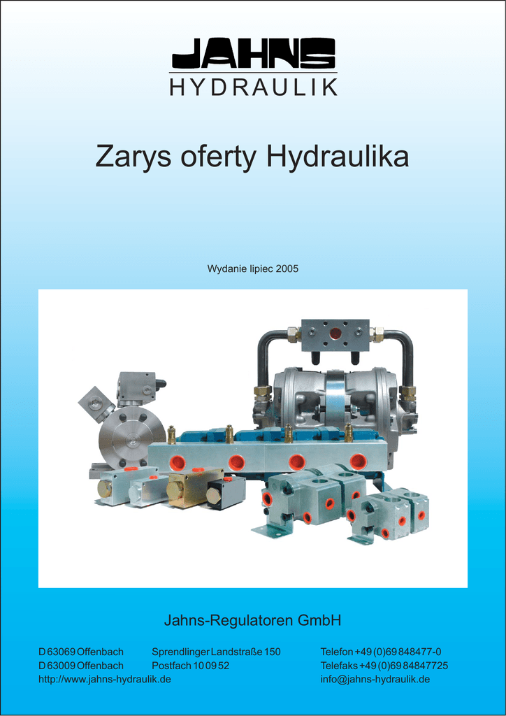 HYD RAU LI K Zarys oferty Hydraulika Wydanie lipiec 2005 Jahns-Regulatoren GmbH D 63069 Offenbach Sprendlinger Landstraße 150 D 63009 Offenbach Postfach 10 09 52 http://www.jahns-hydraulik.de Telefon +49 (0)69 848477-0 Telefaks +49 (0)69 84847725 [email protected] 1913 HYDRAULIK W 1905 roku firma Jahns Regulatoren została wpisana do rejestru handlowego miasta Offenbach jako fabryka specjalizująca się w produkcji regulatorów do maszyn ciężkich wszelkiego rodzaju. Autorami tego przedsięwzięcia byli inżynier Wilhelm Jahns, według którego patentów zbudowano pierwsze typy regulatorów, przedsiębiorca Carl Seidler i paru innych cichych wspólników. W 1905 roku firma Jahns Regulatoren została wpisana do rejestru handlowego miasta Offenbach jako fabryka specjalizująca się w produkcji regulatorów do maszyn ciężkich wszelkiego rodzaju. Autorami tego przedsięwzięcia byli inżynier Wilhelm Jahns, według którego patentów zbudowano pierwsze typy regulatorów, przedsiębiorca Carl Seidler i paru innych cichych wspólników. Od 1928 roku firma Jahns Regulatoren jest przedsiębiorstwem rodzinnym z ograniczoną odpowiedzialnością, należącym do rodziny Dapp/Sauerwein. Od tego momentu firma produkuje pompy osiowe wielotłoczkowe do pras i maszyn sterujących takich jak regulator turbin wodnych. W 1970 roku zaprzestano produkcji silników hydraulicznych wielotłokowych promieniowych, stosowanych jako napęd do maszyn ciężkich, manipulatorów kuźniczych, maszyn natryskujących gumę, jak również w budowie urządzeń. Jednocześnie zmieniono produkcję na maszyny NC w celu ograniczenia wciąż rosnących kosztów wynagrodzenia. Dzisiaj produkcja odbywa się na maszynach CNC o niskich luzach. Wszystkie produkty przechodzą testy na naszym stanowisku kontrolnym zanim zostaną wysłane do naszych stałych odbiorców. Od roku 1986 gamę produktów firmy Jahns uzupełniają towary handlowe z zakresu hydrauliki i techniki napędowej. Rozwój produktu jest uzgadniany razem z klientem. Jako przykład należy tu wspomnieć ofertę dzielników prądu i przepływomierzy, którą w obecnej postaci można określić jako niemal doskonałą. Do grona naszych klientów należą niemal wszystkie liczące się w Niemczech firmy hydrauliczne. 1992 Dokupienie produkcji i dystrybucji silników łopatkowych ATE (firma Alfred Teves/Frankfurt). W maju 2000 roku przejęcie od firmy ABG/Karlsruhe linii produkcyjnych pomp wirowych, głębinowych i mieszalników. Te produkty znajdują zastosowanie przede wszystkim w przemyśle chemicznym i technologii procesów przetwórczych. Nowa oferta produktu wraz ze starannym wykonaniem gwarantują naszemu przedsiębiorstwu maksymalne wykorzystanie możliwości produkcyjnych, co odpowiada filozofii firmowej Jahns Regulatoren: nie stawiamy na szybki wzrost, ale na kontynuację i jakość. Warunkiem naszego sukcesu jest szybkość w dostarczaniu oferty i zamówionych towarów. Dziś firma jest prowadzona w czwartym pokoleniu przez Christian Dapp. Seite 2 www.jahns-hydraulik.de Przekładnie planetarne JPSM Przekładnie współosiowe w 16 wielkościach, do 300.000 Nm. Przekładnie kątowe w 15 wielkościach, do 150.000 Nm Wyjście przekładni z wałem wielowypustowym, wpustowym, złączem rurowym nakładkowym lub tarczą skurczową. Przekładnie z prowadnicą nożną i wałem wpustowym. Dostępne są przekładnie jednowejściowe z wałem wpustowym do napędów pasowych, z hydraulicznie luzowanymi hamulcami ciernymi wielopłytkowymi, takimi jak części zamienne do wszystkich silników hydraulicznych i elektrycznych dostępnych w sprzedaży. Dostępne są następujące rodzaje napędów: piasty wielowypustowe, tarcze końcowe, kołnierze zrębu, zębniki, wały wielowypustowe i tarcze skurczowe. Pompy wielotłoczkowe osiowe TPV Regulowana pompa wielotłoczkowa osiowa dla zamkniętych obiegów. Dostępna w dwóch wielkościach jako pompa prosta lub tandemowa, każda o chłonności od 6,8 do 30 cm3/U. Ciúnienie robocze podczas pracy ciŕgůej 210 barów, ciúnienie szczytowe 350 barów. Uruchomienie poprzez przestawienie mechaniczne lub serwohydrauliczne poprzez cylinder (zależnie od siły na sterownicy), dostępna również opcja samoczynnego nastawiania na minimalną wydajność oraz wbudowanej pompy zasilającej. Agregaty hydrauliczne Sprzedajemy wyłącznie standardowe agregaty według schematów połączeń klienta z uwzględnieniem norm zakładowych lub według własnego projektu. Agregaty miniaturowe do zastosowania ruchomego. Cylindry hydrauliczne Niezawodne, mocne, o uniwersalnym zastosowaniu konstrukcje spawalniczo-wkrętkowe. Zastosowane metody uszczelnienia gwarantują optymalne uszczelnienie i pracę wolną od drgań ciernych. W ofercie znajdują się cylindry z łożyskiem wahliwym, przegubowym, widelcem i kołnierzem na dnie cylindra, wahliwym czopem walcowym lub kołnierzem na głowicy cylindra oraz łożyskiem wahliwym, przegubowym i głowicą kabla na tłoczysku. Dostępne są również cylindry mocowane na słupku, cylindry według rysunku klienta i cylindry do napędów wodnych. Napędy zębatkowe wahliwe 12 wielkości od 300Nm do 100.000Nm. Urządzenia do 300.000Nm możliwe na zamówienie. Wysokie dopuszczalne obciążenia promieniowe na wale wyjściowym, bezpośredni wał rurowy, kąt obrotu standardowo między 60 i 360º, większy kąt obrotu na zamówienie. Specjalne wykonanie dla wszelkich niestandardowych cieczy roboczych. www.jahns-hydraulik.de Seite 3 HYDRAULIK Tłokowe dzielniki prądu MKA i MKS Podwójne dzielniki w formie zaworu. Zawór dzielnika prądu funkcjonuje w obydwu kierunkach przepływu. Stosunek podziału w obrębie błędu współbieżności jest w znacznym stopniu niezależny od ciśnienia i lepkości medium. W 3 wielkościach o całkowitej strudze oleju między 2 i 150 l/min. Obudowa MKA wykonana jest z aluminium (ciśnienie szczytowe 210 barów), a MKS ze stali (ciśnienie szczytowe 350 barów). Zębate dzielniki prądu MTO