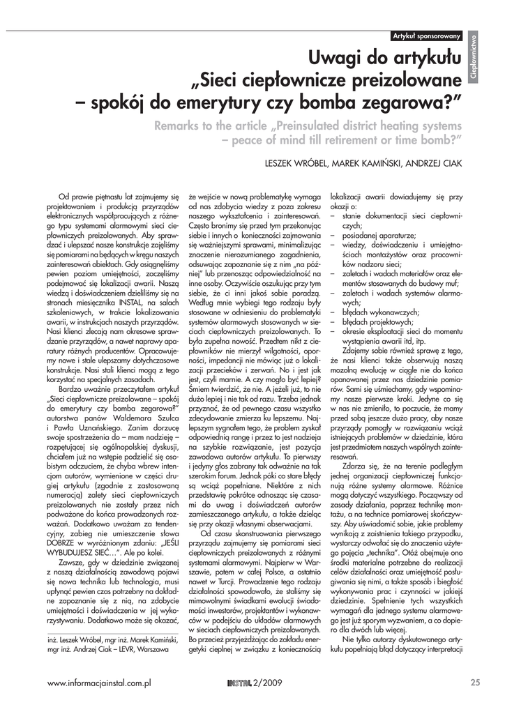 Uwagi do artykułu „Sieci ciepłownicze preizolowane – spokój do emerytury czy bomba zegarowa?” Ciepłownictwo Artykuł sponsorowany Remarks to the article „Preinsulated district heating systems – peace of mind till retirement or time bomb?” LESZEK WRÓBEL, MAREK KAMIŃSKI, ANDRZEJ CIAK Od prawie piętnastu lat zajmujemy się projektowaniem i produkcją przyrządów elektronicznych współpracujących z różnego typu systemami alarmowymi sieci ciepłowniczych preizolowanych. Aby sprawdzać i ulepszać nasze konstrukcje zajęliśmy się pomiarami na będących w kręgu naszych zainteresowań obiektach. Gdy osiągnęliśmy pewien poziom umiejętności, zaczęliśmy podejmować się lokalizacji awarii. Naszą wiedzą i doświadczeniem dzieliliśmy się na stronach miesięcznika INSTAL, na salach szkoleniowych, w trakcie lokalizowania awarii, w instrukcjach naszych przyrządów. Nasi klienci zlecają nam okresowe sprawdzanie przyrządów, a nawet naprawy aparatury różnych producentów. Opracowujemy nowe i stale ulepszamy dotychczasowe konstrukcje. Nasi stali klienci mogą z tego korzystać na specjalnych zasadach. Bardzo uważnie przeczytałem artykuł „Sieci ciepłownicze preizolowane – spokój do emerytury czy bomba zegarowa?” autorstwa panów Waldemara Szulca i Pawła Uznańskiego. Zanim dorzucę swoje spostrzeżenia do – mam nadzieję – rozpętującej się ogólnopolskiej dyskusji, chciałem już na wstępie podzielić się osobistym odczuciem, że chyba wbrew intencjom autorów, wymienione w części drugiej artykułu (zgodnie z zastosowaną numeracją) zalety sieci ciepłowniczych preizolowanych nie zostały przez nich podważone do końca prowadzonych rozważań. Dodatkowo uważam za tendencyjny, zabieg nie umieszczenie słowa DOBRZE w wyróżnionym zdaniu: „JEŚLI WYBUDUJESZ SIEĆ…”. Ale po kolei. Zawsze, gdy w dziedzinie związanej z naszą działalnością zawodową pojawi się nowa technika lub technologia, musi upłynąć pewien czas potrzebny na dokładne zapoznanie się z nią, na zdobycie umiejętności i doświadczenia w jej wykorzystywaniu. Dodatkowo może się okazać, inż. Leszek Wróbel, mgr inż. Marek Kamiński, mgr inż. Andrzej Ciak – LEVR, Warszawa www.informacjainstal.com.pl że wejście w nową problematykę wymaga od nas zdobycia wiedzy z poza zakresu naszego wykształcenia i zainteresowań. Często bronimy się przed tym przekonując siebie i innych o konieczności zajmowania się ważniejszymi sprawami, minimalizując znaczenie nierozumianego zagadnienia, odsuwając zapoznanie się z nim „na później” lub przenosząc odpowiedzialność na inne osoby. Oczywiście oszukując przy tym siebie, że ci inni jakoś sobie poradzą. Według mnie wybiegi tego rodzaju były stosowane w odniesieniu do problematyki systemów alarmowych stosowanych w sieciach ciepłowniczych preizolowanych. To była zupełna nowość. Przedtem nikt z ciepłowników nie mierzył wilgotności, oporności, impedancji nie mówiąc już o lokalizacji przecieków i zerwań. No i jest jak jest, czyli marnie. A czy mogło być lepiej? Śmiem twierdzić, że nie. A jeżeli już, to nie dużo lepiej i nie tak od razu. Trzeba jednak przyznać, że od pewnego czasu wszystko zdecydowanie zmierza ku lepszemu. Najlepszym sygnałem tego, że problem zyskał odpowiednią rangę i przez to jest nadzieja na szybkie rozwiązanie, jest pozycja zawodowa autorów artykułu. To pierwszy i jedyny głos zabrany tak odważnie na tak szerokim forum. Jednak póki co stare błędy są wciąż popełniane. Niektóre z nich przedstawię pokrótce odnosząc się czasami do uwag i doświadczeń autorów zamieszczanego artykułu, a także dzieląc się przy okazji własnymi obserwacjami. Od czasu skonstruowania pierwszego przyrządu zajmujemy się pomiarami sieci ciepłowniczych preizolowanych z różnymi systemami alarmowymi. Najpierw w Warszawie, potem w całej Polsce, a ostatnio nawet w Turcji. Prowadzenie tego rodzaju działalności spowodowało, że staliśmy się mimowolnymi świadkami ewolucji świadomości inwestorów, projektantów i wykonawców w podejściu do układów alarmowych w sieciach ciepłowniczych preizolowanych. Bo przecież przyjeżdżając do zakładu energetyki cieplnej w związku z koniecznością 2/2009 lokalizacji awarii dowiadujemy się przy okazji o: – stanie dokumentacji sieci ciepłowniczych; – posiadanej aparaturze; – wiedzy, doświadczeniu i umiejętnościach montażystów oraz pracowników nadzoru sieci; – zaletach i wadach materiałów oraz elementów stosowanych do budowy muf; – zaletach i wadach systemów alarmowych; – błędach wykonawczych; – błędach projektowych; – okresie eksploatacji sieci do momentu wystąpienia awarii itd, itp. Zdajemy sobie również sprawę z tego, że nasi klienci także obserwują naszą mozolną ewolucję w ciągle nie do końca opanowanej przez nas dziedzinie pomiarów. Sami się uśmiechamy, gdy wspominamy nasze pierwsze kroki. Jedyne co się w nas nie zmieniło, to poczucie, że mamy przed sobą jeszcze dużo pracy, aby nasze przyrządy pomogły w rozwiązaniu wciąż istniejących problemów w dziedzinie, która jest przedmiotem naszych wspólnych zainteresowań. Zdarza się, że na terenie podległym jednej organizacji ciepłowniczej funkcjonują różne systemy alarmowe. Różnice mogą dotyczyć wszystkiego. Począwszy od zasady działania, poprzez technikę montażu, a na technice pomiarowej skończywszy. Aby uświadomić sobie, jakie problemy wynikają z zaistnienia takiego przypadku, wystarczy odwołać się do znaczenia użytego pojęcia „technika”. Otóż obejmuje ono środki materialne potrzebne do realizacji celów działalności oraz umiejętność posługiwania się nimi, a także sposób i biegłość wykonywania prac i czynności w jakiejś dziedzinie. Spełnienie tych wszystkich wymagań dla jednego systemu alarmowego jest już sporym wyzwaniem, a co dopiero dla dwóch lub więcej. 