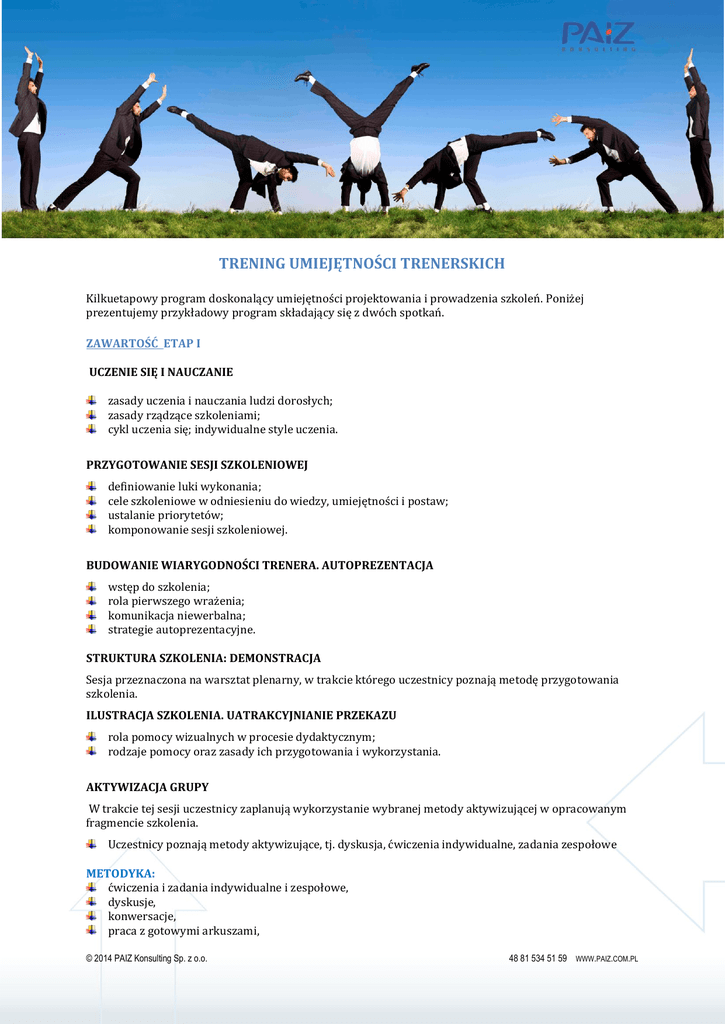 TRENING UMIEJĘTNOŚCI TRENERSKICH Kilkuetapowy program doskonalący umiejętności projektowania i prowadzenia szkoleń. Poniżej prezentujemy przykładowy program składający się z dwóch spotkań. ZAWARTOŚĆ ETAP I UCZENIE SIĘ I NAUCZANIE zasady uczenia i nauczania ludzi dorosłych; zasady rządzące szkoleniami; cykl uczenia się; indywidualne style uczenia. PRZYGOTOWANIE SESJI SZKOLENIOWEJ definiowanie luki wykonania; cele szkoleniowe w odniesieniu do wiedzy, umiejętności i postaw; ustalanie priorytetów; komponowanie sesji szkoleniowej. BUDOWANIE WIARYGODNOŚCI TRENERA. AUTOPREZENTACJA wstęp do szkolenia; rola pierwszego wrażenia; komunikacja niewerbalna; strategie autoprezentacyjne. STRUKTURA SZKOLENIA: DEMONSTRACJA Sesja przeznaczona na warsztat plenarny, w trakcie którego uczestnicy poznają metodę przygotowania szkolenia. ILUSTRACJA SZKOLENIA. UATRAKCYJNIANIE PRZEKAZU rola pomocy wizualnych w procesie dydaktycznym; rodzaje pomocy oraz zasady ich przygotowania i wykorzystania. AKTYWIZACJA GRUPY W trakcie tej sesji uczestnicy zaplanują wykorzystanie wybranej metody aktywizującej w opracowanym fragmencie szkolenia. Uczestnicy poznają metody aktywizujące, tj. dyskusja, ćwiczenia indywidualne, zadania zespołowe METODYKA: ćwiczenia i zadania indywidualne i zespołowe, dyskusje, konwersacje, praca z gotowymi arkuszami, © 2014 PAIZ Konsulting Sp. z o.o. 48 81 534 51 59 WWW.PAIZ.COM.PL praca ze scenariuszami, praca z planerami, warsztaty - wypracowywanie algorytmów postępowania do sytuacji typowych (pytania, argumentacja) odgrywanie ról z nagrywaniem scenek kamerą video, studia przypadków, coaching grupowy, wypracowywanie alternatywnych narzędzi i modeli zachowań do wykorzystania w sytuacjach trudnych, ćwiczenia i zadania doskonalące wiedzę i umiejętności, których zasadniczym celem jest wpływanie na postawy uczestników. ZAWARTOŚĆ ETAP II II cześć zajęć przeznaczona będzie na poprowadzenie przez uczestników samodzielnie opracowanych fragmentów szkolenia. W sesji wykorzystany będzie video-coaching. Uczestnicy otrzymają informacje zwrotne dotyczące indywidualnego stylu prowadzenia zajęć. 2