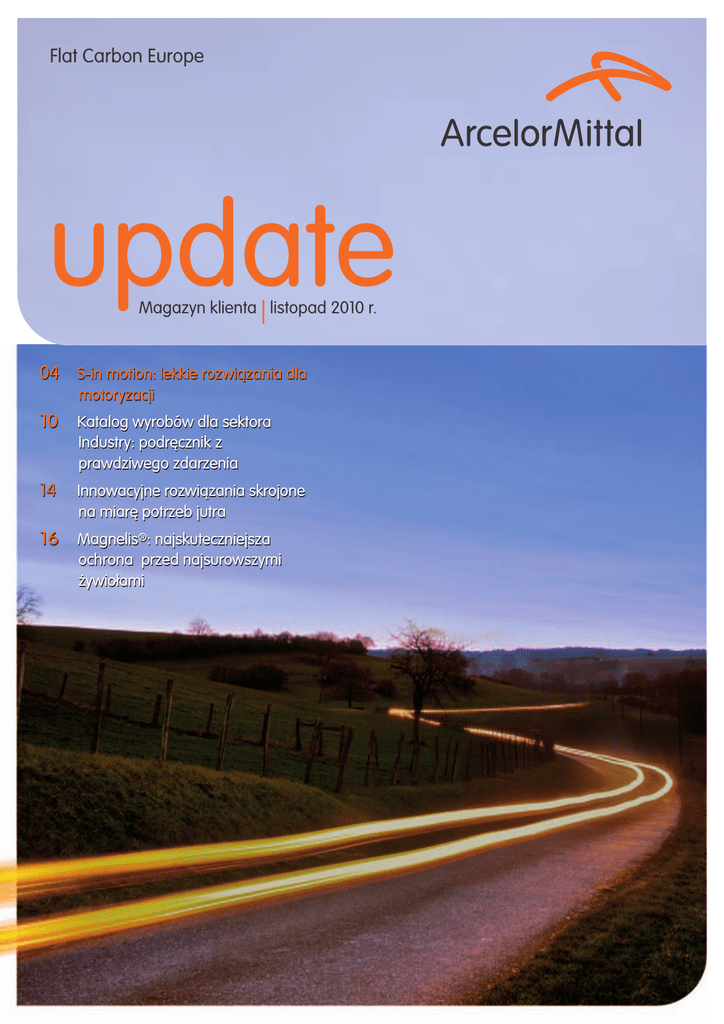 Flat Carbon Europe update Magazyn klienta | listopad 2010 r. 04 S-in motion: lekkie rozwiązania dla motoryzacji 10 Katalog wyrobów dla sektora Industry: podręcznik z prawdziwego zdarzenia 14 Innowacyjne rozwiązania skrojone na miarę potrzeb jutra 16 Magnelis®: najskuteczniejsza ochrona przed najsurowszymi żywiołami Spis treści 08 Optymalizacja wykorzystania stali elektrotechnicznych w transformatorach 10 Podręcznik z prawdziwego zdarzenia Katalog naszych wyrobów wkrótce na Państwa biurkach! 11 Cel: poprawa działań 14 Innowacyjne rozwiązania skrojone na miarę potrzeb jutra 18 Modyfikacja systemu obsługi klienta 20 „Zrozumienie potrzeb klienta to pierwszy krok ku rozwiązaniu problemu” 22 Puszki pełne świeżej ambicji „Wirtualna” jednostka biznesowa Packaging dopracowuje swoją strategię. 24 Od kręgu do nabrzeża 04 W październiku 2010 r. firma ArcelorMittal zaprezentowała S-in motion, nową koncepcję opracowaną z myślą o producentach samochodów, którzy chcą tworzyć lżejsze, bezpieczniejsze i bardziej przyjazne dla środowiska pojazdy XXI w. S-in motion jest świadectwem wielkiej wagi, jaką firma ArcelorMittal przykłada do współpracy z sektorem motoryzacyjnym; to katalog nowoczesnych rozwiązań, jakie już dzisiaj można zastosować w procesie produkcji samochodów. 06 Drzwi otwarte do Już w niedalekiej przyszłości producentom samochodów, którzy nie znajdą sposobów na znaczne obniżenie poziomu CO2 emitowanego przez ich pojazdy, grozić będą kary finansowe. Jako największy dostawca stali dla sektora samochodowego, firma ArcelorMittal podjęła szeroko zakrojone badania nad zastosowaniem nowych gatunków stali dla obniżenia ciężaru drzwi pojazdów. Okładka Zdjęcia S-in motion: lekkie rozwiązania dla motoryzacji - ©Mathieu Noel ArcelorMittal oraz: Wszelkie prawa zastrzeżone. Żadna część niniejszej publikacji nie może być w jakiejkolwiek formie i jakąkolwiek metodą powielana bez pisemnej zgody wydawcy. Pomimo podjęcia należytych środków dla zapewnienia ścisłości informacji zawartych w niniejszej publikacji, firma ArcelorMittal nie ponosi odpowiedzialności za ewentualne błędy bądź braki. str. 3: str. 8-9: str. 10-15-1819-20-21: str. 12-13: str. 16-17: str. 24: Układ graficzny Geers Offset nv Update l Magazyn klienta l listopad 2010 r. Luksemburski pawilon na Wystawie Światowej: wizytówka kortenowej stali Indaten® firmy ArcelorMittal Rekordowa ilość zwiedzających odwiedziła wystawę Expo otwartą w maju 2010 r. w Szanghaju w Chinach. Jednym z najbardziej niezwykłych budynków na terenach wystawienniczych obejmujących obszar 5,3 km2 jest narodowy pawilon Luksemburga, dzieło architekta Françoisa Valentiny’ego. Za sprawą wykorzystania stali kortenowej, pomiędzy gościem Expo a natura nawiązuje się intensywny dialog... 16 oszczędności Copyright 2 12 S-in motion: lekkie rozwiązania dla motoryzacji Magnelis®: najskuteczniejsza ochrona przed najsurowszymi żywiołami Od lat firma ArcelorMittal celuje w opracowywaniu metalicznych powłok łączących szeroki zakres zastosowań ze znakomitymi właściwościami tak pod kątem technologicznym, jak i środowiskowym czy ekologicznym. Ostatnia innowacja firmy, metaliczna powłoka Magnelis®, zapewnia optymalną i długotrwała ochronę powierzchni przed zużyciem. Redakcja Mathieu Noel Philippe Vandenameele, Eozen, Siemens Jeroen Op de Beeck Pierre Engel breedoo.com Tubosider ArcelorMittal Projects ArcelorMittal Flat Carbon Europe S.A. Vanessa Vanhalst 19, avenue de la Liberté L-2930 Luxembourg www.arcelormittal.com/fce Redaktor naczelny Dieter Vandenhende Artykuł wstępny Począwszy od bieżącego numeru, w każdym kolejnym wydaniu magazynu Update znajdzie się artykuł wstępny autorstwa innej osoby, z której perspektywy spojrzymy na firmę ArcelorMittal, segment Flat Carbon Europe i przemysł stalowy. W ciągłym ruchu Brian Aranha kieruje działem Automotive i pełni funkcję Global Chief Marketing Officer firmy ArcelorMittal Zmian nie da się powstrzymać! Firma ArcelorMittal świadoma faktu, że gałęzie przemysłu wykorzystujące stal funkcjonują w stale zmieniającym się otoczeniu technicznym, prawnym i ekonomicznym, nieustannie adaptuje swe rozwiązania i usługi pod kątem przyszłych wymagań jej klientów. Ciągłym zmianom ulegają np. normy regulujące funkcjonowanie przemysłu motoryzacyjnego na całym świecie. Globalne wyzwania stojące przed tą branżą to kwestie związane ze środowiskiem, bezpieczeństwem oraz odpornością na zderzenia. Wyjątkowa pozycja firmy ArcelorMittal na światowych rynkach, jej możliwości produkcyjne i przemysłowy know-how, umożliwiają nam wspieranie firm z sektora motoryzacyjnego w konfrontacji z tymi wyzwaniami. Firma ArcelorMittal dostarcza 21% stali wykorzystywanej przez branżę motoryzacyjną. Nasze wysiłki naukowo-badawcze podejmowane w ciągu ostatnich 15 lat odzwierciedlają problemy z jakimi mają do czynienia działy badawczo-rozwojowe koncernów samochodowych, a są to przede wszystkim kwestie związane z bezpieczeństwem i ochroną środowiska. Z naszej strony zaowocowało to najobszerniejszą na całym świecie ofertą wyrobów dla przemysłu motoryzacyjnego. Obejmuje ona wyroby płaskie o pełnym zakresie wytrzymałości, jak również bardziej zaawansowane produkty, takie jak spawane laserowo wykroje i rury coraz szerzej wykorzystywane w projektowaniu pojazdów. Ofertę naszych wyrobów uzupełnia stal nierdzewna i wyroby długie przeznaczone do określonych zastosowań w przemyśle samochodowym. Nie koncentrujemy się jednak tylko na opracowywaniu kolejnych wyrobów. Firma ArcelorMittal oferuje bowiem również innowacyjne rozwiązania całościowe. Obejmują one nie tylko wyroby, ale i technologie produkcji, umożliwiające wdrażanie naszych wyrobów w zakładach produkcyjnych samych klientów. Dla przykładu, segment Automotive współpracuje z producentami samochodów na zas