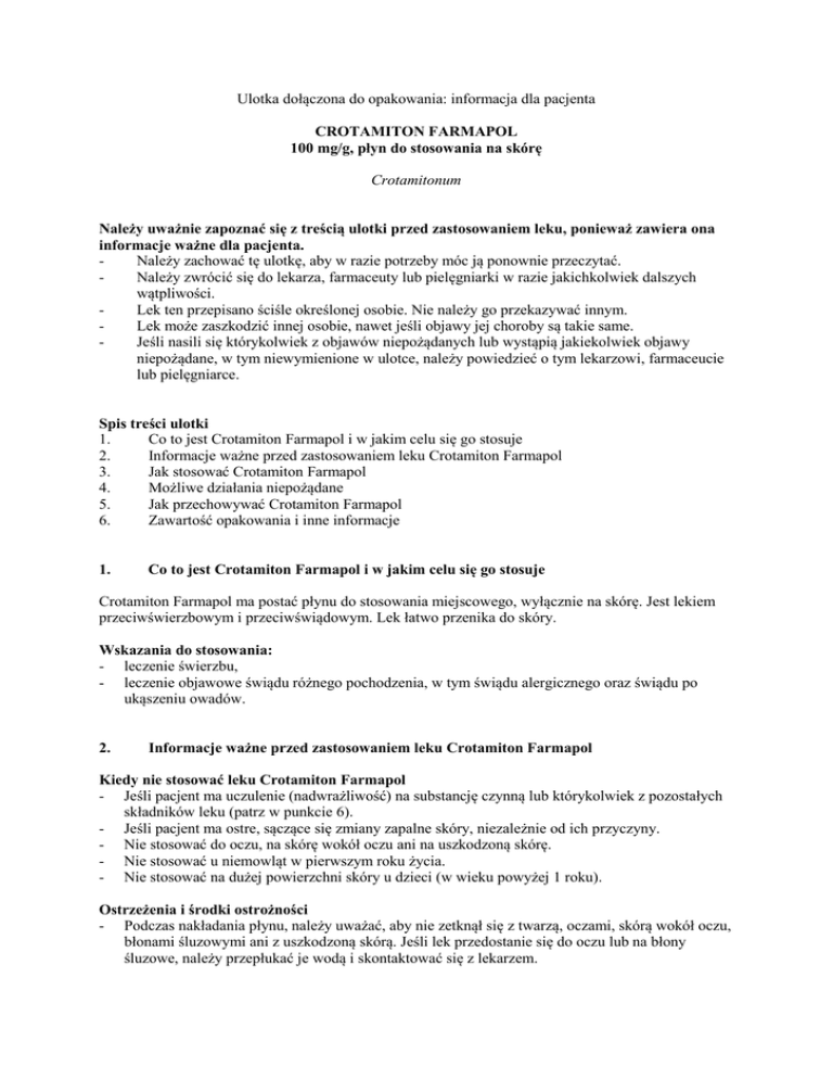 Ulotka dołączona do opakowania: informacja dla pacjenta CROTAMITON FARMAPOL 100 mg/g, płyn do stosowania na skórę Crotamitonum Należy uważnie zapoznać się z treścią ulotki przed zastosowaniem leku, ponieważ zawiera ona informacje ważne dla pacjenta. Należy zachować tę ulotkę, aby w razie potrzeby móc ją ponownie przeczytać. Należy zwrócić się do lekarza, farmaceuty lub pielęgniarki w razie jakichkolwiek dalszych wątpliwości. Lek ten przepisano ściśle określonej osobie. Nie należy go przekazywać innym. Lek może zaszkodzić innej osobie, nawet jeśli objawy jej choroby są takie same. Jeśli nasili się którykolwiek z objawów niepożądanych lub wystąpią jakiekolwiek objawy niepożądane, w tym niewymienione w ulotce, należy powiedzieć o tym lekarzowi, farmaceucie lub pielęgniarce. Spis treści ulotki 1. Co to jest Crotamiton Farmapol i w jakim celu się go stosuje 2. Informacje ważne przed zastosowaniem leku Crotamiton Farmapol 3. Jak stosować Crotamiton Farmapol 4. Możliwe działania niepożądane 5. Jak przechowywać Crotamiton Farmapol 6. Zawartość opakowania i inne informacje 1. Co to jest Crotamiton Farmapol i w jakim celu się go stosuje Crotamiton Farmapol ma postać płynu do stosowania miejscowego, wyłącznie na skórę. Jest lekiem przeciwświerzbowym i przeciwświądowym. Lek łatwo przenika do skóry. Wskazania do stosowania: - leczenie świerzbu, - leczenie objawowe świądu różnego pochodzenia, w tym świądu alergicznego oraz świądu po ukąszeniu owadów. 2. Informacje ważne przed zastosowaniem leku Crotamiton Farmapol Kiedy nie stosować leku Crotamiton Farmapol - Jeśli pacjent ma uczulenie (nadwrażliwość) na substancję czynną lub którykolwiek z pozostałych składników leku (patrz w punkcie 6). - Jeśli pacjent ma ostre, sączące się zmiany zapalne skóry, niezależnie od ich przyczyny. - Nie stosować do oczu, na skórę wokół oczu ani na uszkodzoną skórę. - Nie stosować u niemowląt w pierwszym roku życia. - Nie stosować na dużej powierzchni skóry u dzieci (w wieku powyżej 1 roku). Ostrzeżenia i środki ostrożności - Podczas nakładania płynu, należy uważać, aby nie zetknął się z twarzą, oczami, skórą wokół oczu, błonami śluzowymi ani z uszkodzoną skórą. Jeśli lek przedostanie się do oczu lub na błony śluzowe, należy przepłukać je wodą i skontaktować się z lekarzem. - Lek stosować ostrożnie w miejscach szczególnie wrażliwych, np. w okolicy pach i narządów płciowych. Jeśli po pierwszym zastosowaniu leku wystąpiło podrażnienie, nie należy go dalej stosować. Jeśli objawy świądu utrzymują się lub wystąpił świąd w okolicy narządów płciowych, należy skontaktować się z lekarzem. Inne leki i Crotamiton Farmapol Należy powiedzieć lekarzowi lub farmaceucie o wszystkich lekach przyjmowanych obecnie lub ostatnio, a także o lekach, które pacjent planuje stosować. Nie są znane oddziaływania leku Crotamiton Farmapol z innymi lekami. Ciąża, karmienie piersią i wpływ na płodność W ciąży i w okresie karmienia piersią lub gdy istnieje podejrzenie, że kobieta jest w ciąży, lub gdy planuje ciążę, przed zastosowaniem tego leku należy poradzić się lekarza lub farmaceuty. Nie wykonano stosownych badań dotyczących bezpieczeństwa stosowania leku w okresie ciąży i karmienia piersią. Nie wiadomo, czy lek przenika do mleka matki. Prowadzenie pojazdów i obsługiwanie maszyn Lek stosowany zgodnie z zaleceniami nie wpływa na zdolność kierowania pojazdami mechanicznymi lub obsługiwania maszyn oraz sprawność psychofizyczną. 3. Jak stosować Crotamiton Farmapol Ten lek należy zawsze stosować zgodnie z zaleceniami lekarza lub farmaceuty. W razie wątpliwości należy zwrócić się do lekarza lub farmaceuty. Crotamiton Farmapol jest przeznaczony wyłącznie do stosowania na skórę. Zalecane dawkowanie Leczenie objawowe świądu Płyn należy wcierać w swędzące miejsce na skórze. Lek należy stosować od 2 do maksymalnie 3 razy na dobę. Dolegliwości zwykle ustępują po 6-10 godzinach od zastosowania leku. Po zastosowaniu leku należy dokładnie umyć ręce. Podczas stosowania leku Crotamiton Farmapol należy uważać, aby nie przedostał się on do oczu i na błony śluzowe. Jeśli do tego dojdzie, należy przepłukać wodą i skontaktować się z lekarzem. Leczenie świerzbu Przed zastosowaniem leku zaleca się wykąpać i osuszyć skórę. Płyn należy wcierać w skórę omijając twarz i owłosioną skórę głowy. Lek stosować raz na dobę, najlepiej na noc, przez 3 do 5 dni. Podczas leczenia świerzbu należy postępować zgodnie z przedstawionymi niżej szczegółowymi zaleceniami. Uważać, aby płyn nie przedostał się do oczu ani na błony śluzowe. Jeśli do tego dojdzie, należy oczy lub błony śluzowe przepłukać wodą i skontaktować się z lekarzem. Po każdorazowym zastosowaniu leku, należy dokładnie umyć ręce. Podczas leczenia świerzbu zaleca się kąpiel dopiero po 2-3 dniach od ostatniego smarowania. W tym czasie należy dbać o podstawową higienę osobistą, tj. codzienną zmianę bielizny i mycie części ciała, które nie były smarowane. 2 Używane podczas choroby ręczniki, pościel, bieliznę i odzież należy wyprać w wysokiej temperaturze i wyprasować (aby skutecznie usunąć źródło zakażenia); rzeczy te należy przechowywać oddzielnie i nie używać przez co najmniej 2 tygodnie. Leczeniem profilaktycznym powinni zostać objęci domownicy i osoby z otoczenia chorego, nawet jeśli nie mają objawów zakażenia. Stosowanie u dzieci i młodzieży Leku Crotamiton Farmapol nie należy stosować u niemowląt w pierwszym roku życia. U dzieci (w wieku powyżej 1 roku) wystarczy jednorazowe zastosowanie leku. Zastosowanie większej niż zalecana dawki leku Crotamiton Farmapol W razie zastosowania większej niż zalecana dawki leku, należy natychmiast skontaktować się z lekarzem. Mogą wyst
